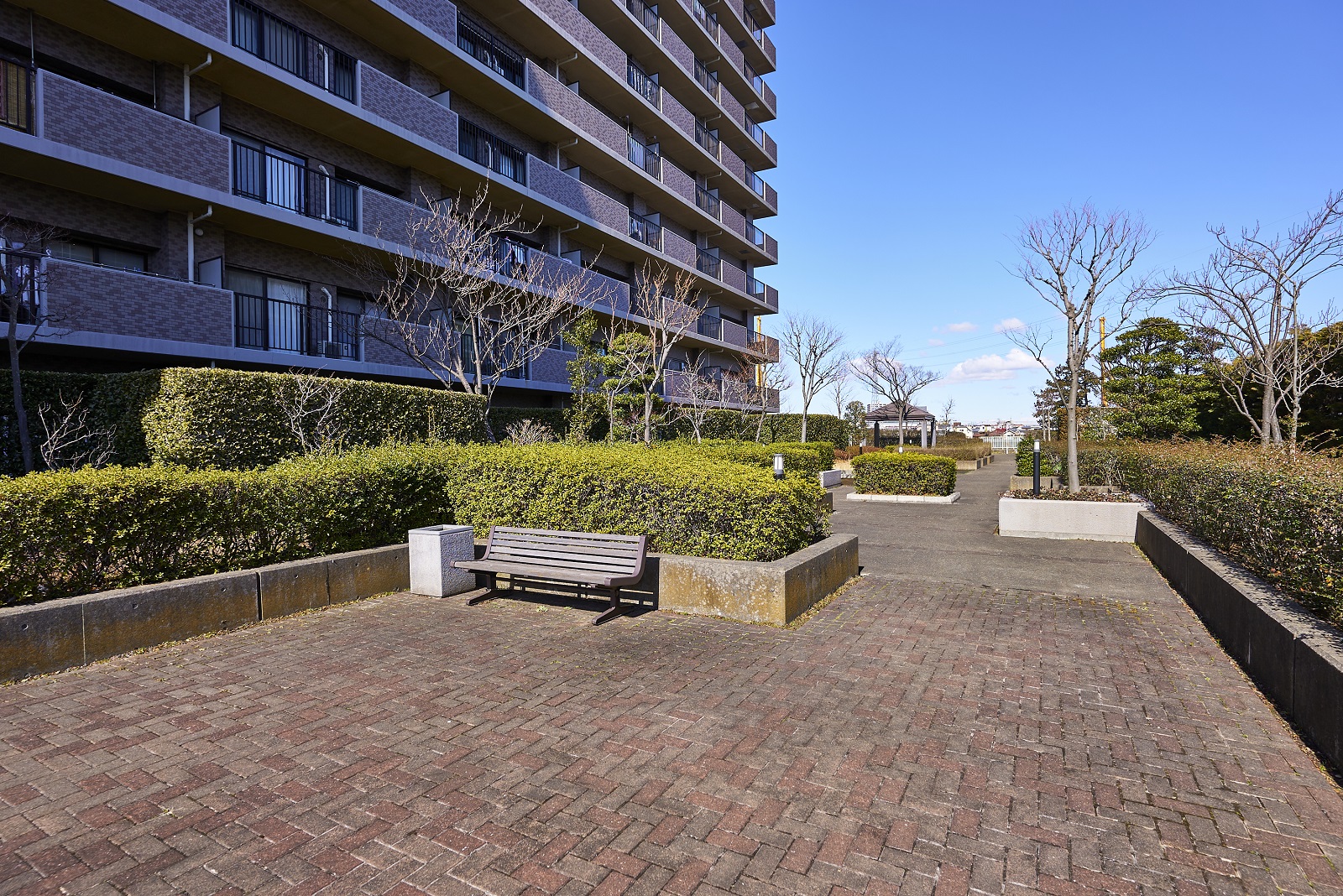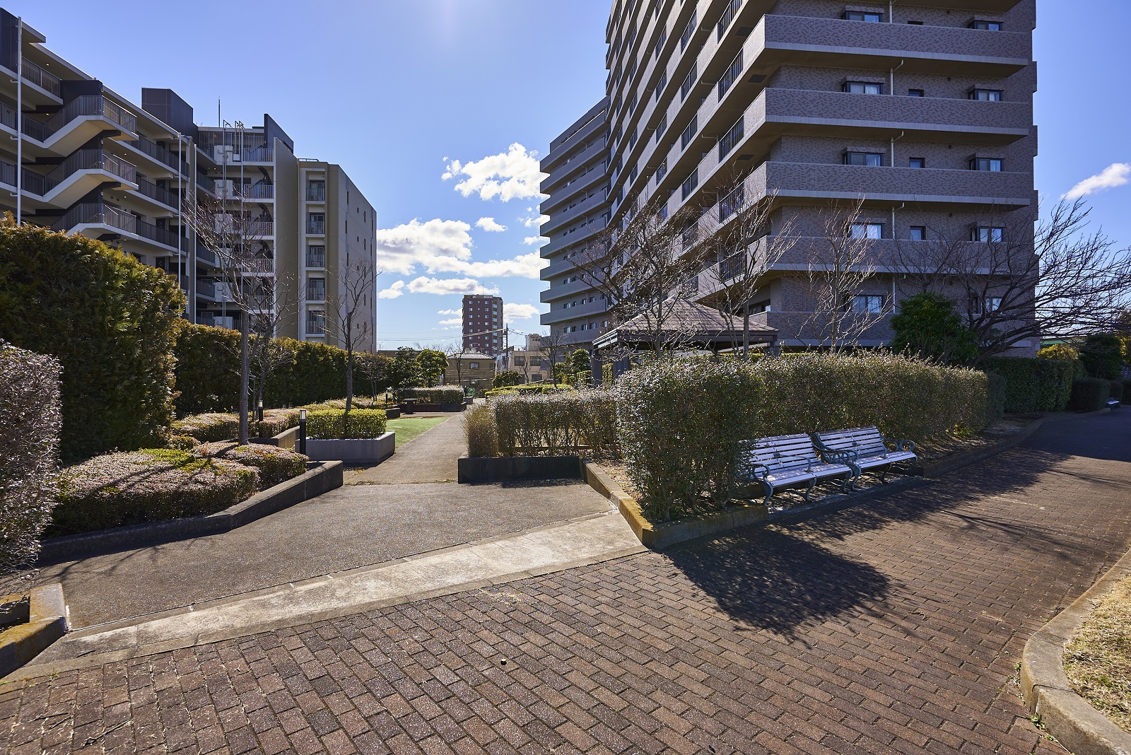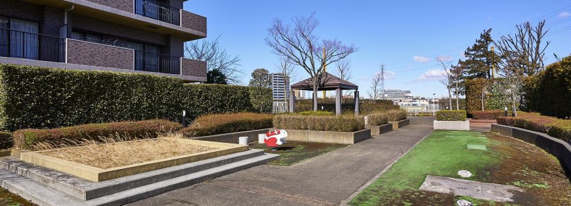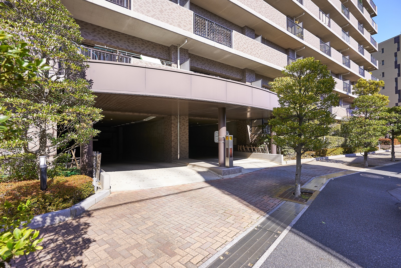 2本の円柱と大型庇が美しいシルエットを描く、風格あるメインエントランス。建物内に入ると、天然石を贅沢に敷きつめた優雅な風除室が広がります。木目調の両開きドアの奥には、約30畳の広々とした集会室が設置されており、ミニキッチンやトイレを備え、住民同士の良好なコミュニティを育む多目的スペースとして利用可能です。敷地の東側には、緑と陽光に満たされた広場「コミュニティ・プラザ」やプレイロットも設けられています。