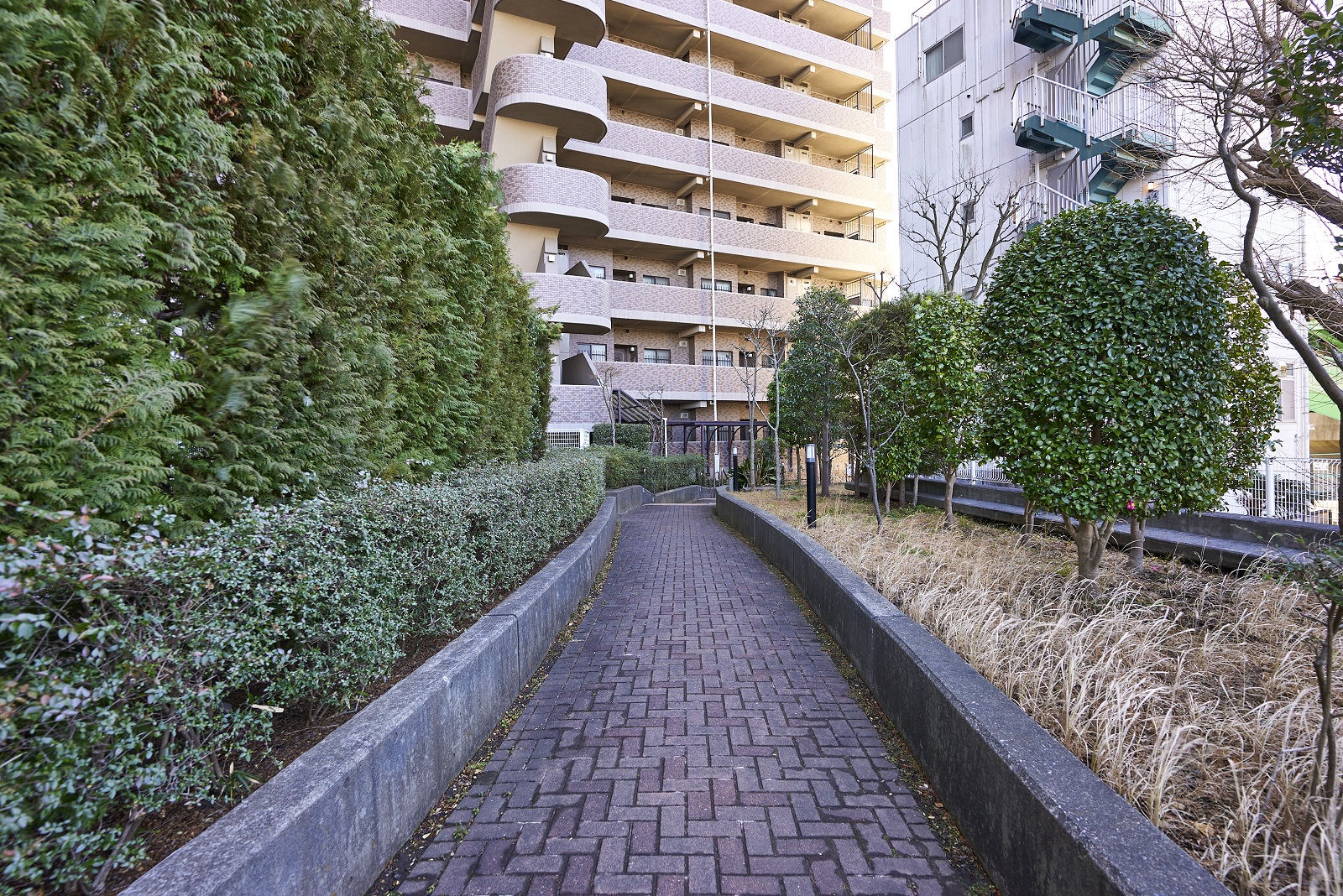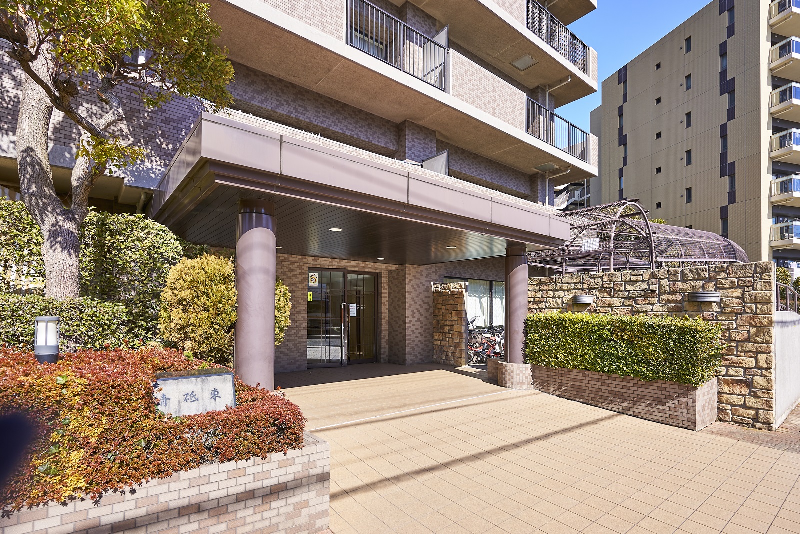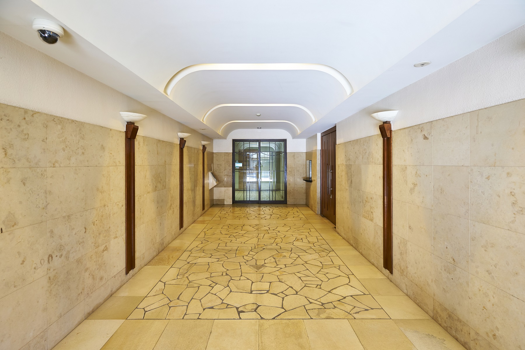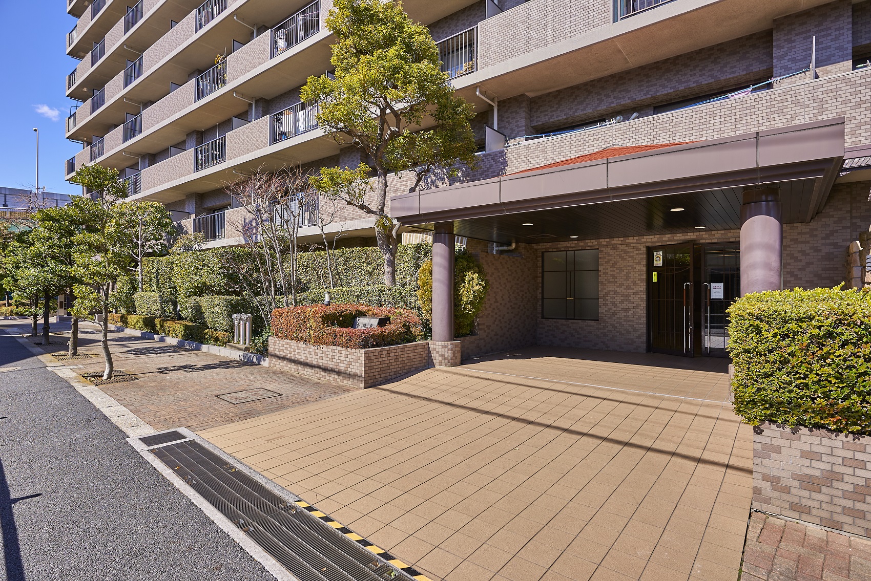 2本の円柱と大型庇が美しいシルエットを描く、風格あるメインエントランス。建物内に入ると、天然石を贅沢に敷きつめた優雅な風除室が広がります。木目調の両開きドアの奥には、約30畳の広々とした集会室が設置されており、ミニキッチンやトイレを備え、住民同士の良好なコミュニティを育む多目的スペースとして利用可能です。敷地の東側には、緑と陽光に満たされた広場「コミュニティ・プラザ」やプレイロットも設けられています。