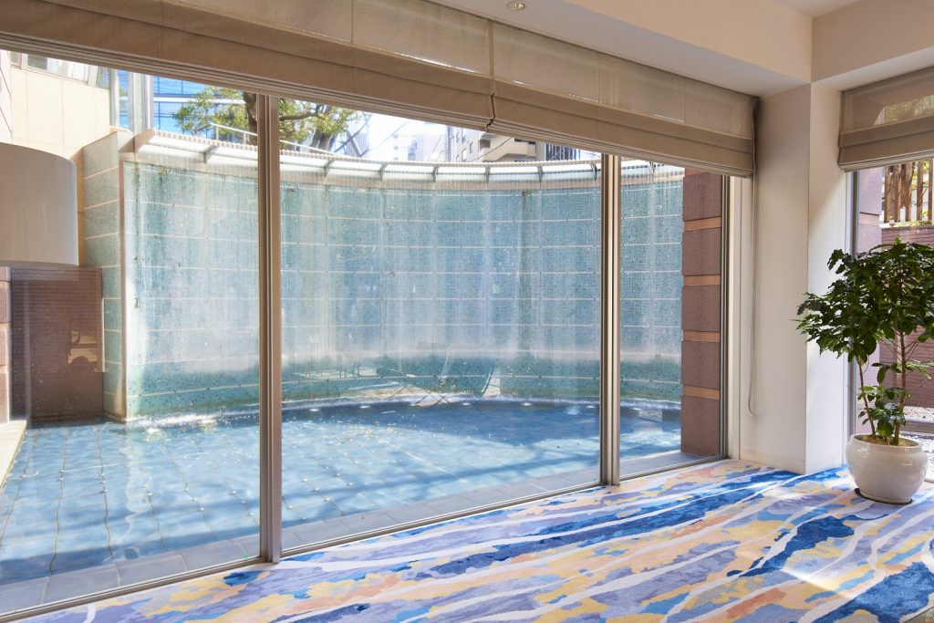ガラスの川床を落ちる千条の滝は背後から陽光を受けて光のドレープのように輝き、そのゆらめきを室内に映します。