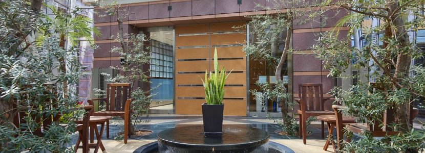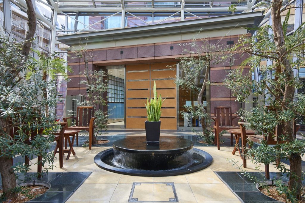ガラスのアトリウム、「ウィンターガーデン」。約5,000㎡の広大な庭園を象徴する高さ10mの巨大なガラスばりのアトリウムです。シンボルツリーのケヤキの樹形をデザインしたアトリウムのなかには、水盤が置かれ、爽やかな水音を響かせます。