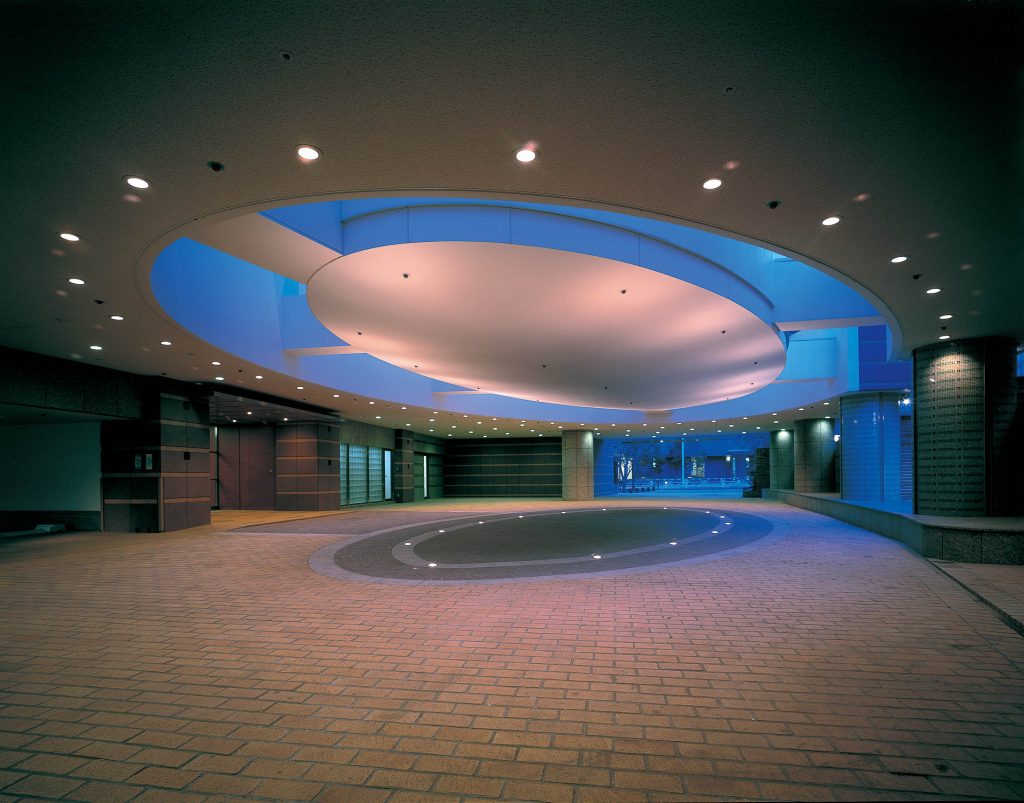 コクーン(繭)をデザインモチーフにした車寄せ。楕円状の吊り天井の周囲からは、昼は自然光が降り注ぎ、夜は照明が温かく包み、帰ってきたひとをやさしく迎えます。