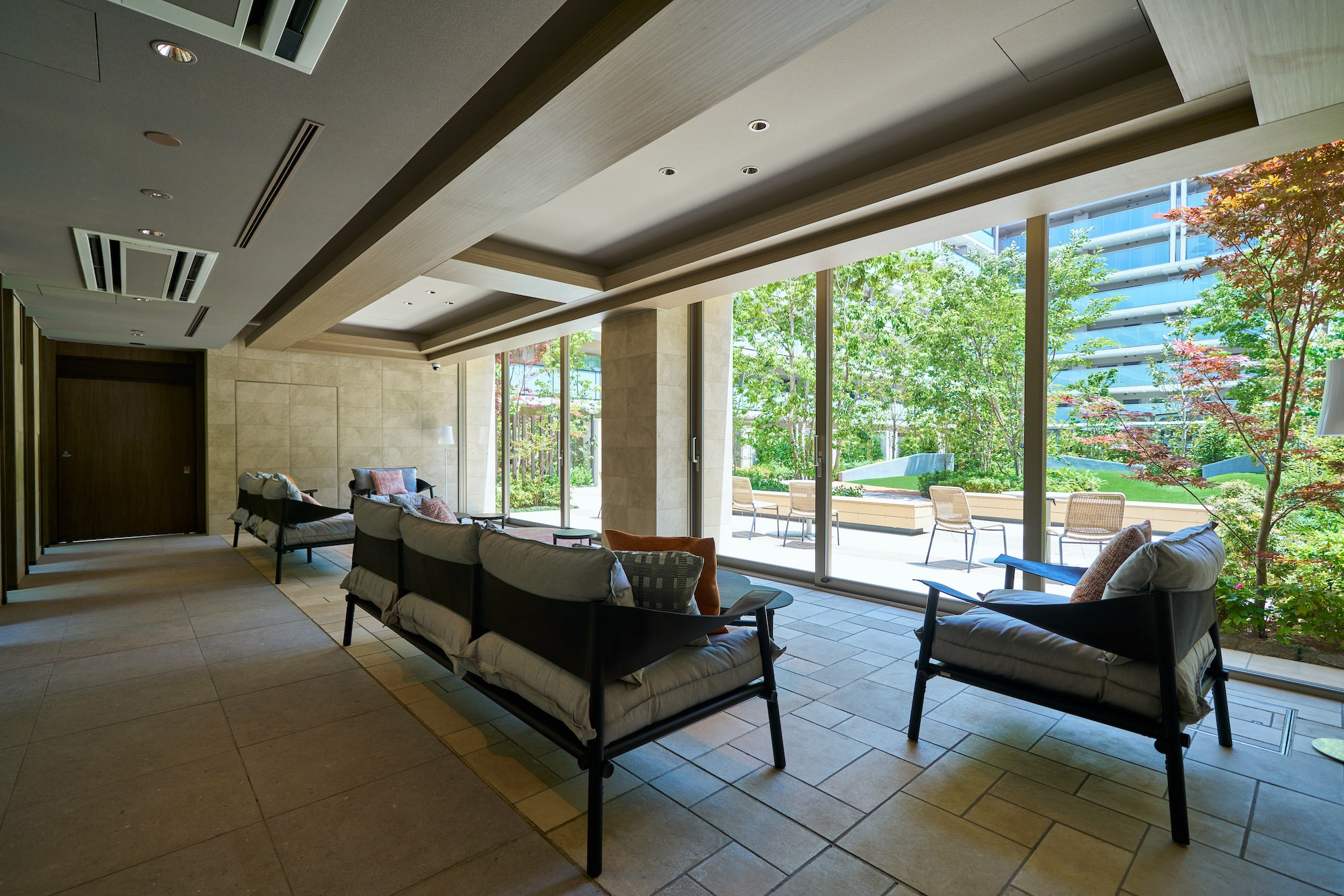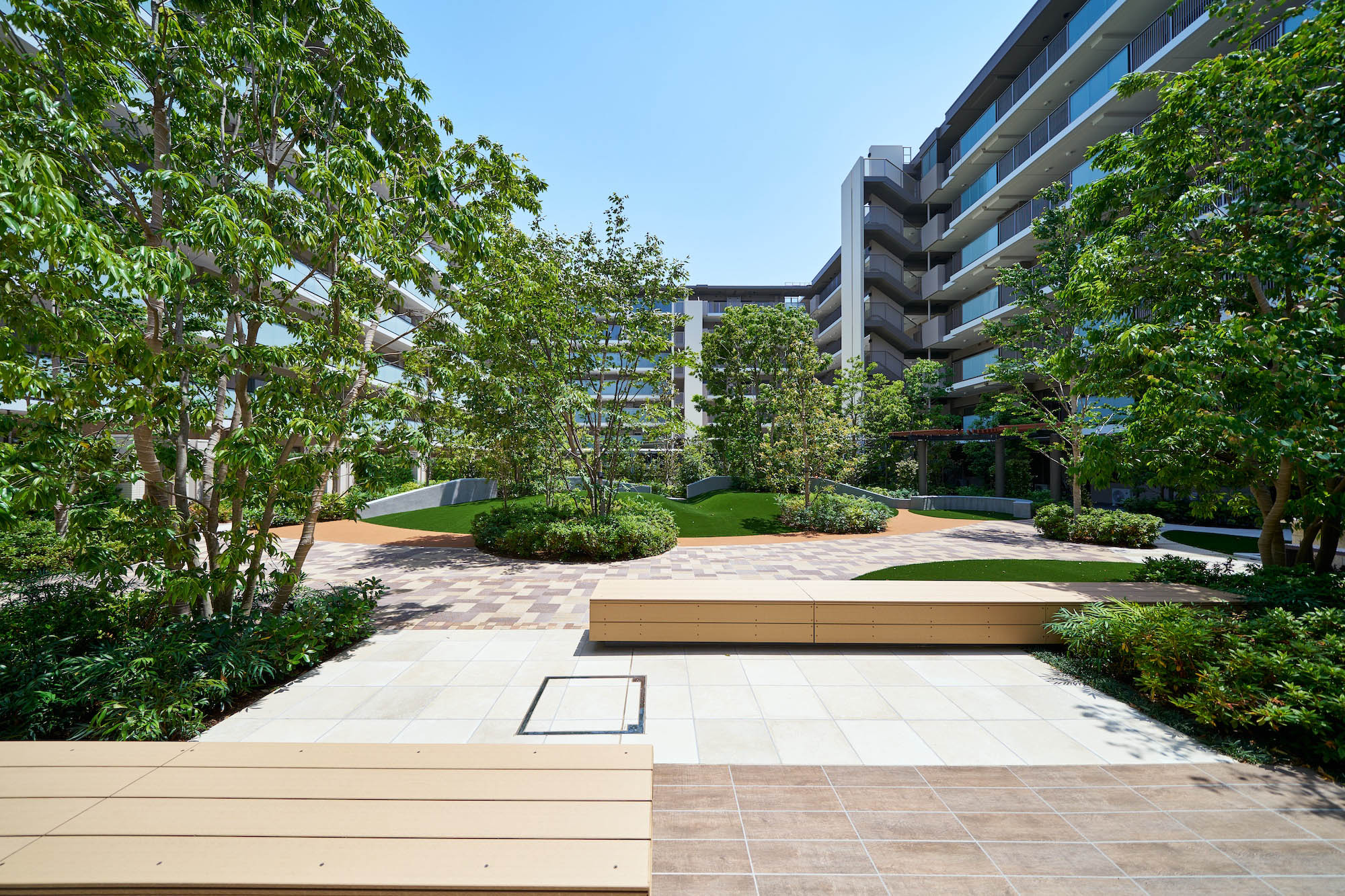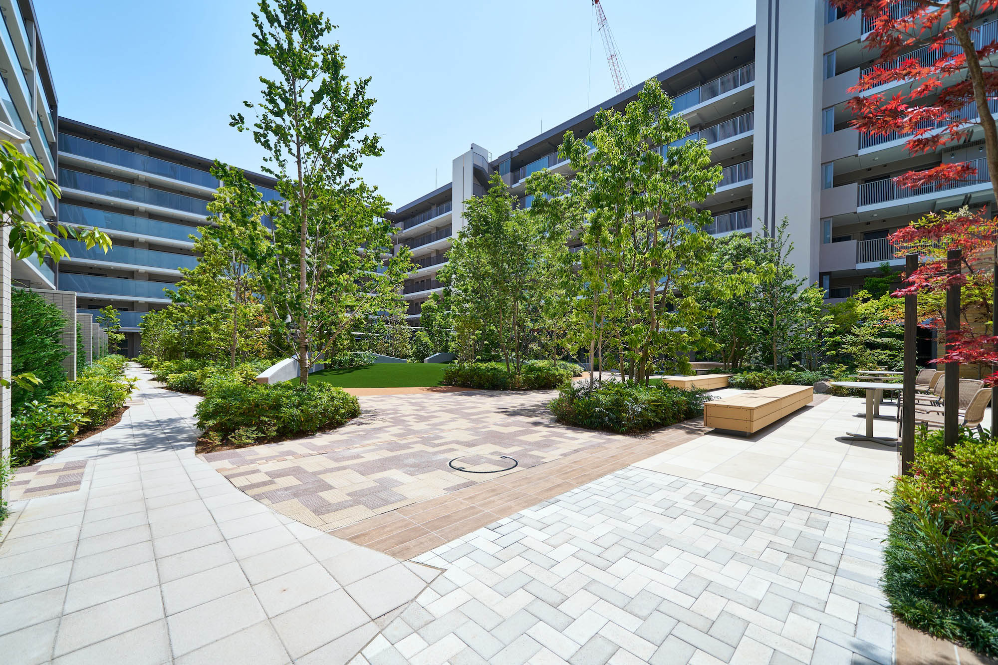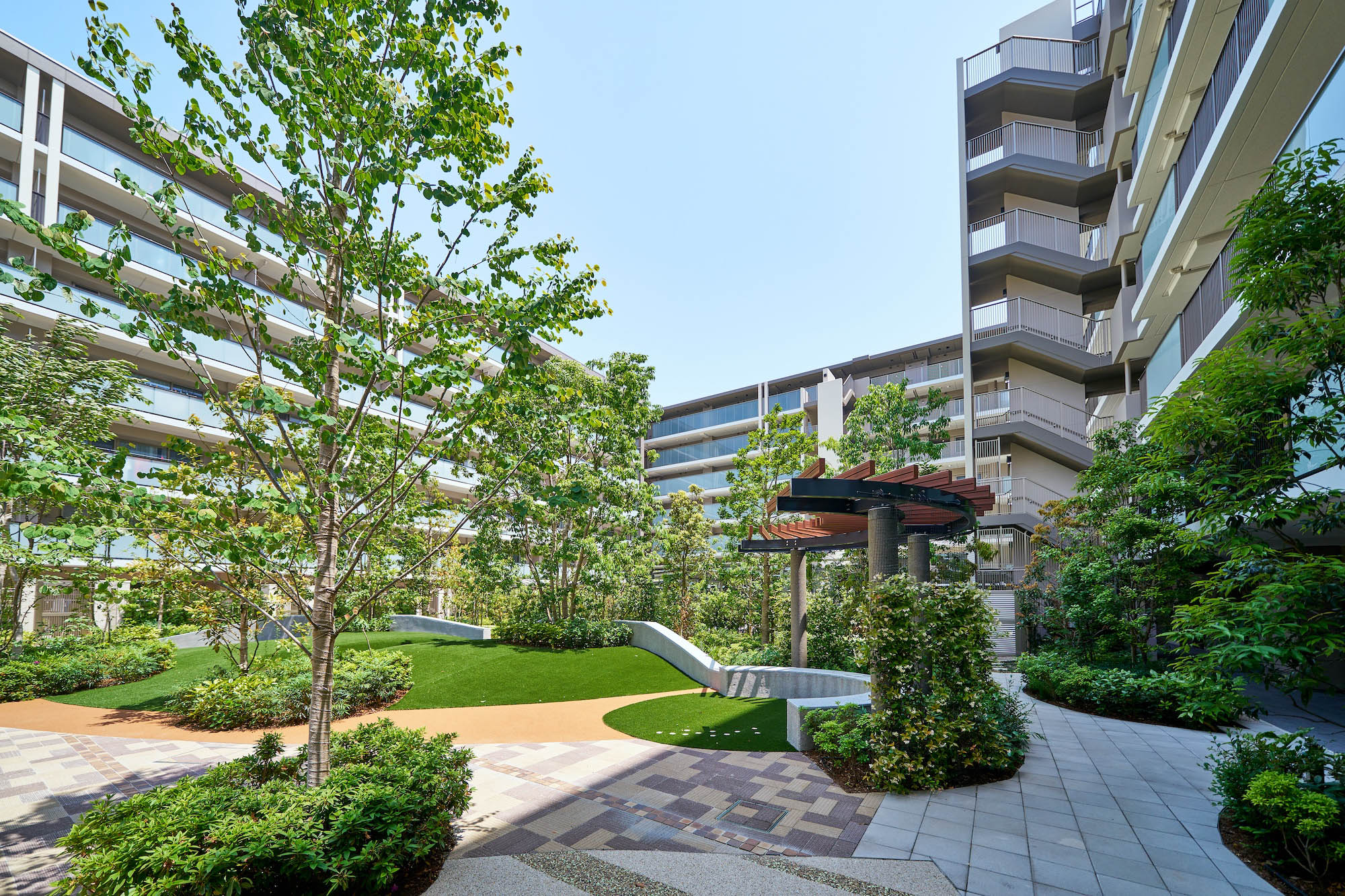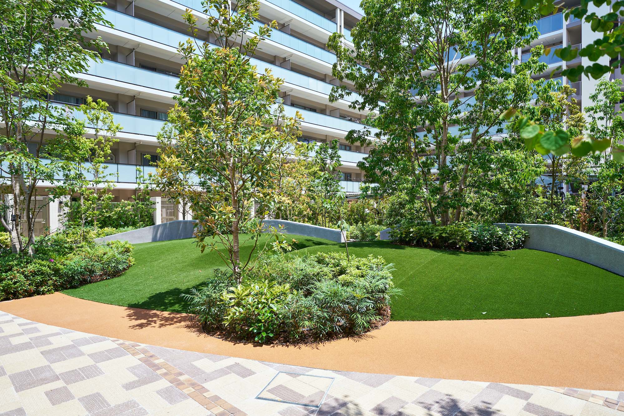 共用空間には、緑と繋がる「ガーデンラウンジ」や、仕事場や子供の遊び場として利用できる「ワーク/キッズラウンジ」が用意されています。ワーク/キッズラウンジは、平日と週末で使い方を変えることができる仕様になっており、平日は机といすをレイアウトして大人のワークスペースとして、週末はプレイマットを敷いて子供たちが自由に遊べる空間として利用できます。集中して作業ができる個室ブースや、お絵かきができる素材を使用した壁なども備え、ひとりでも、家族でも世代を問わず多機能な利用を叶える空間です。「ガーデンラウンジ」は、中庭との連続性をもたらす設計で、天気の良い日には大きな窓を開放して緑や風の心地よさに安らぐことができます。敷地中央の中庭「オーナーズガーデン」は、気軽に寝転べる人工芝のマウンドや、ペットの足洗い場を完備するほか、Wi-Fi利用も可能です。緑の潤いの中ゆったりと過ごすことができ、季節ごとの発見や住民同士の出会いをきっかけに、豊かな時間が育まれます。