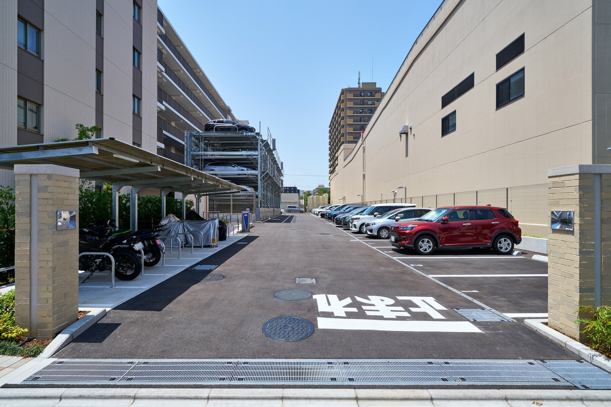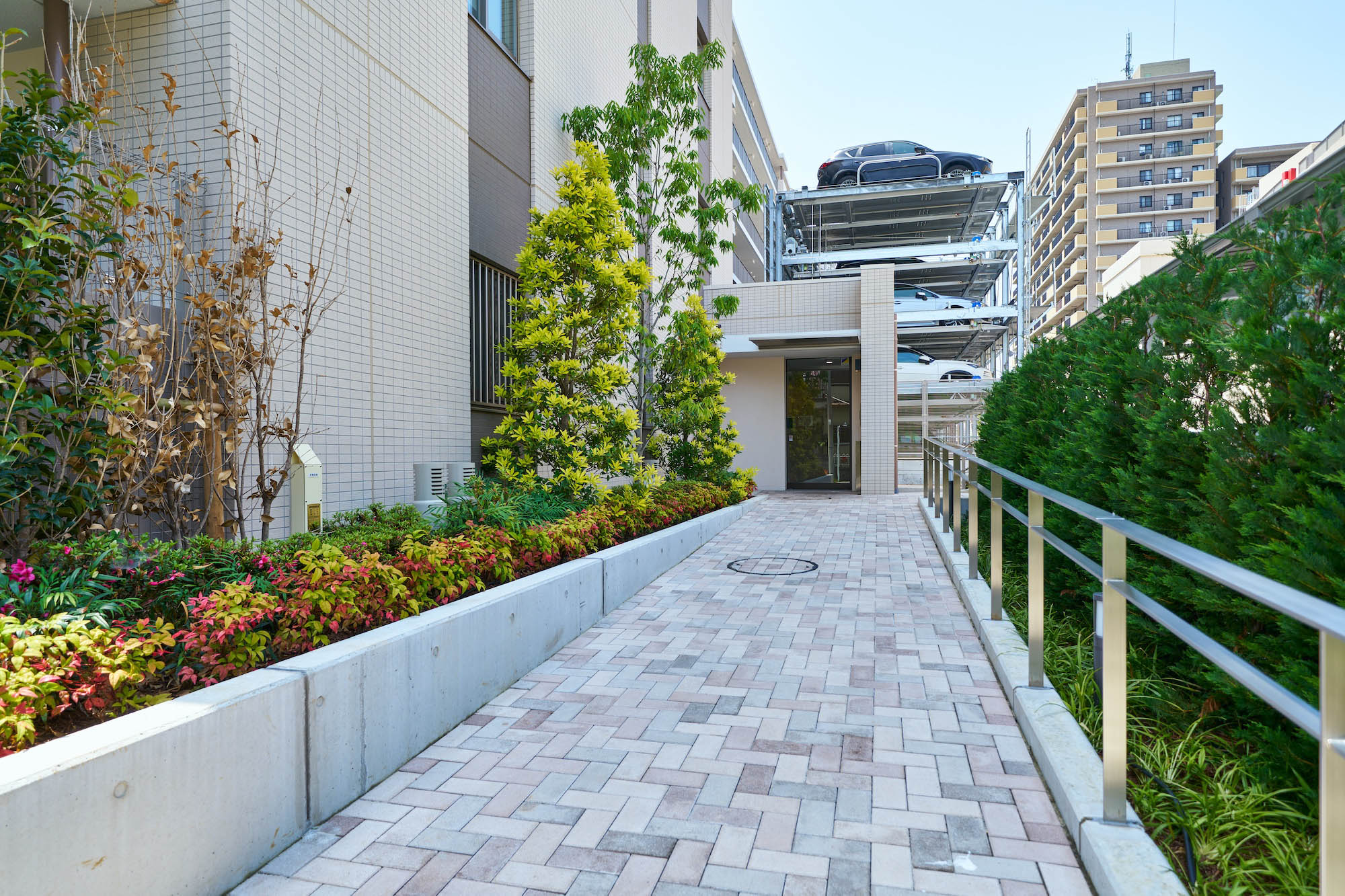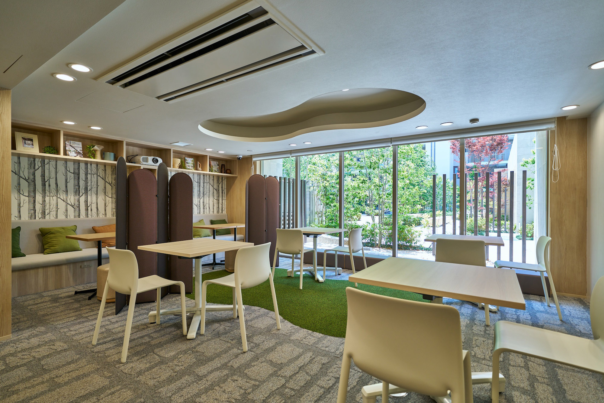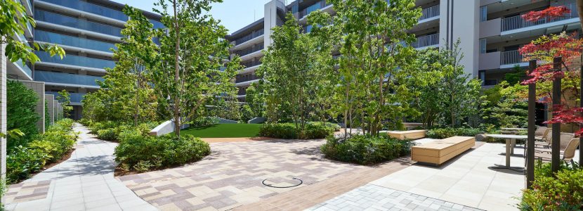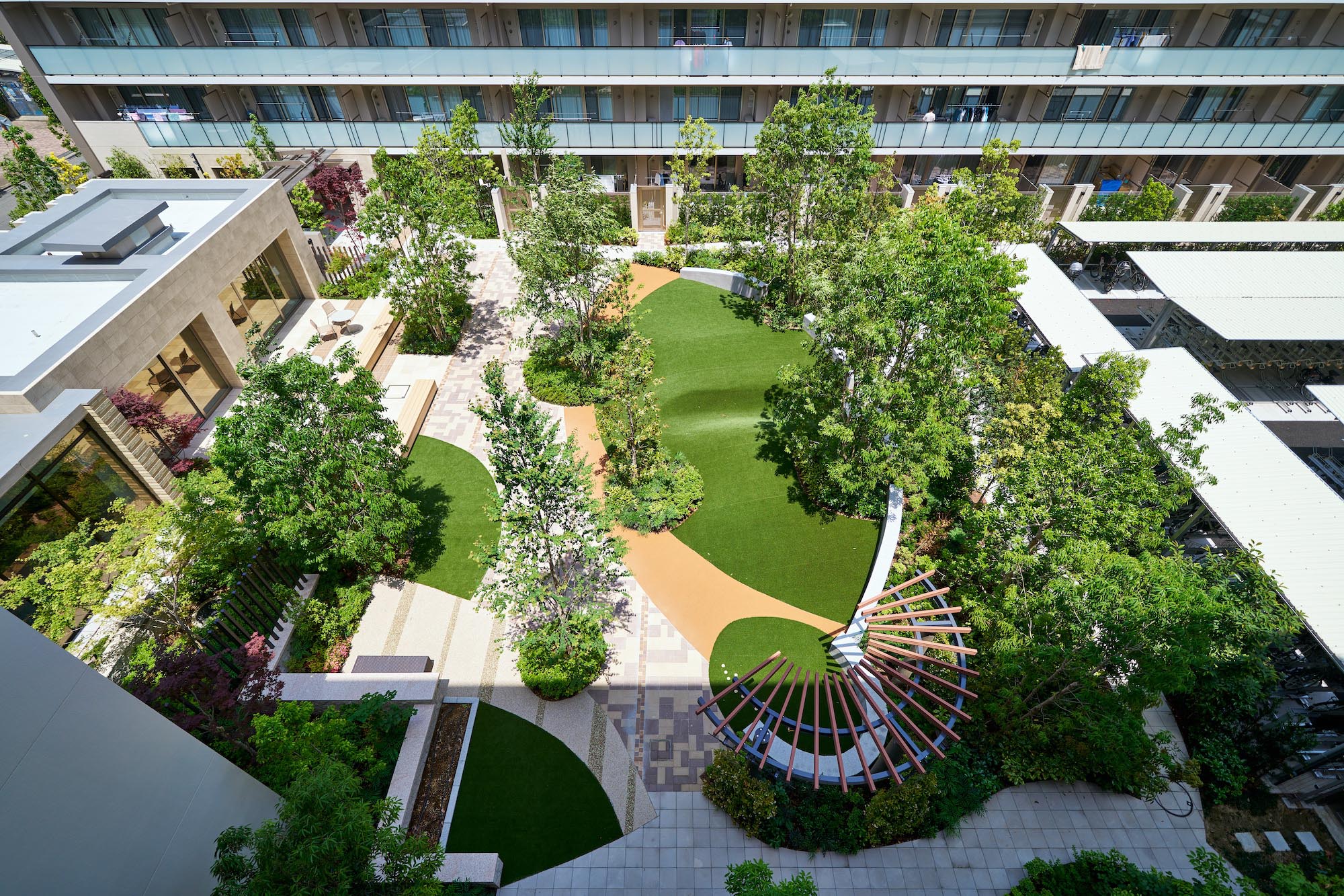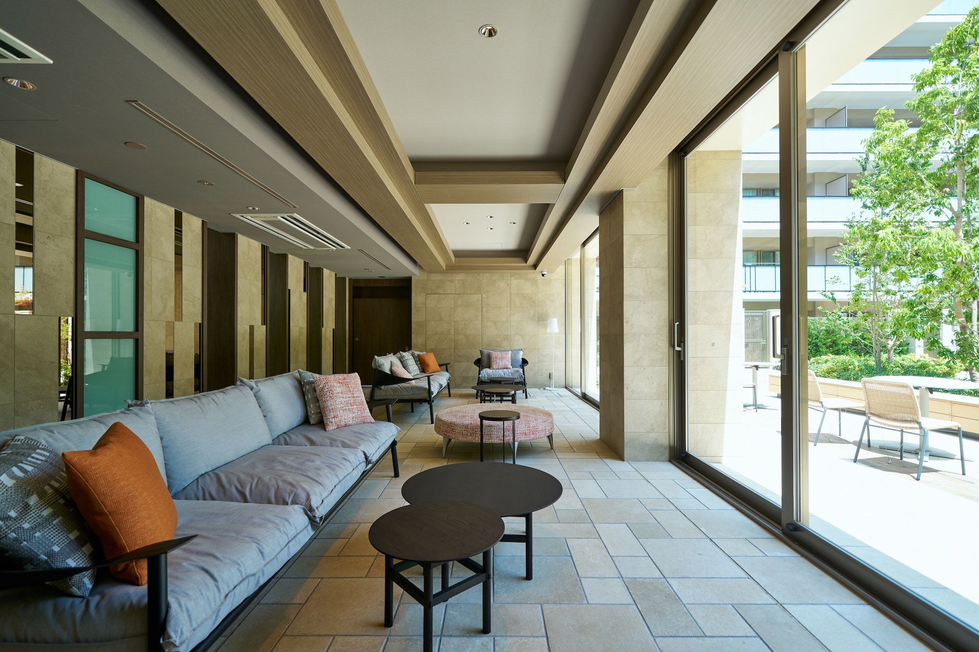 共用空間には、緑と繋がる「ガーデンラウンジ」や、仕事場や子供の遊び場として利用できる「ワーク/キッズラウンジ」が用意されています。ワーク/キッズラウンジは、平日と週末で使い方を変えることができる仕様になっており、平日は机といすをレイアウトして大人のワークスペースとして、週末はプレイマットを敷いて子供たちが自由に遊べる空間として利用できます。集中して作業ができる個室ブースや、お絵かきができる素材を使用した壁なども備え、ひとりでも、家族でも世代を問わず多機能な利用を叶える空間です。「ガーデンラウンジ」は、中庭との連続性をもたらす設計で、天気の良い日には大きな窓を開放して緑や風の心地よさに安らぐことができます。敷地中央の中庭「オーナーズガーデン」は、気軽に寝転べる人工芝のマウンドや、ペットの足洗い場を完備するほか、Wi-Fi利用も可能です。緑の潤いの中ゆったりと過ごすことができ、季節ごとの発見や住民同士の出会いをきっかけに、豊かな時間が育まれます。