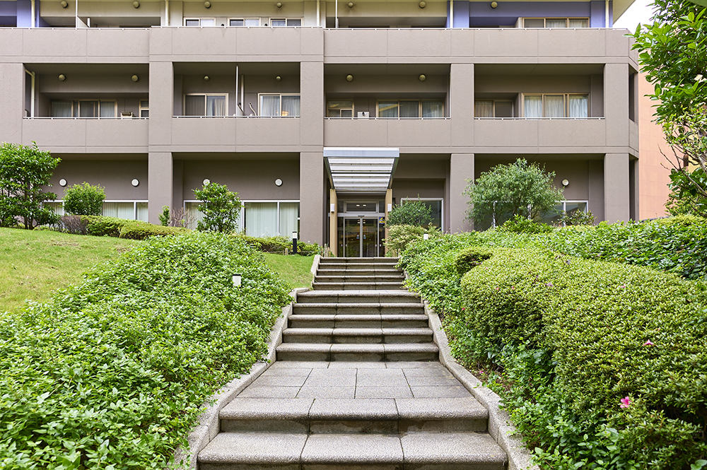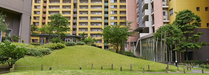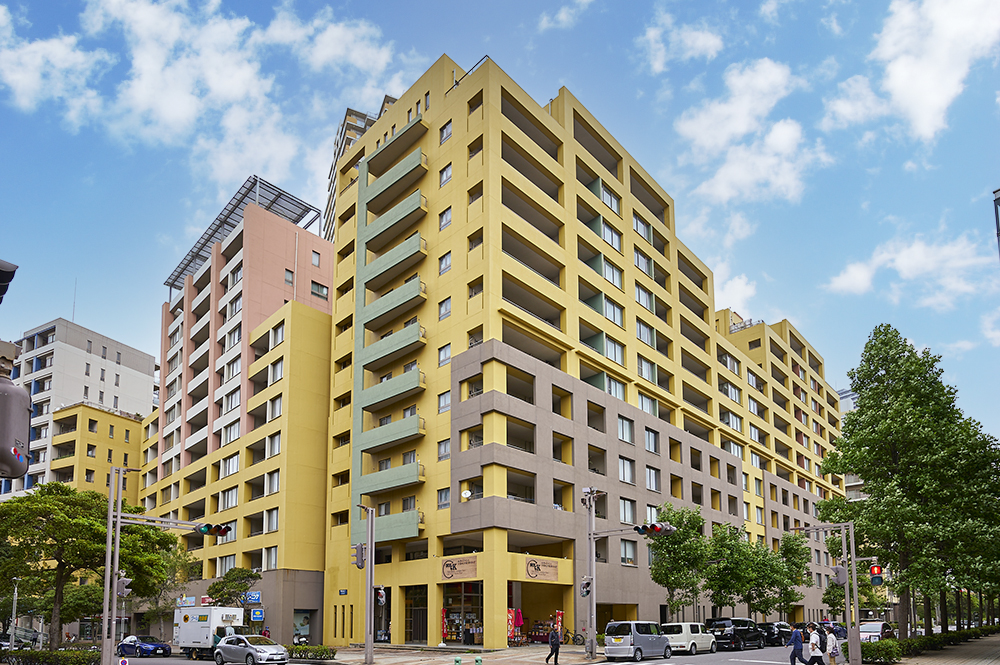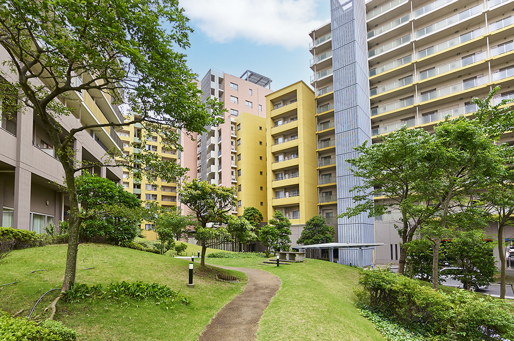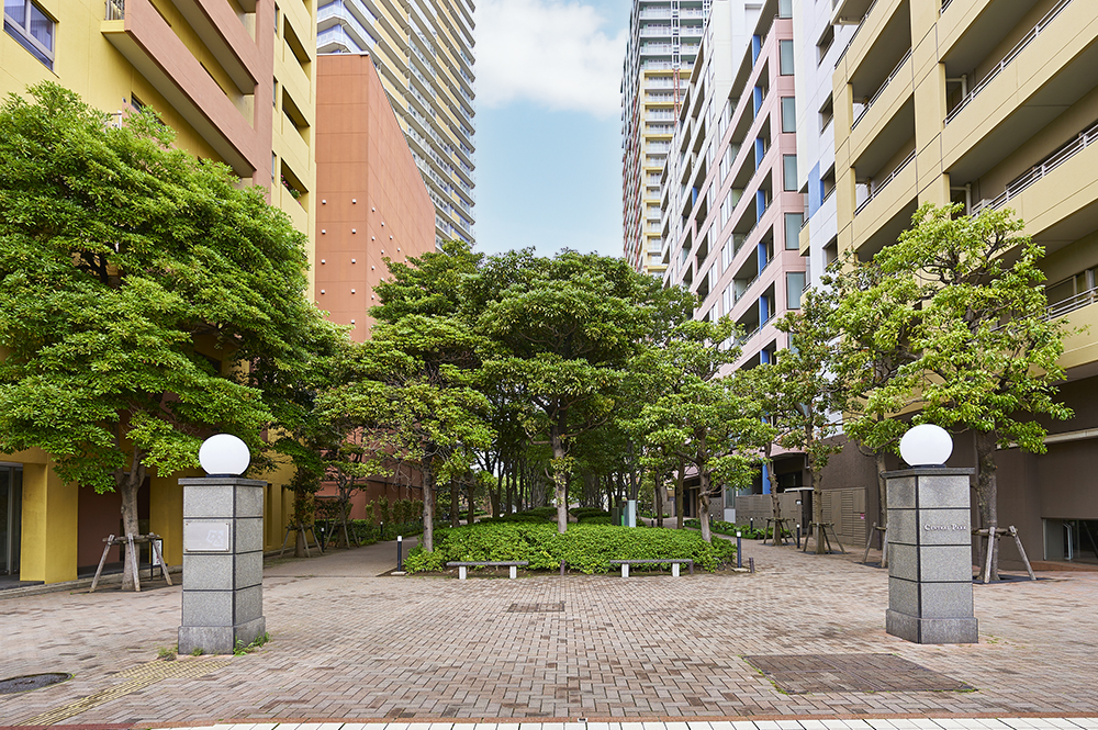 幕張ベイタウンの住宅はすべて、沿道型の集合住宅。道路で区切られたひとつのブロックを、中庭を抱いたひとかたまりの建物で構成する沿道型の都市デザインとなっています。落ち着きとナチュラルなやさしさをコンセプトに植栽された中庭と、モダンで温かみのある外観デザインが風景となって心に溶け込みます。