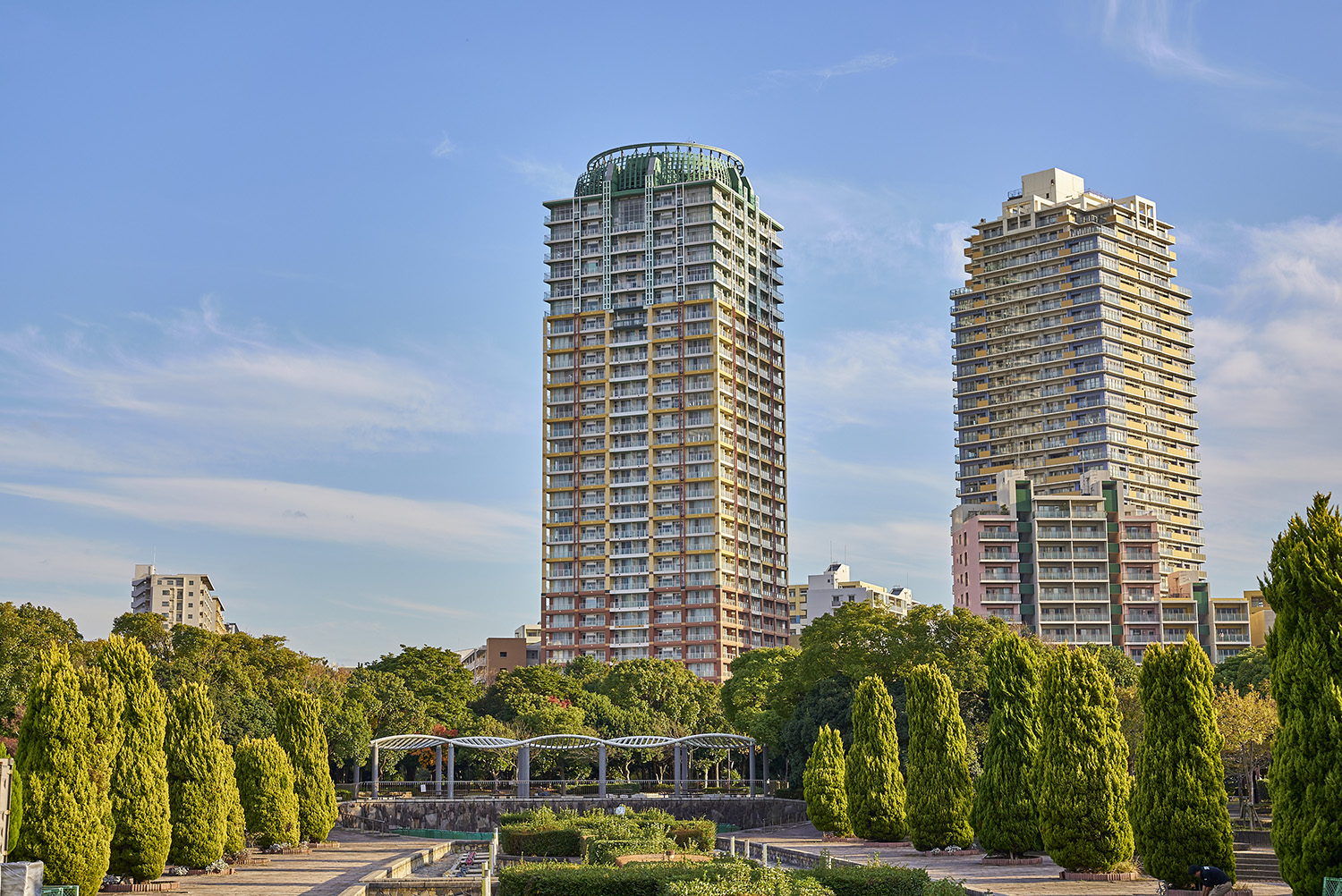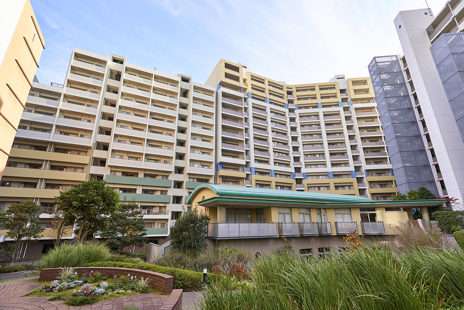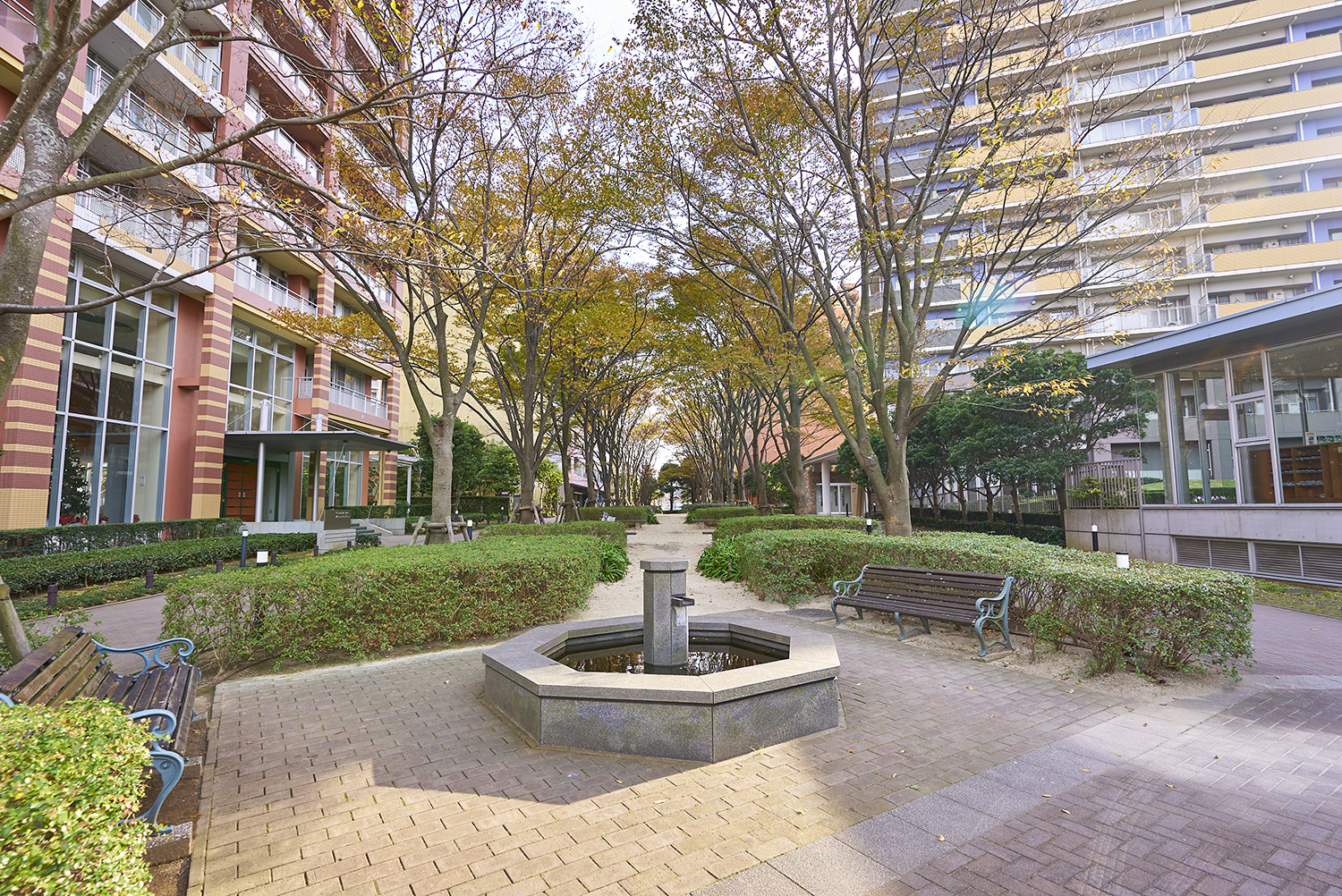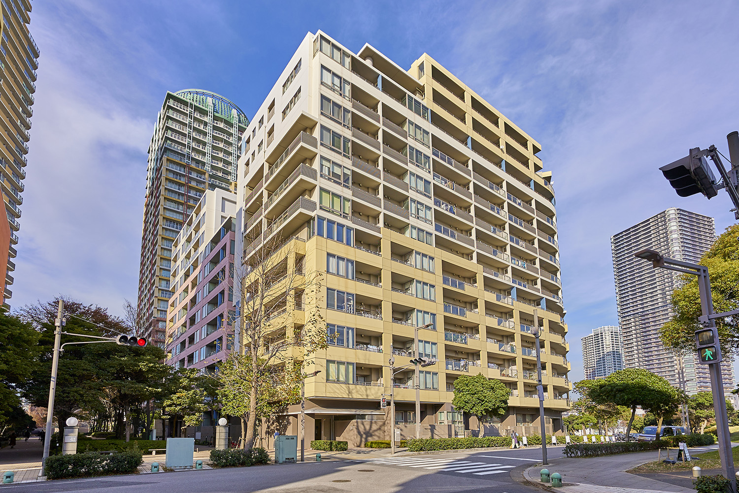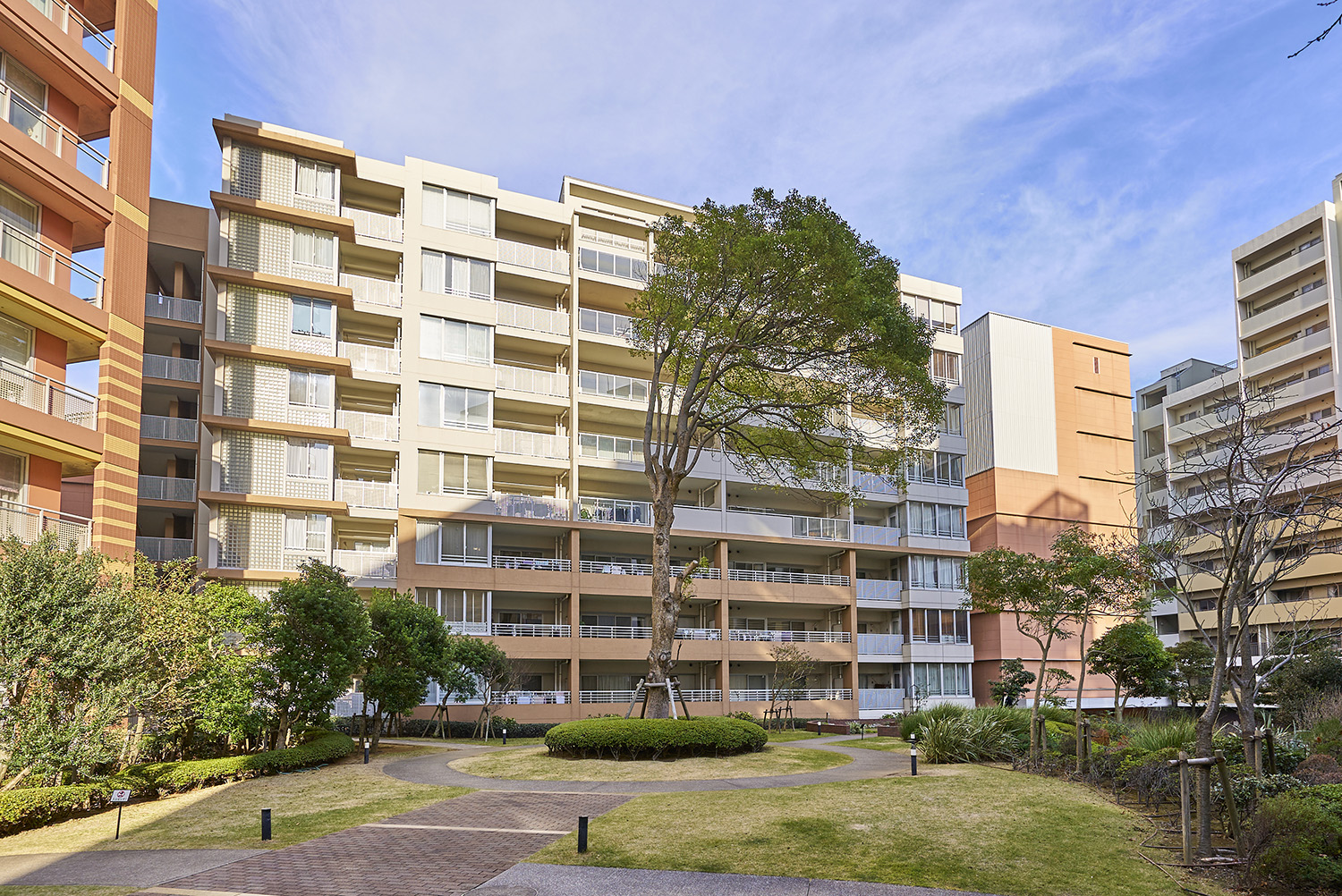 「セントラルパークイースト」は「幕張パークタワー」とE〜Hの計5棟で構成されており、「セントラルパークウエスト」とは全長約170mの大ケヤキ並木によって分けられています。建物外観はベイタウンに相応しい、モダンで温かみのあるデザイン。特に「幕張パークタワー」は、東の「シータワー」とともに地域のシンボル的存在です。そのデザインとして最も象徴的なのが、タワー頂上部にある「天使のリング」をイメージしたティアラ。さらに低・中・高層ごとに色分けされたフレームカラーとグリッドの枡目が目印となって、遠くからでも我が家を見つけられる、際立つ個性とアイデンティティを持たせた外観デザインとなっています。