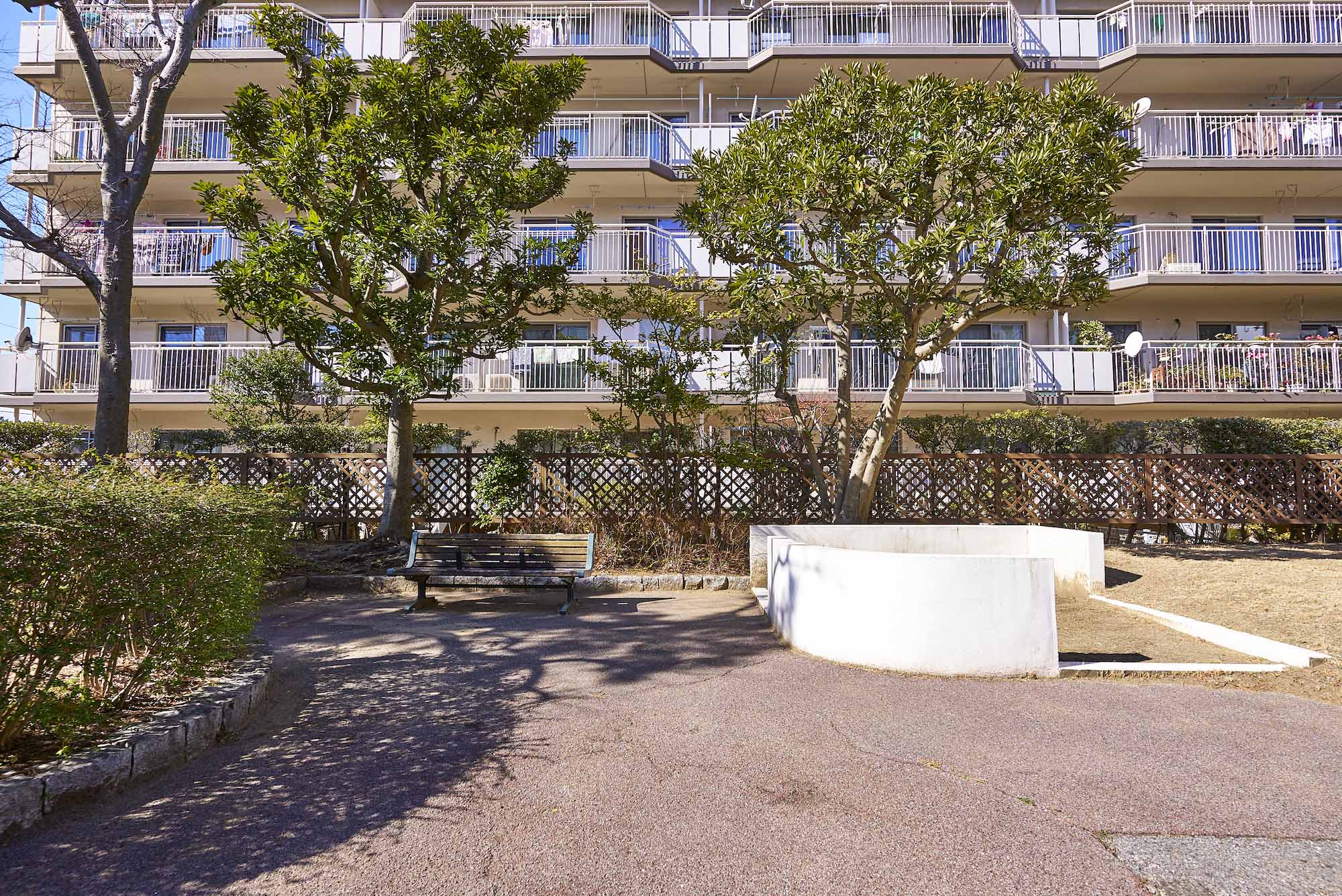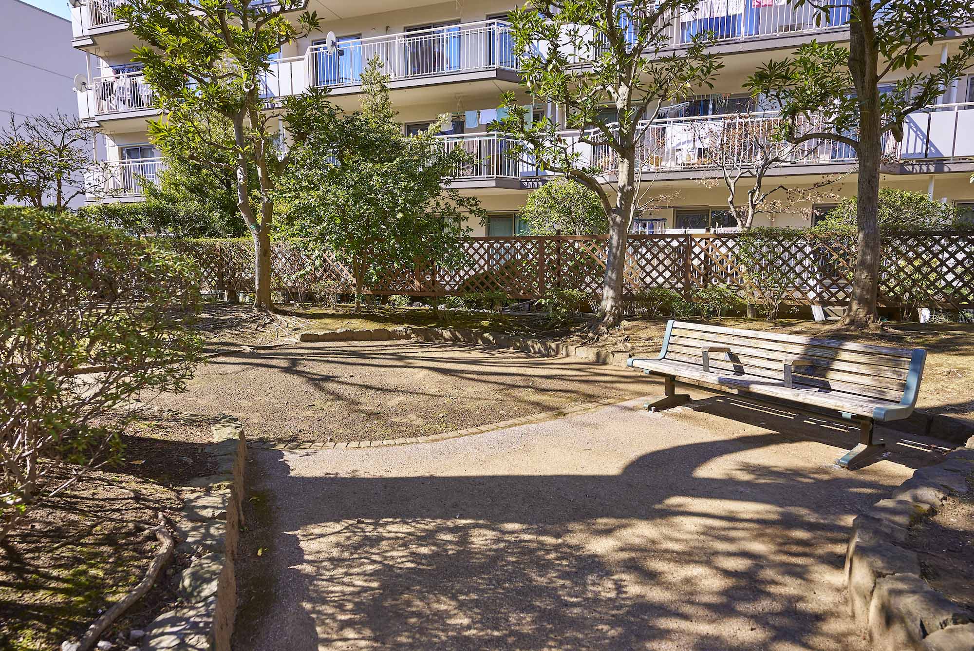 2号棟の1階に管理事務所があり、各種会合に利用できる集会室が設置されています。敷地内には豊富な植栽と、至るところにベンチが設けられており、陽光と緑に満たされた憩いの空間が広がっています。