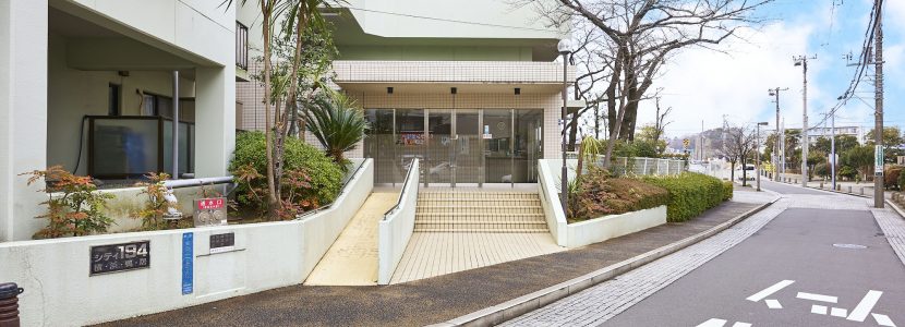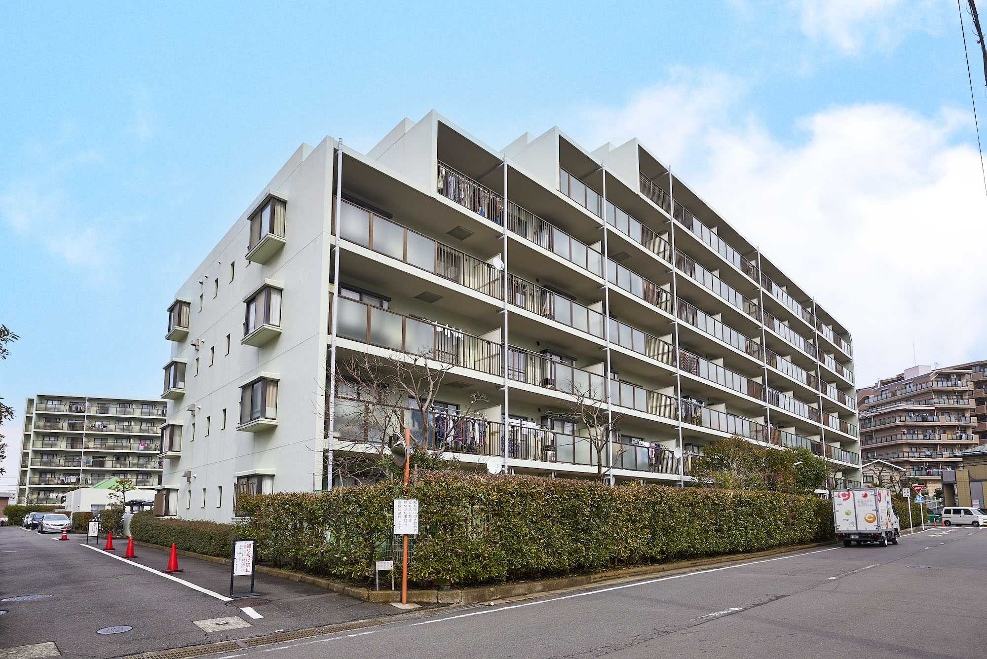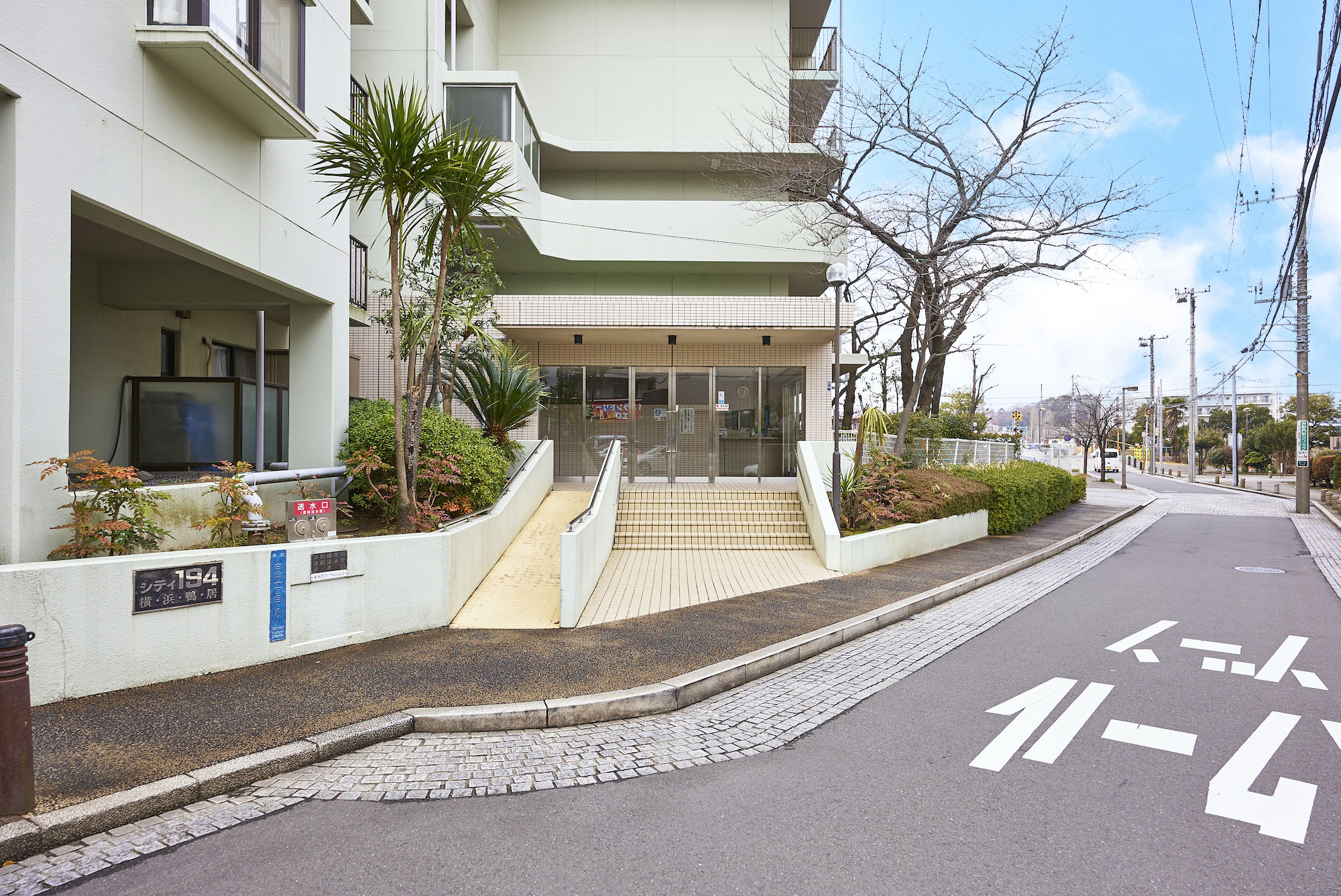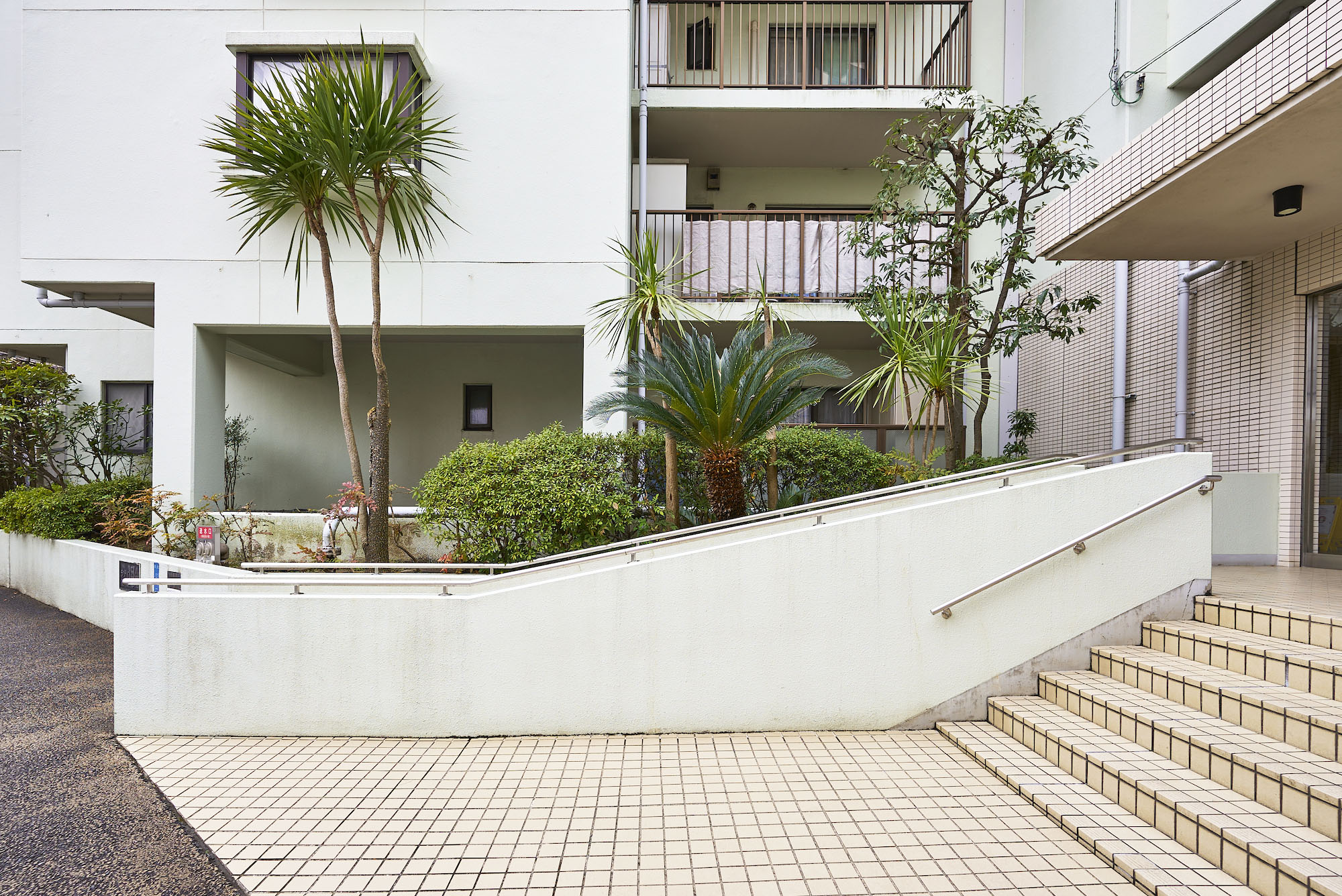白を基調としたタイル貼りの爽やかな外観。エントランス周りや外構には豊富な植栽が施され、周辺環境と心地よく馴染み、温かな街並みをつくりあげています。