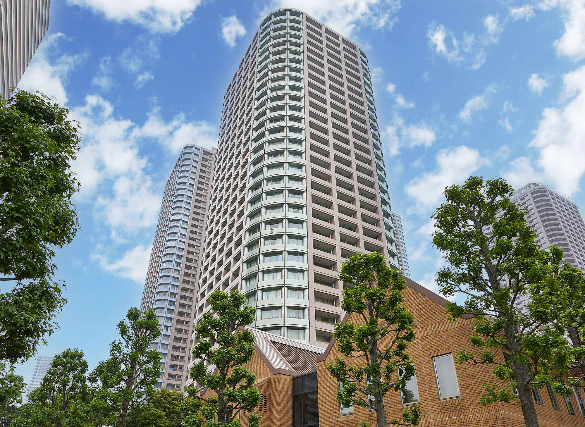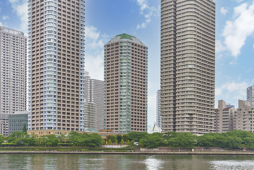 「シティフロントタワー」は、東京ウォーターフロント開発の先駆けとなったプロジェクト「リバーシティ21」の一角にあります。“水と緑にあふれた都市景観の創造”をテーマに整備された敷地は約3haに及び、あくまで人中心の街が形作られています。隅田川沿いの区立佃公園と一体的にコーディネートされた公開空地には、都心では類を見ない緑あふれる自然が育まれ、うるおいの居住環境を生みだしています。