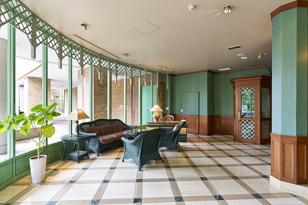 住まいのグレードの高さを物語る、落ち着いたたたずまいのファサード。自然石と2本の円柱を配したエントランスゾーン。住む方々を明るく迎えるように、外側に張り出したガラス張りの風除室は、床・壁に大理石を敷きつめ、格調ある住まいの顔にふさわしい装いを施しました。さらに、オートロックドアが開いて自然木フローリングで仕上げたエントランスホールへ。その左手にはサロン感覚の大理石張りのロビー、右手には住む人々が集うラウンジが用意されています。月日を重ねても色あせないステータスを実感していただける重厚感が、さりげなく盛り込まれたパブリック空間です。