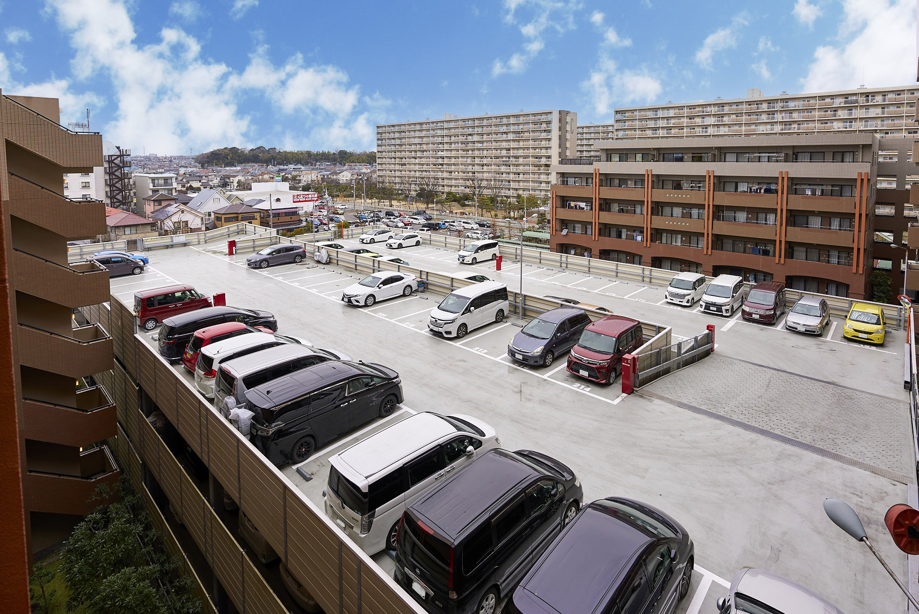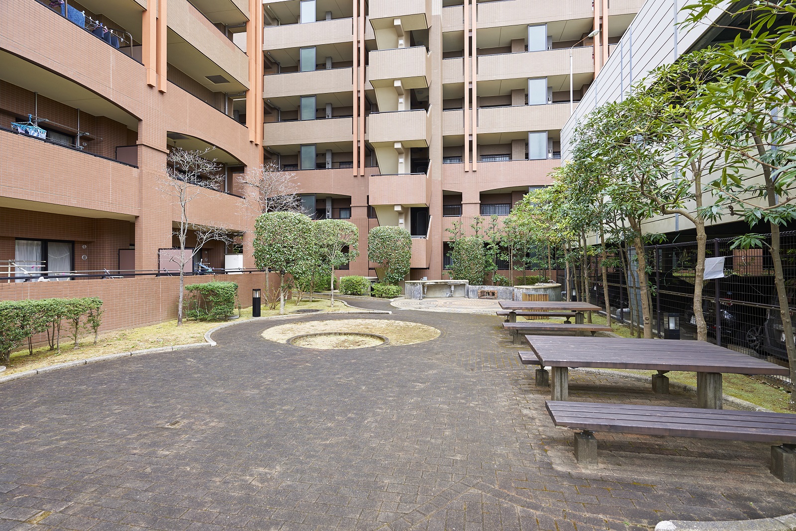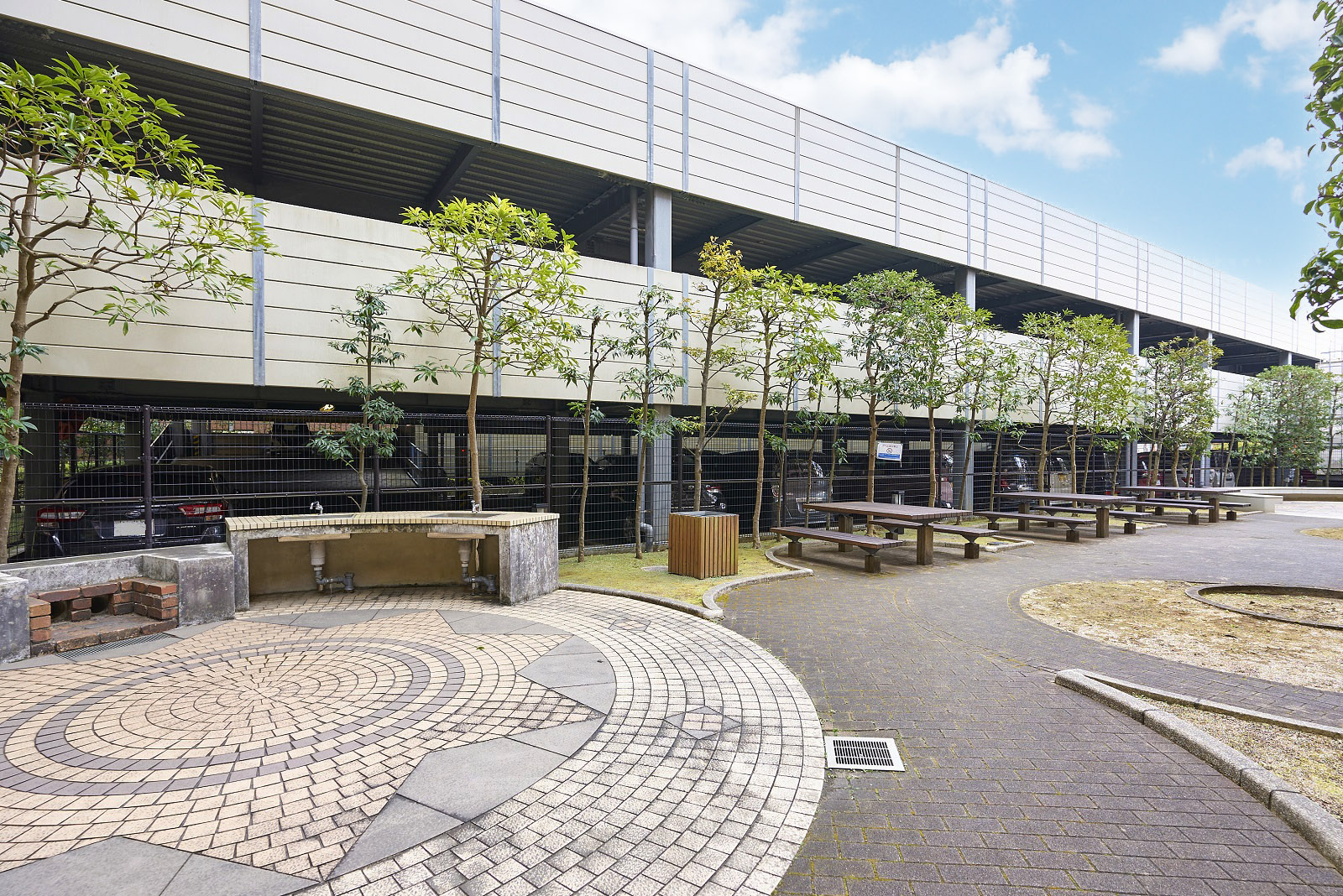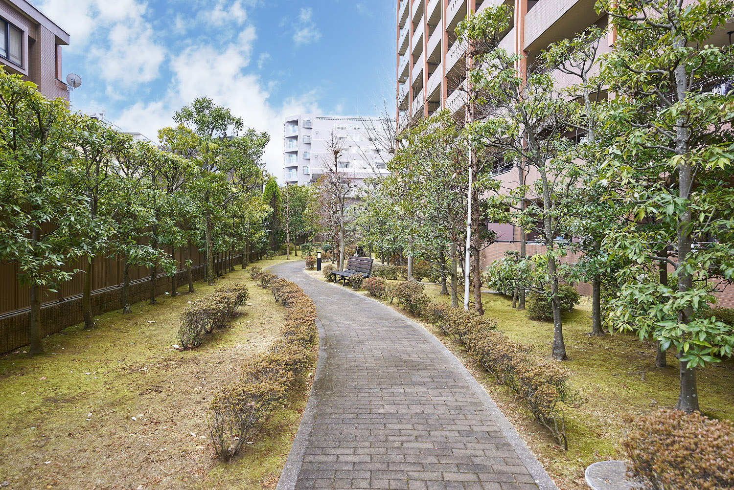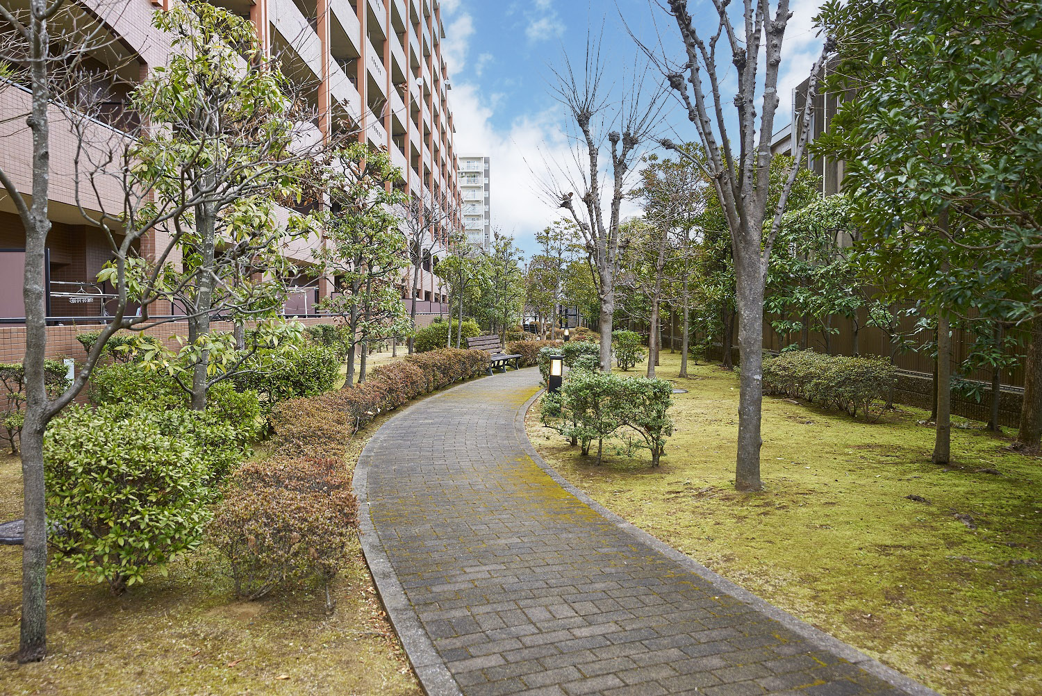 エントランスホールは天井が高く、荘厳な雰囲気の大空間です。帰宅した住民の方を温かく迎え入れ、訪問客を厳かにもてなします。住棟と駐車場の間には広々とした中庭を配置。大人たちが寛げるテーブルとベンチ、子どもたちが遊べるウォーターガーデンがあり、夏には水を流して水遊びをすることもできます。ウォーターガーデンに隣接してキッズルームも完備。天気に左右されることなく子供が楽しめる遊び場として、また集会室としても活用されています。建物の周囲に設けられた住民専用の遊歩道は、緑豊かな憩いの空間です。隣接する建物との距離を取ることで、ゆとりある居住スペースを確保しています。