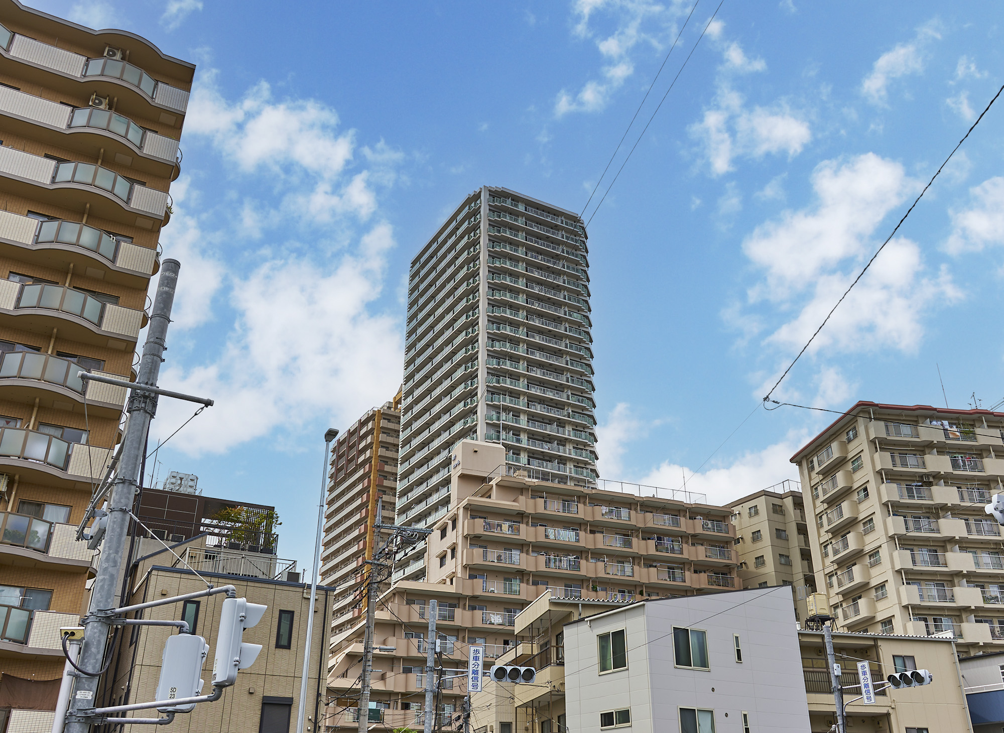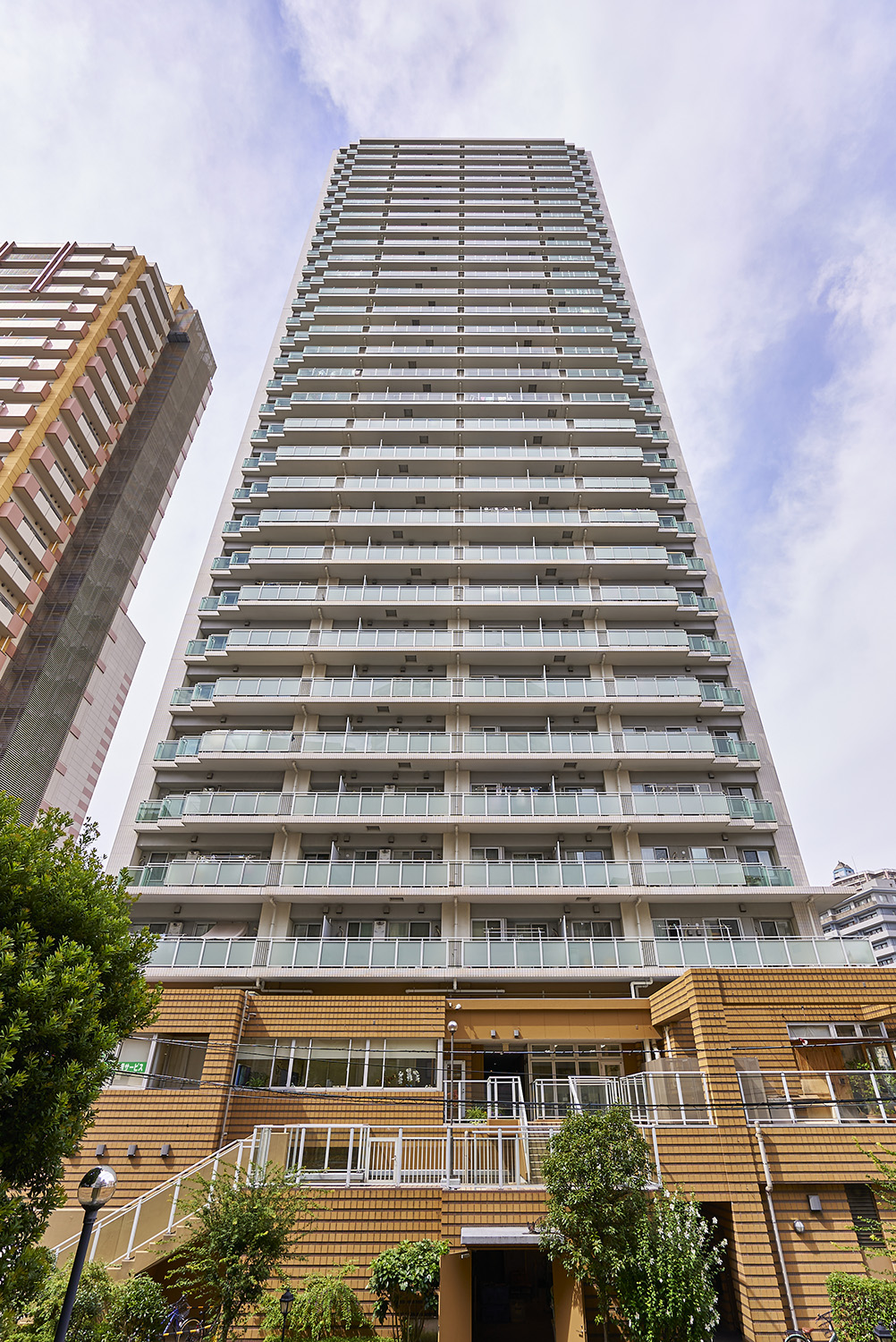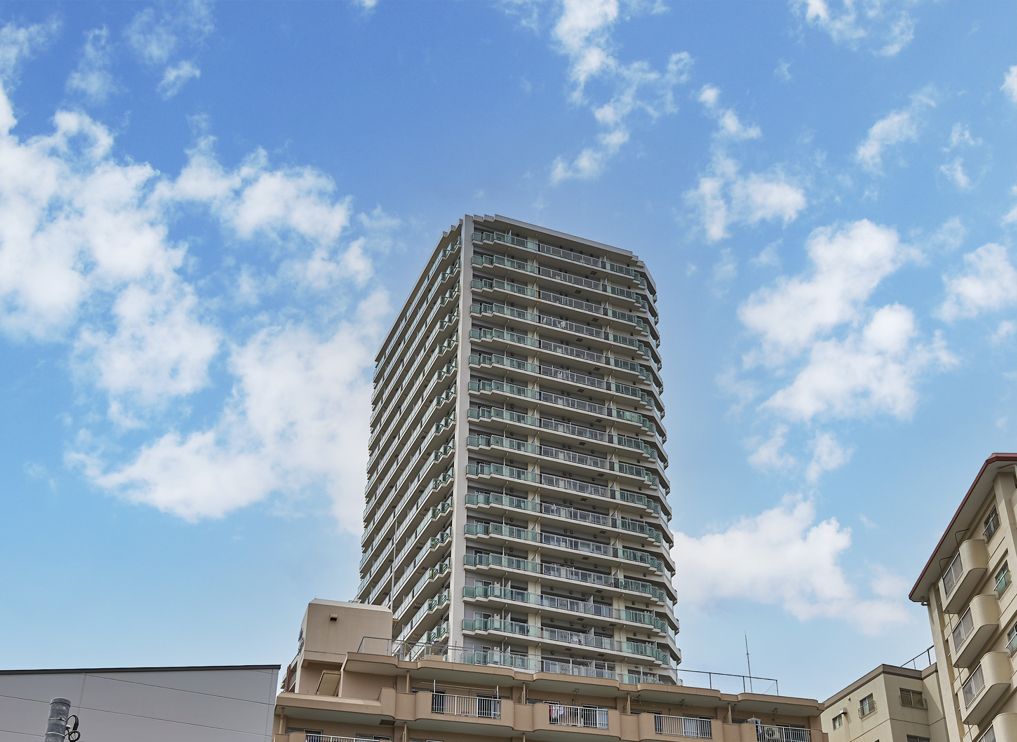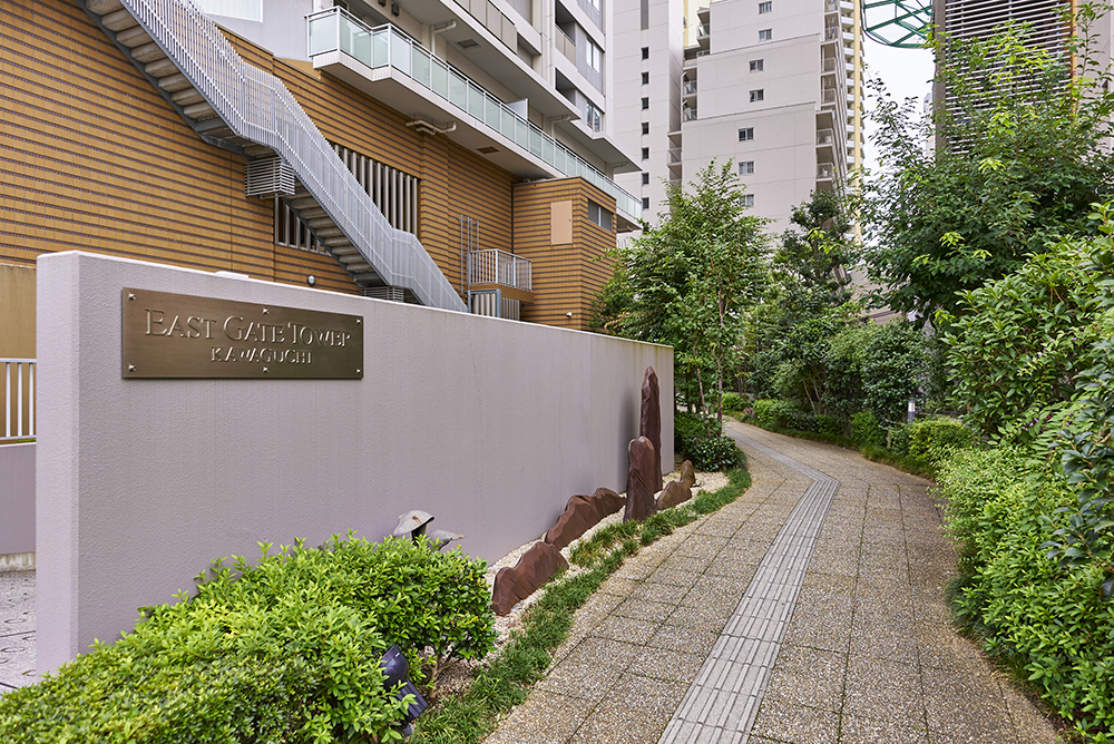 美しい緑と商業施設を複合した超高層31階建ての「イーストゲートタワー川口」。低層部にはせっ器質タイルによるアースカラーを基調としたデザインが施され、上層部は爽やかな白をベースにしたファサードが構築されています。コーナーには緑のカラーガラスが使用され、軽快なアクセントをプラス。暮らす人、道行く人々にとっても愛着を感じさせる、洗練されたフォルムです。