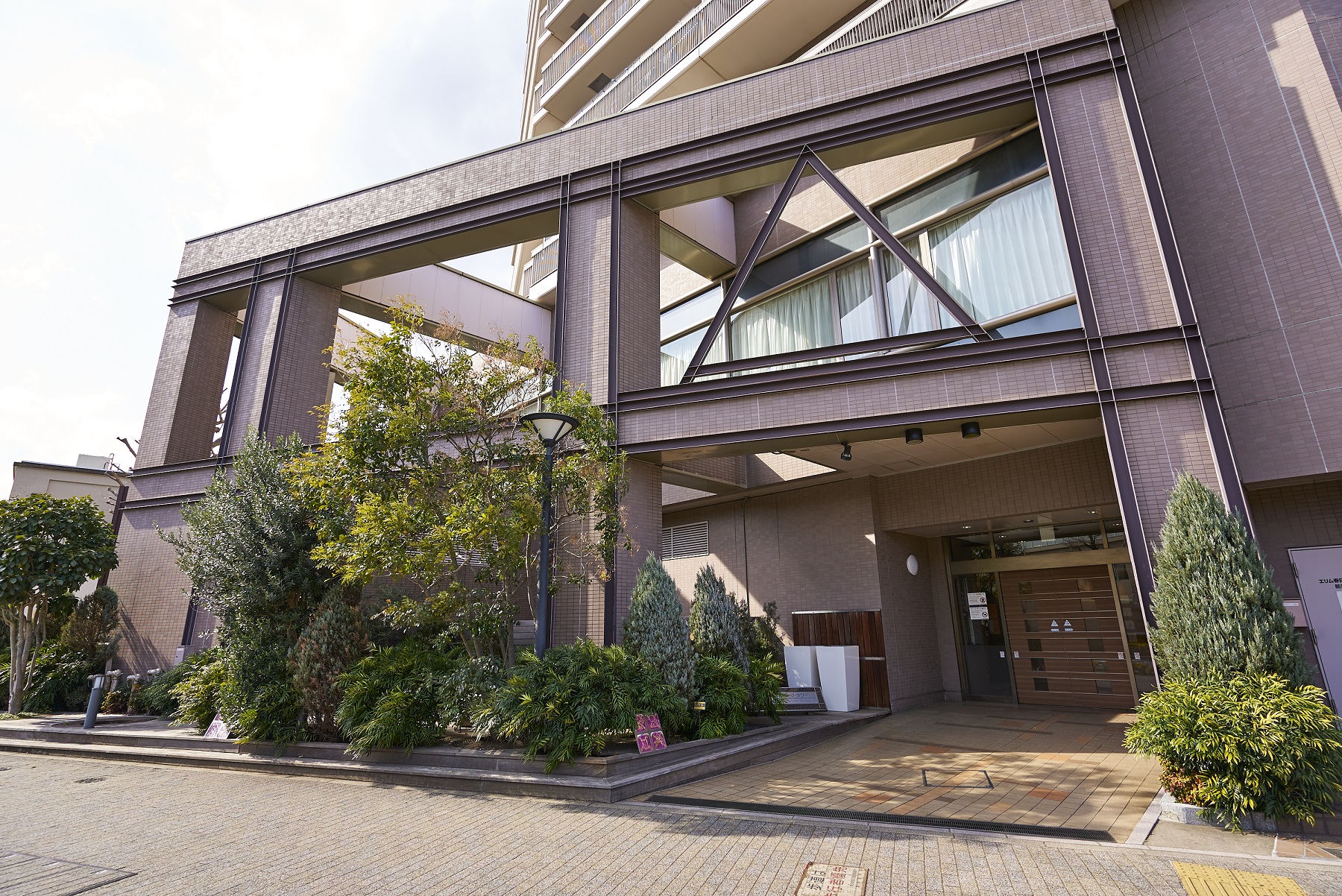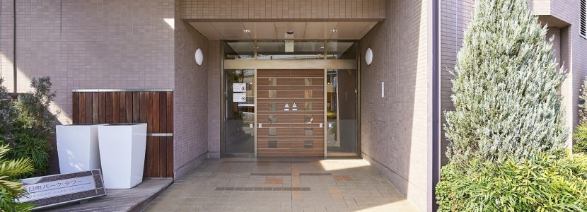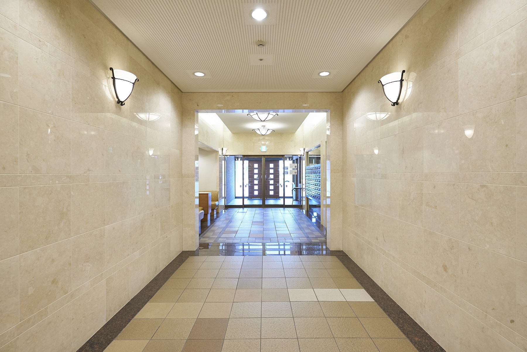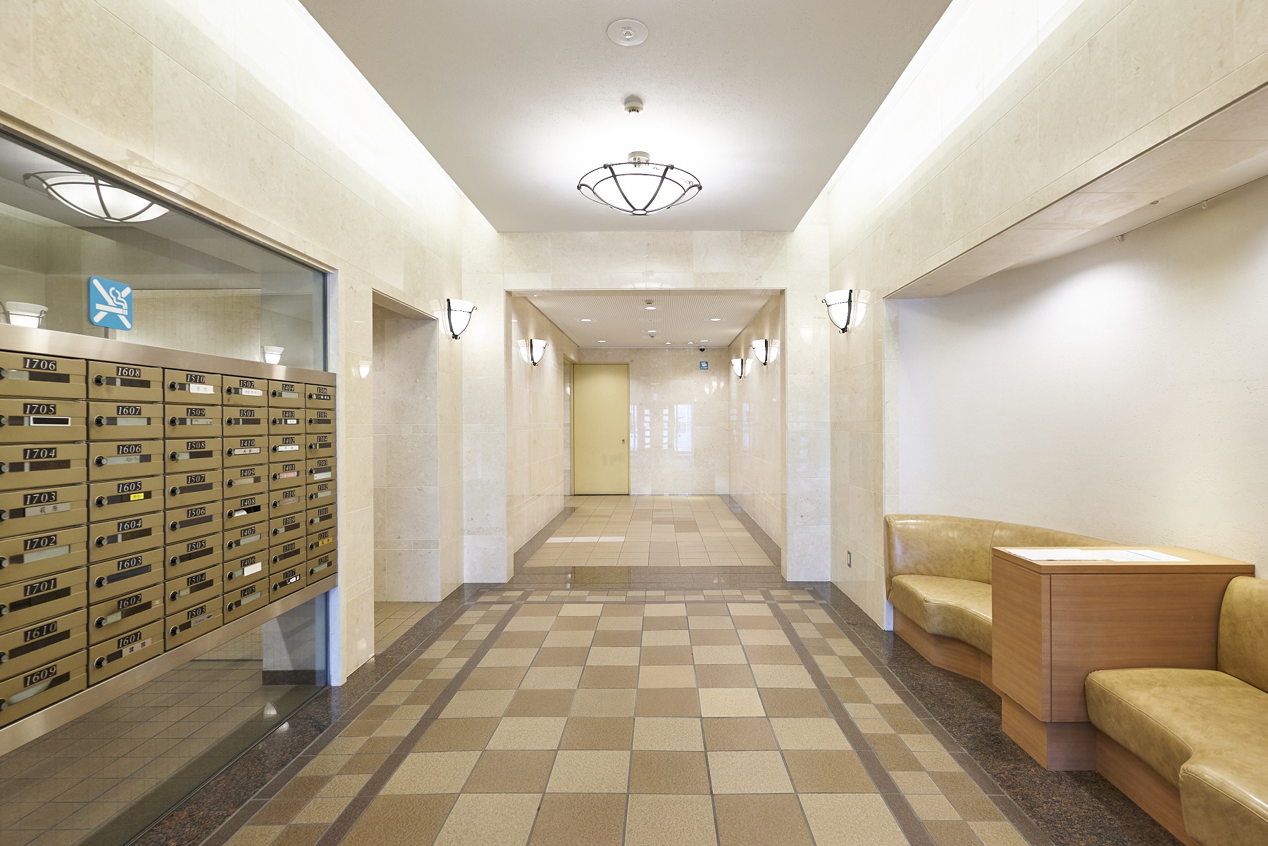 「エリム春日町パークタワー」は住棟のエントランスを独立した設計デザインとしています。シックなデザインはヨーロッパ建築の流れ、ロココ調を意識したもので、石張りのさりげない幾何学模様がエレガンスな雰囲気です。船底天井と呼ばれる天井は、高さを和らげることで落ち着いた印象に。エントランスホールには、モダンな家具も配し、帰る人、訪れる人を心なごませる雰囲気を醸し出しています。ランドマークとしてのタワーから一転、住宅としての顔を強調したアプローチです。