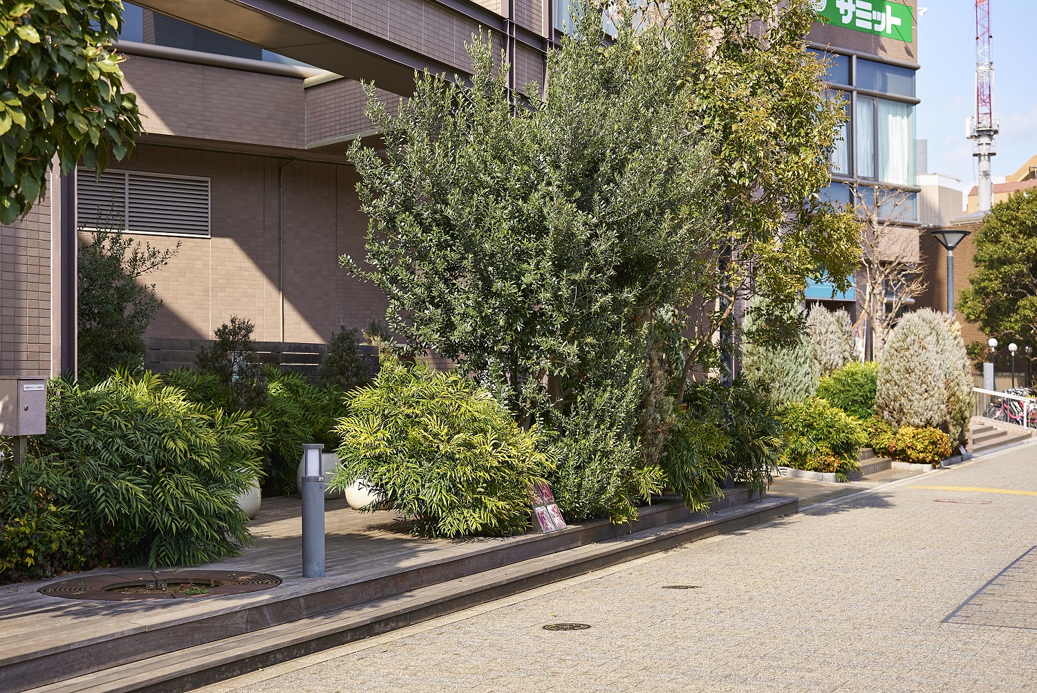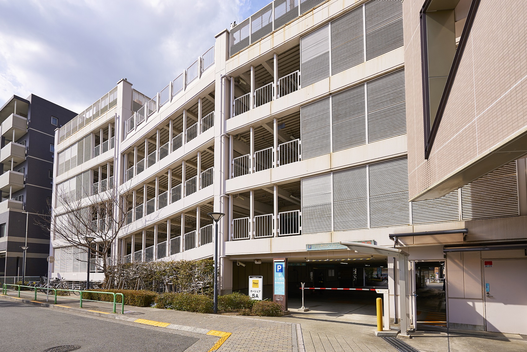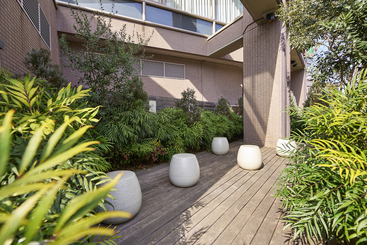 「エリム春日町パークタワー」は住棟のエントランスを独立した設計デザインとしています。シックなデザインはヨーロッパ建築の流れ、ロココ調を意識したもので、石張りのさりげない幾何学模様がエレガンスな雰囲気です。船底天井と呼ばれる天井は、高さを和らげることで落ち着いた印象に。エントランスホールには、モダンな家具も配し、帰る人、訪れる人を心なごませる雰囲気を醸し出しています。ランドマークとしてのタワーから一転、住宅としての顔を強調したアプローチです。