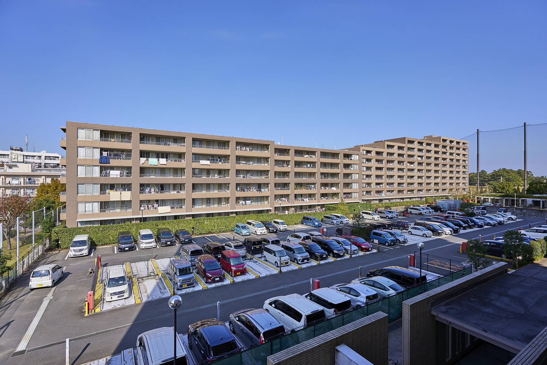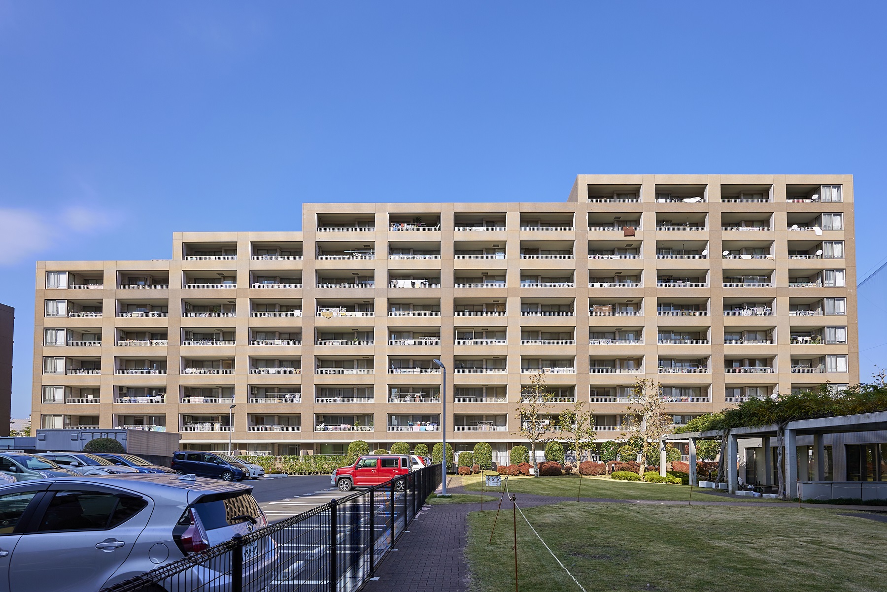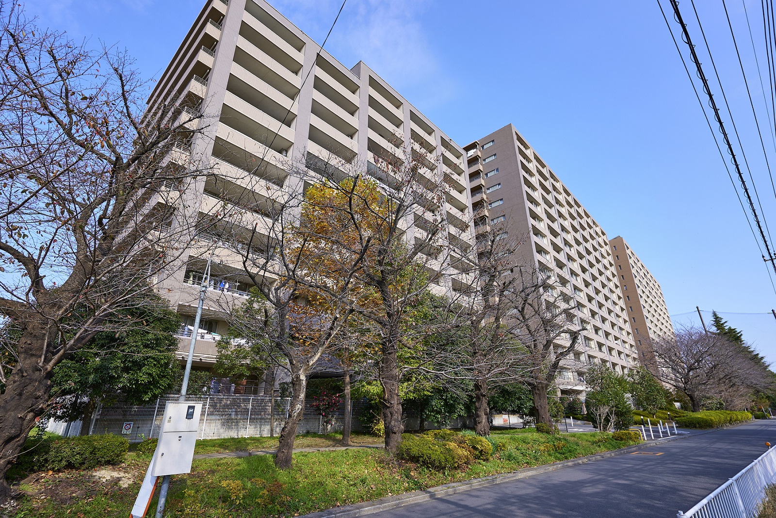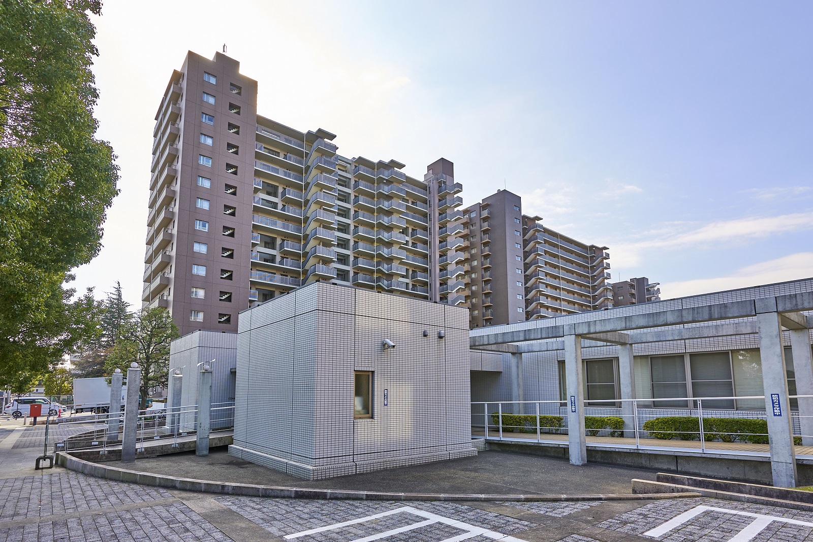 「エステ・スクエア小田急相模原」は、ステージⅠ〜Ⅴの5棟で構成された大規模マンションです。20,000㎡超の広々とした敷地には、中庭の「シンフォニア・ガーデン」や周囲に整備された遊歩道沿いに豊富な植栽が施され、緑に包まれ季節の移ろいを楽しむ豊かな暮らしを演出しています。外観は明るいブラウンのタイル貼りで、緑が映え、街の景観に調和する落ち着いたデザインです。