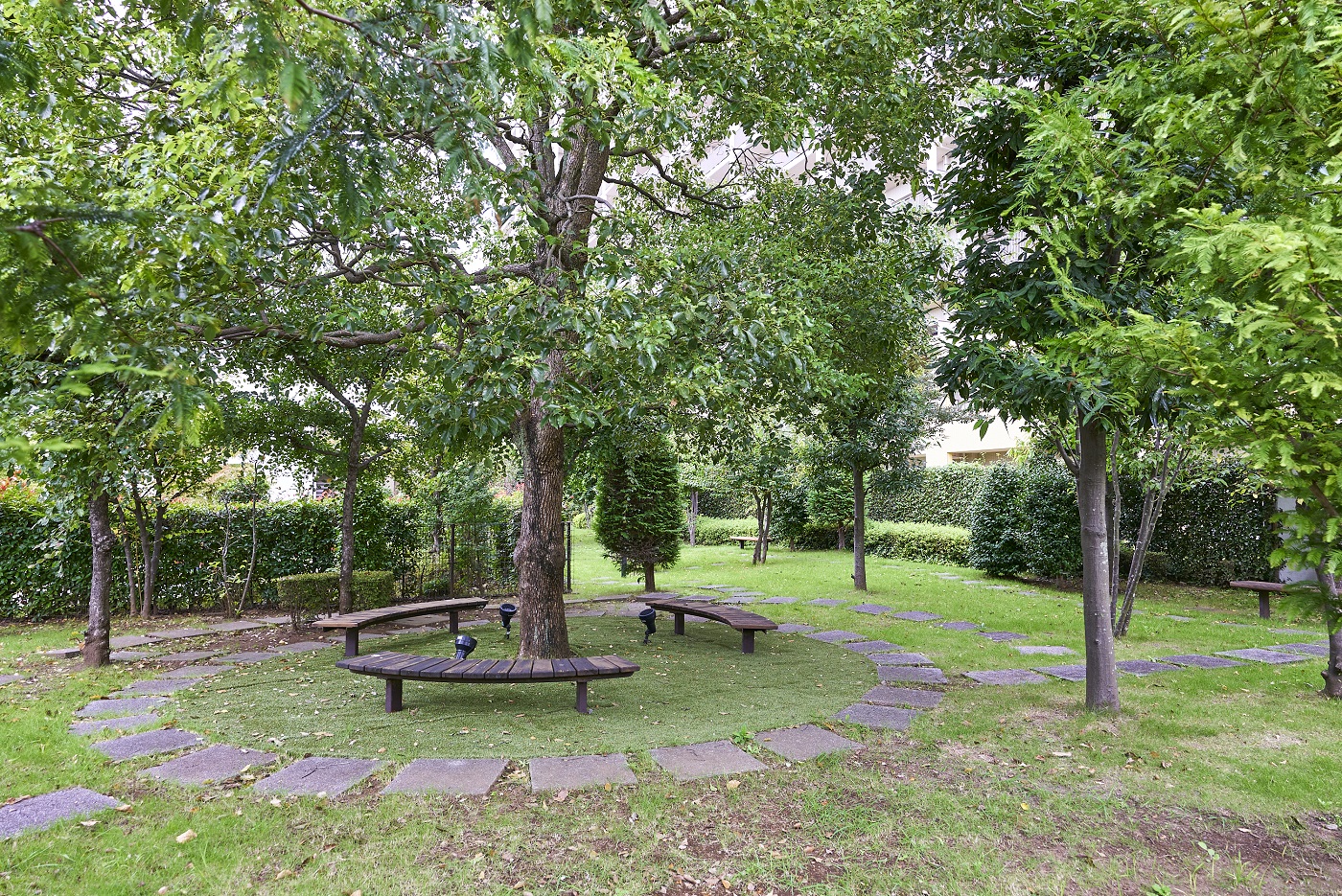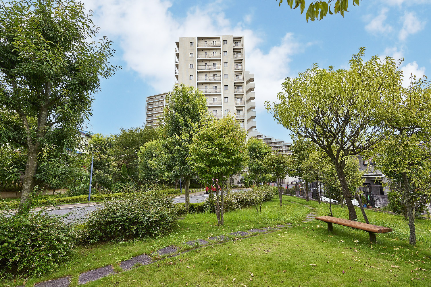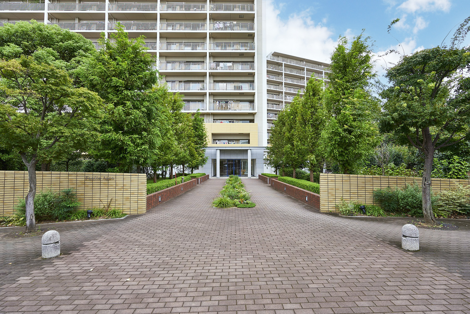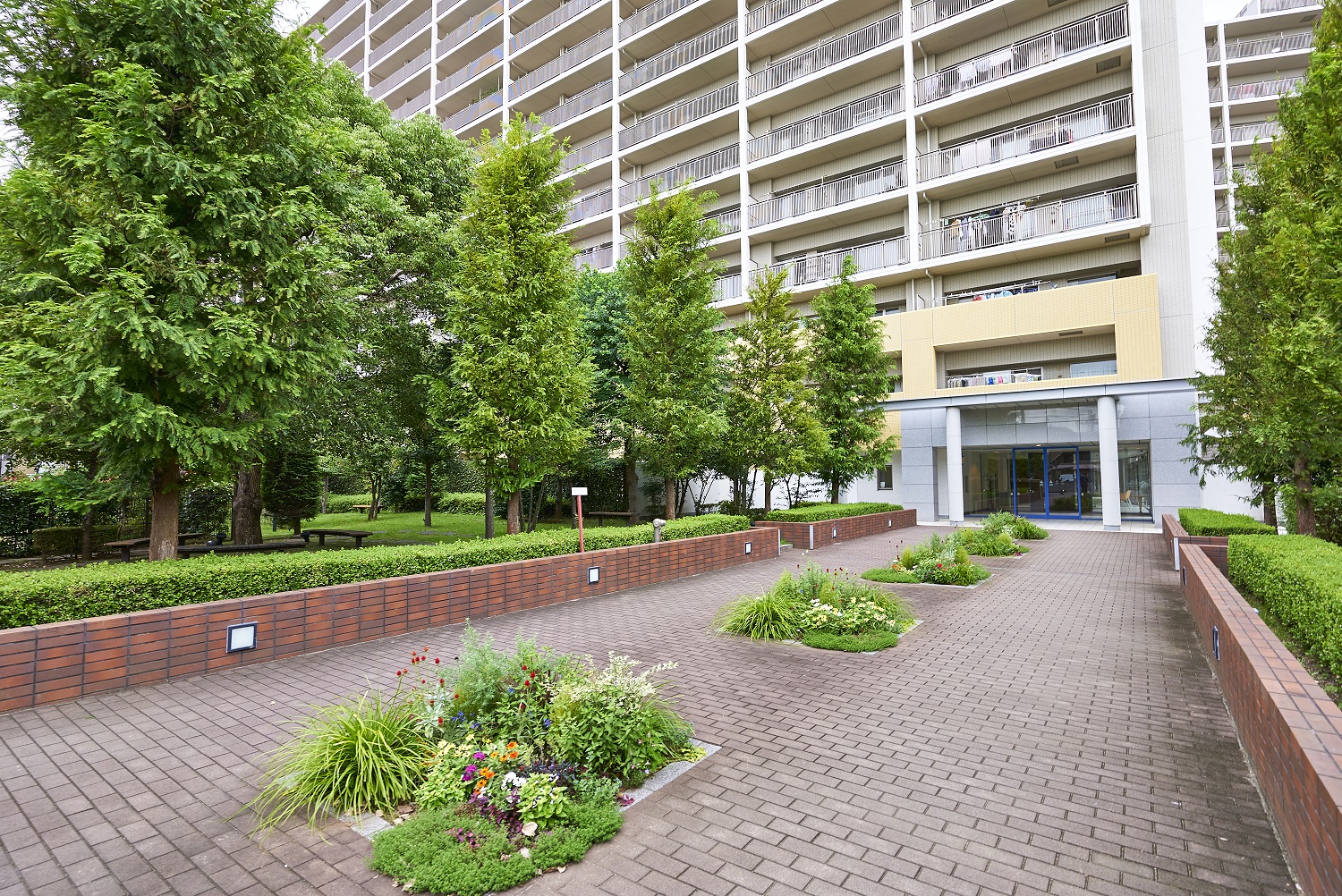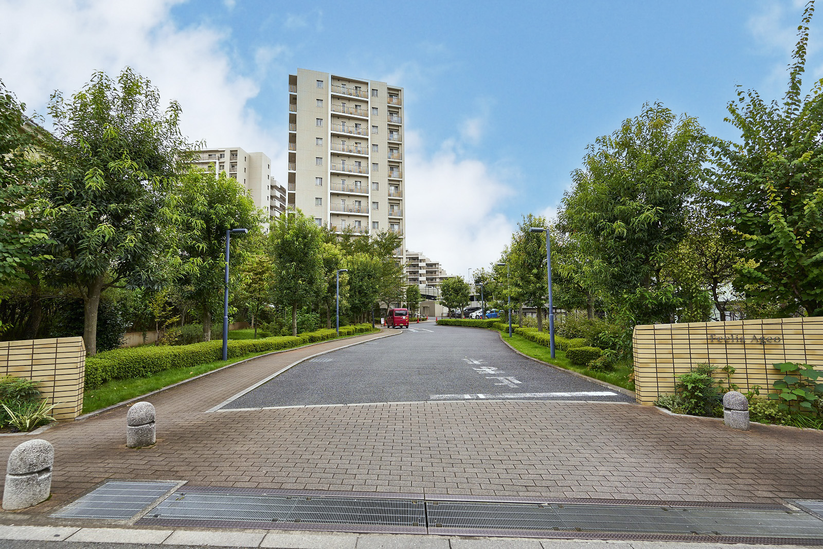 グランド・エントランスへと続くやすらぎへのプロローグとして。両わきのメタセコイヤの並木が大きなゲートのように住まう人をやさしくつつみこみ、それぞれの住まいへと導きます。