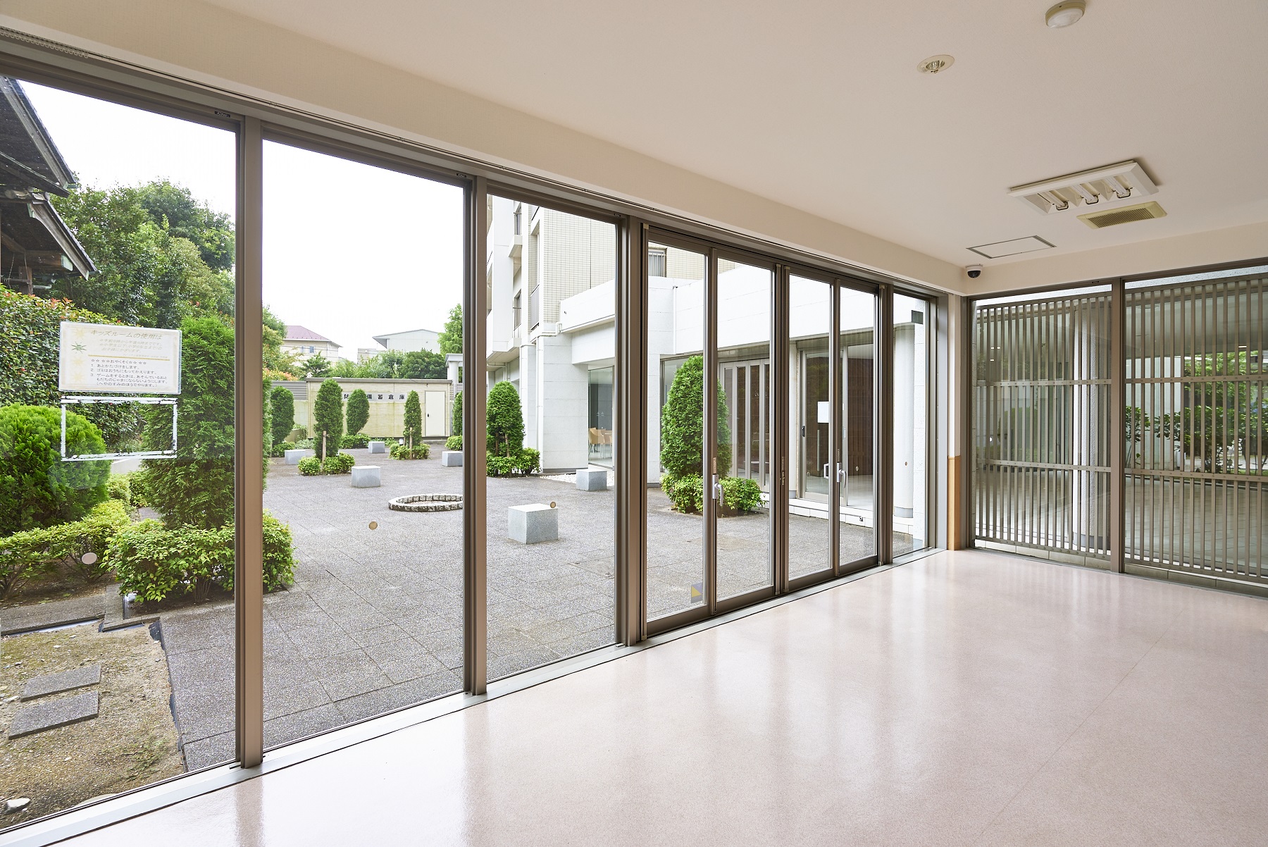 子供が雨の日でも遊べるスペース。半開放型で明るい空間に、ソフトな素材の床で、安心な空間です。