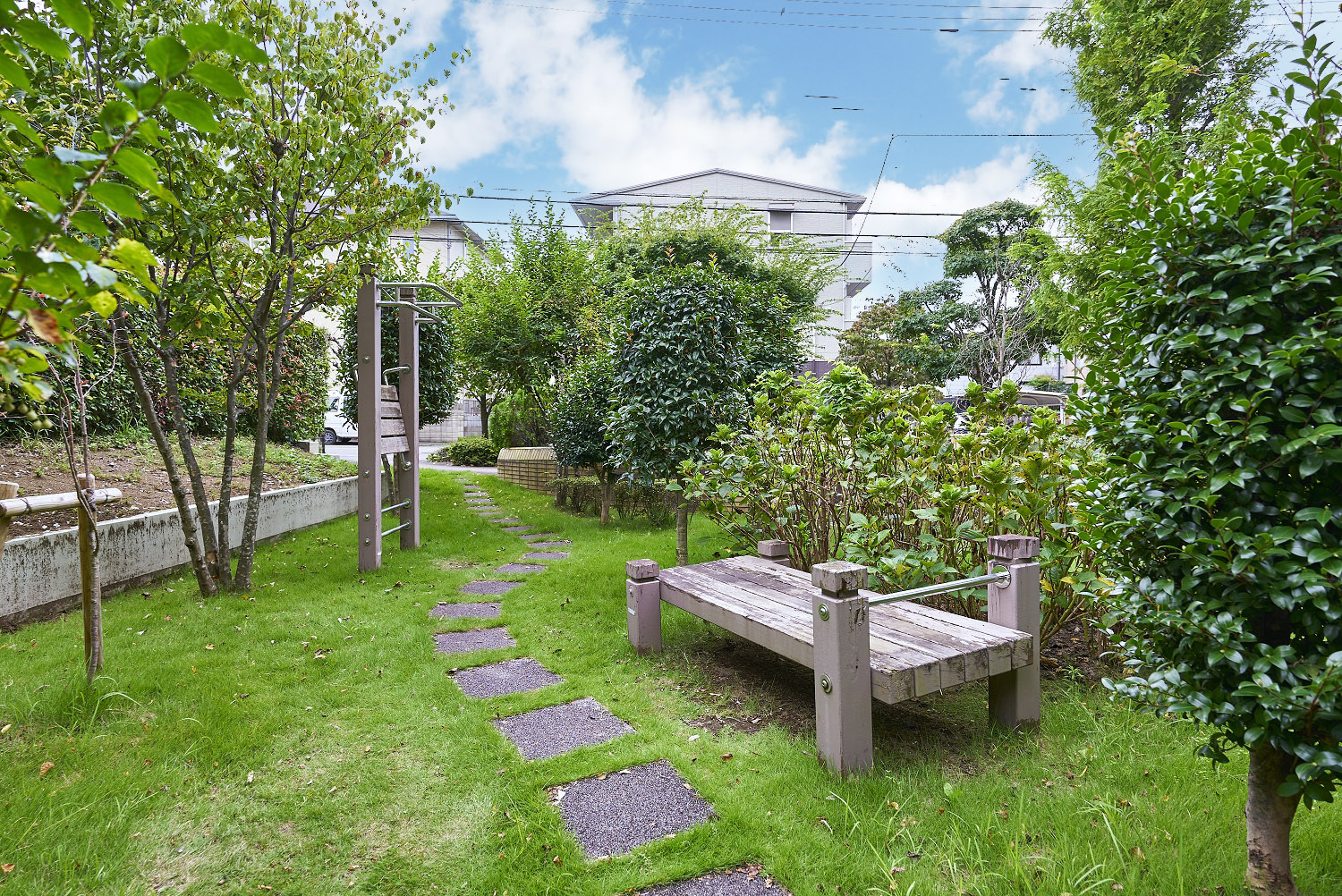 自然にうまく溶け込んだ木製遊具が設置された「ファミリー・フィールド」。やさしい木々のぬくもりが心をフレッシュに、体をのびやかにリラックスさせます。