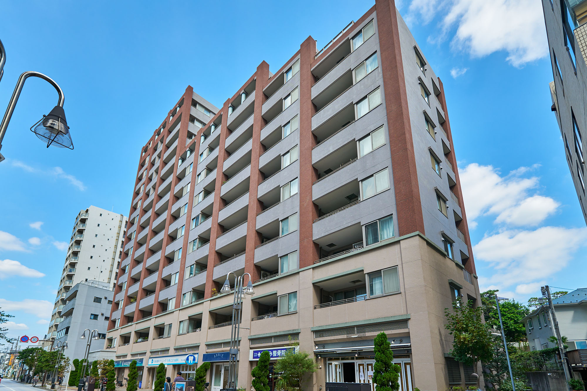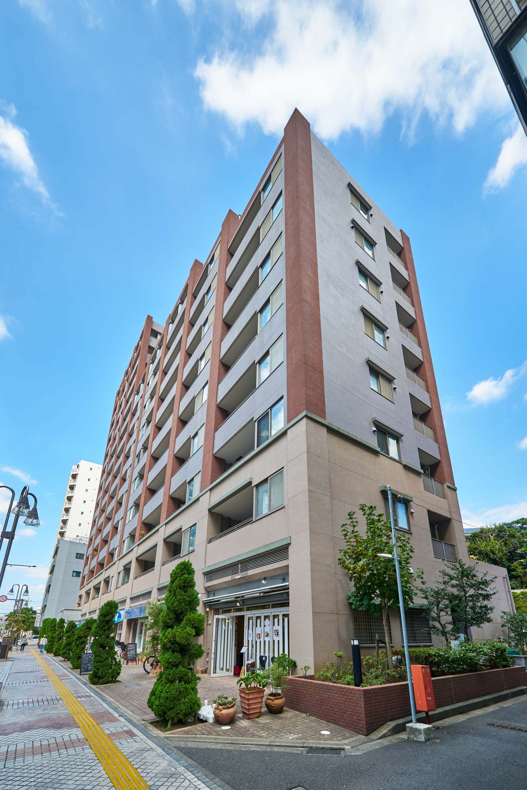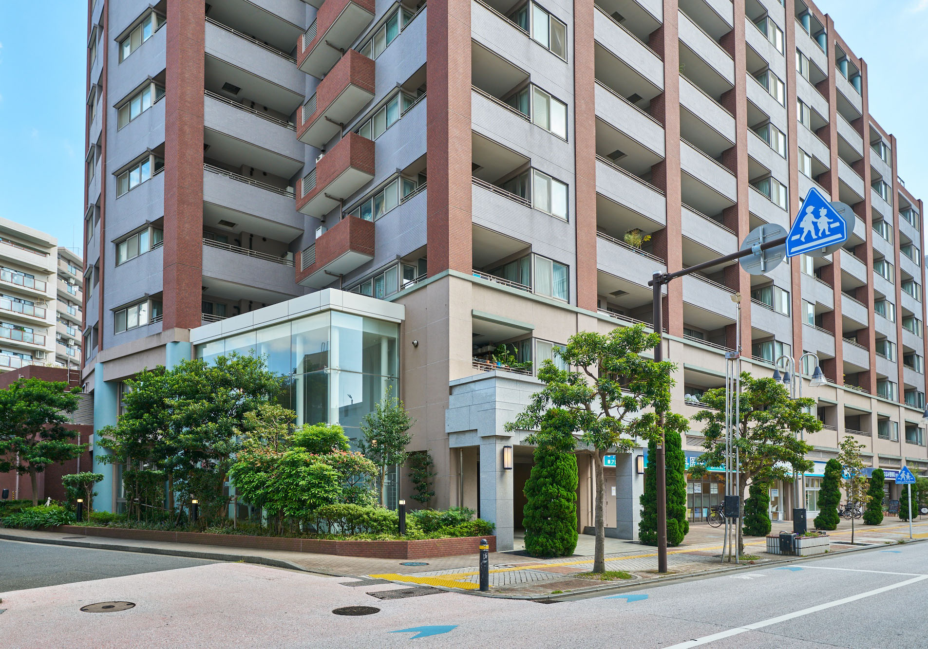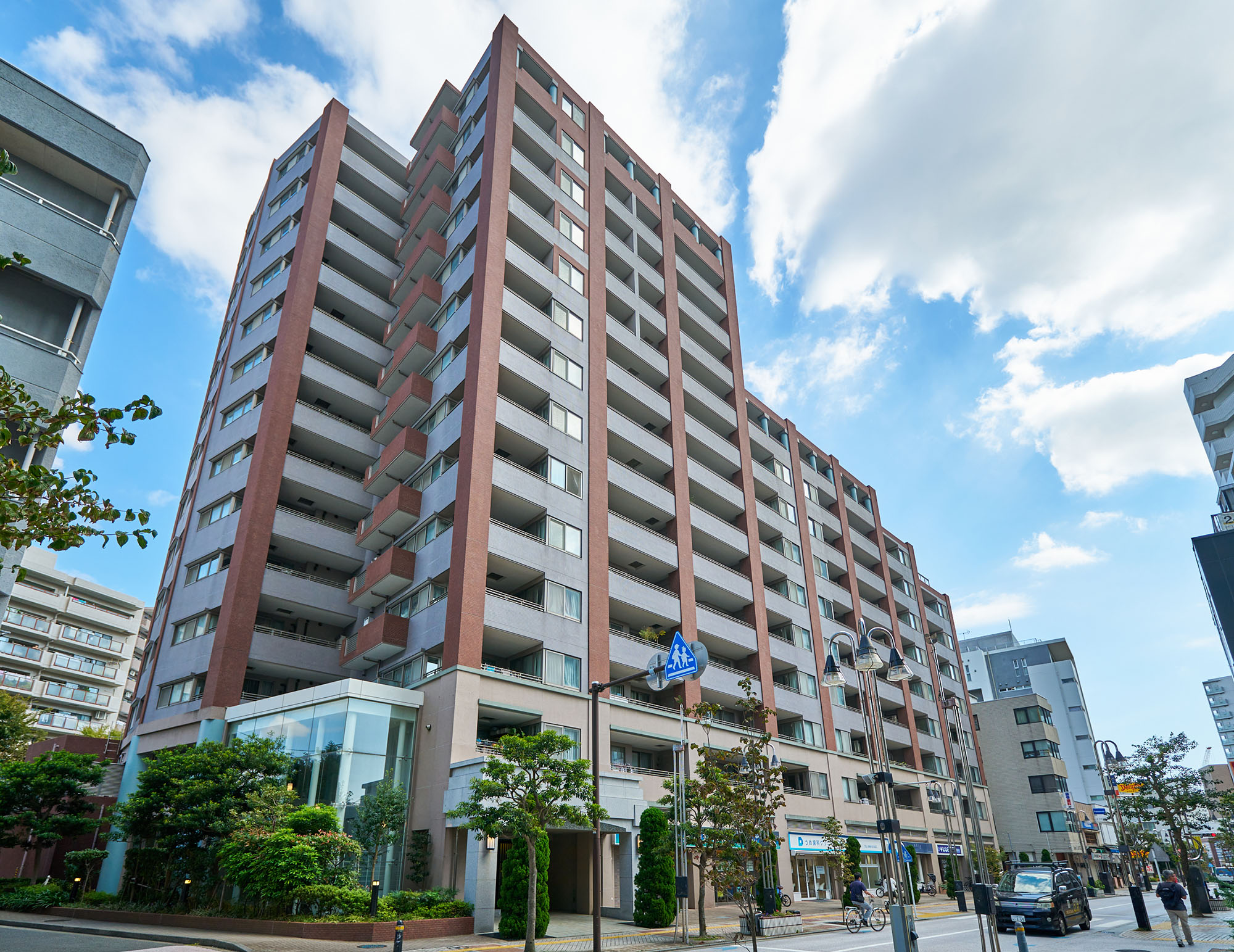 邸宅と呼ぶにふさわしい大型マンションであるために追求したのは、この街の歴史を映す、どこか懐かしささえ感じる建築美。石、タイル、ガラス、アイアンなど、多彩なテクスチャーを巧みに活かし、遠くから見たスタイルにも、間近に見たディテールにもこだわりが感じられます。意匠は上質感を醸し出す落ち着きに満ちたカラーで全体を統一し、空に向かってまっすぐに縦のラインが伸びる高層住棟ならではのデザインに。アクセントとして添えたグリーンは、洗練されたイメージをさりげなく伝えています。また、低層階には石の趣きを表現した素材を用いて重厚感を演出。空を見上げると、そこに広がるのは圧倒的にそびえ建つ誇らかな景観。古くから大切に残されてきたような、その凛としたフォルムは、近代的な建築物が並ぶこの街に引き立ち、街ゆく人々の目を惹きながら、おおらかに佇んでいます。