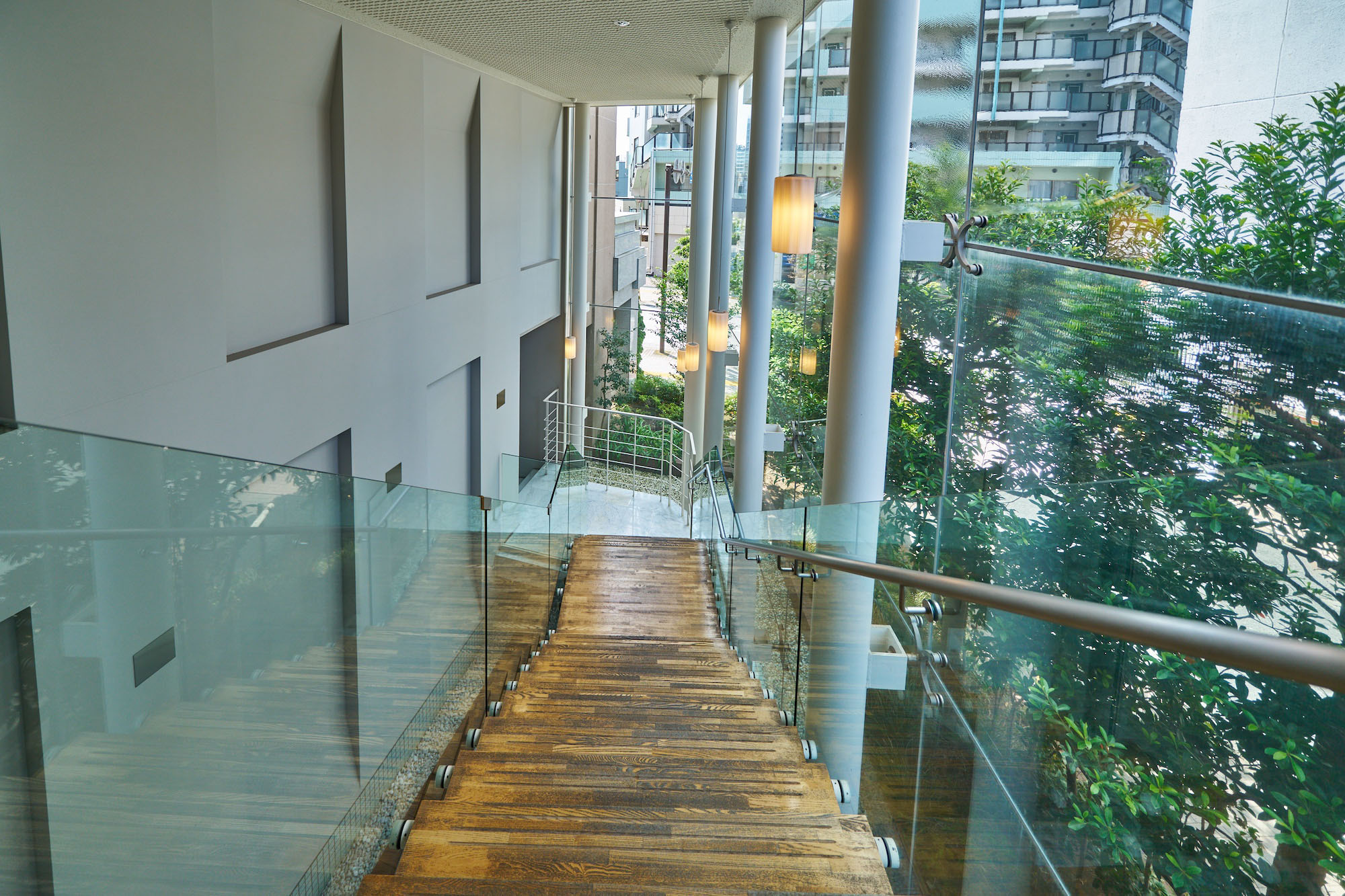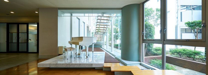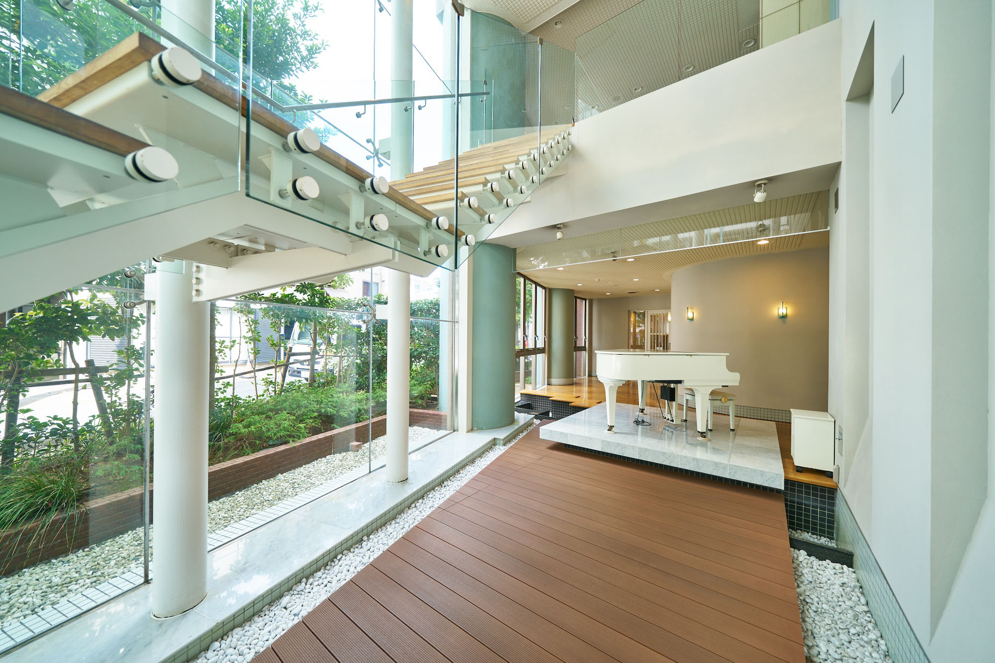 住棟の1・2階は2層吹抜の開放的な空間となっており、そこに贅沢なほどの共用スペースが用意されています。オーナーを迎え、ゲストを招く「エントリー・コート」は、歴史的建造物を思わせるフォルムに、瀟洒な装い。格調高い雰囲気は住まう方のステイタスを確かに満たし、訪れたゲストや通りゆく人々の心に印象づけます。エントランスホールの先に広がる「アクア・ラウンジ」は、ガラスのカーテンウォールからあざやかに光が差し込む、透明感あふれる空間。都市生活を潤すとっておきのオアシスのように、気持ちをナチュラルに戻し、やすらぎに満たされる開放的な空間演出が施されています。さらに、空中に浮かぶように設置されたクリアな階段を上がると、静謐な落ち着きと大人の趣きに彩られた「オーナー・ラウンジ」と、爽やかで開放的に広がる「キッズ・キューブ」が設けられています。雨の日でも自由に遊び、安心してはしゃぎ合う子どもたちの様子を見守りながら、ラウンジのソファでゆったりとくつろぐ大人たち。そんなライフシーンを描けるように、レイアウトにもこだわって共用空間が設計されています。