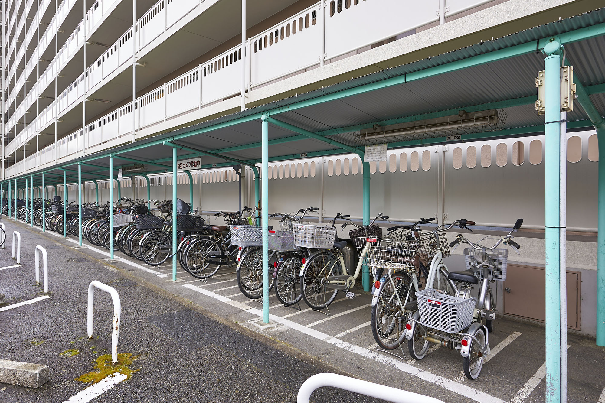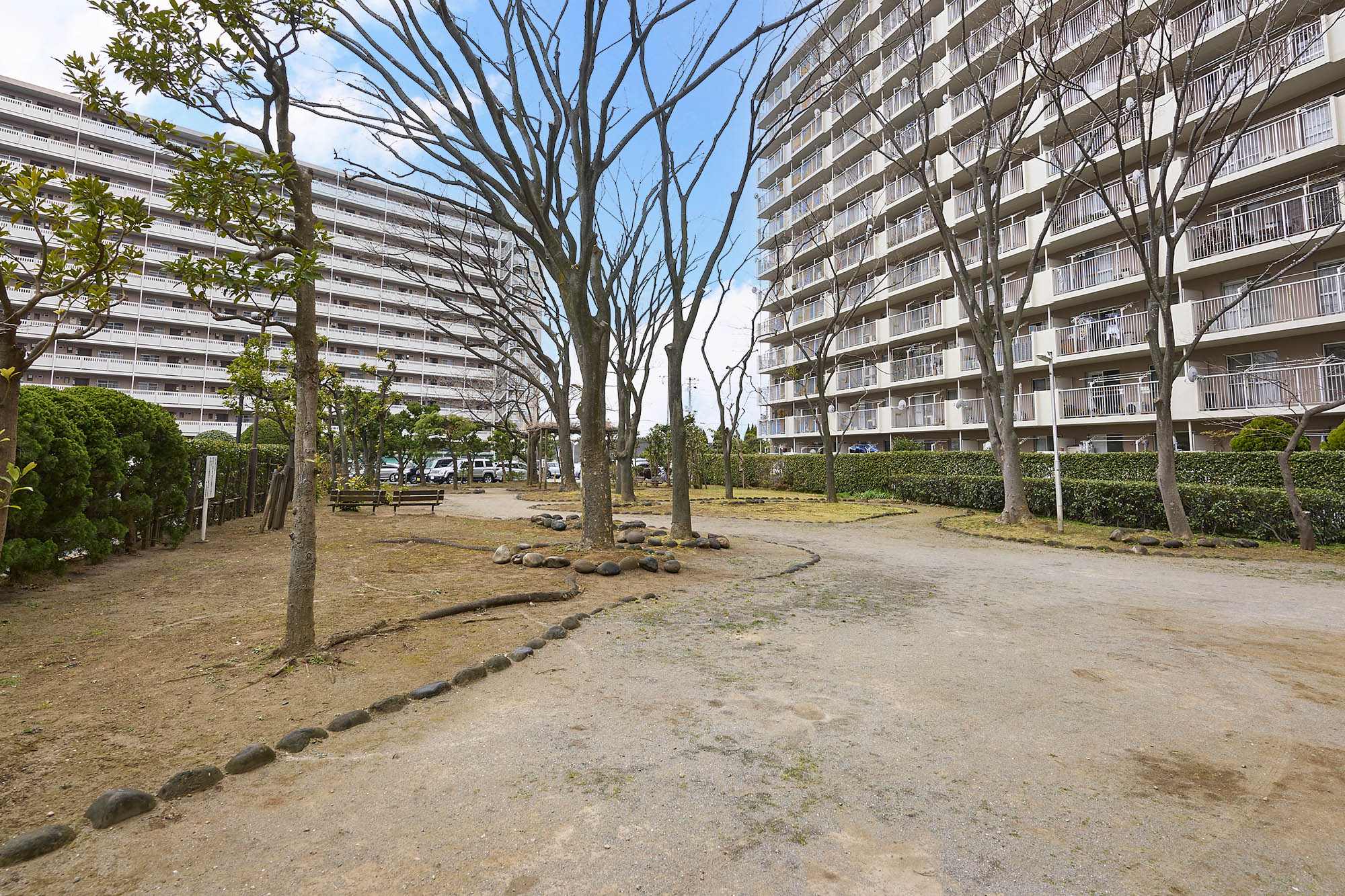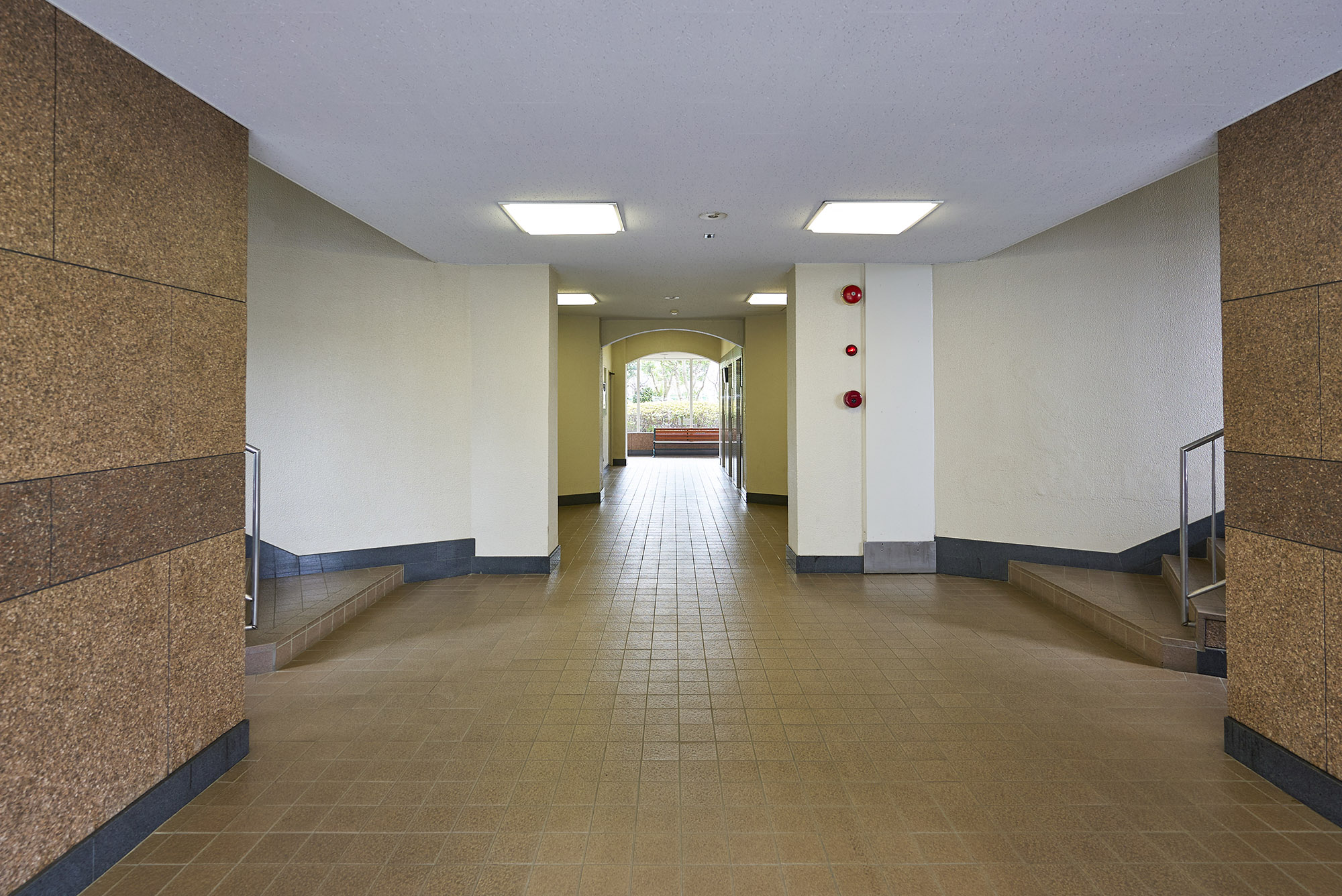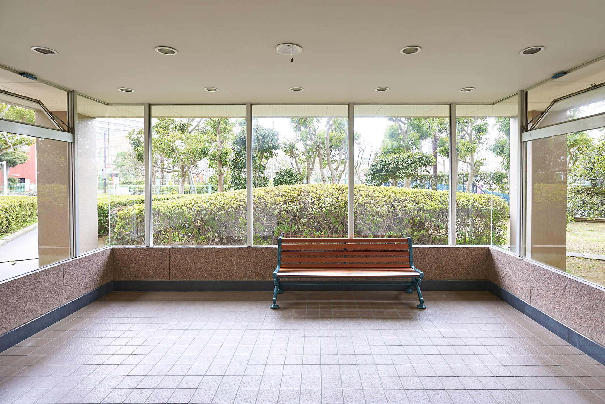 各棟のエントランスには、明るくレトロで可愛らしい雰囲気の待合スペースが配されています。1号棟と2号棟の間には広々とした緑豊かな中庭があり、陽光と緑に満たされた憩いの空間です。植栽も多く施され、穏やかでゆとりのある共用スペースが用意されています。