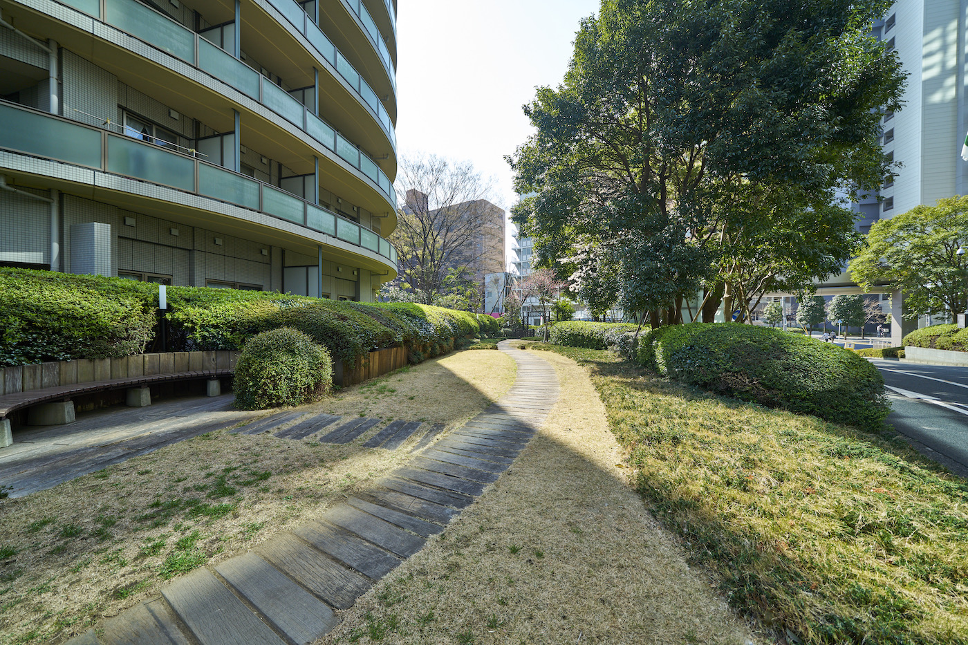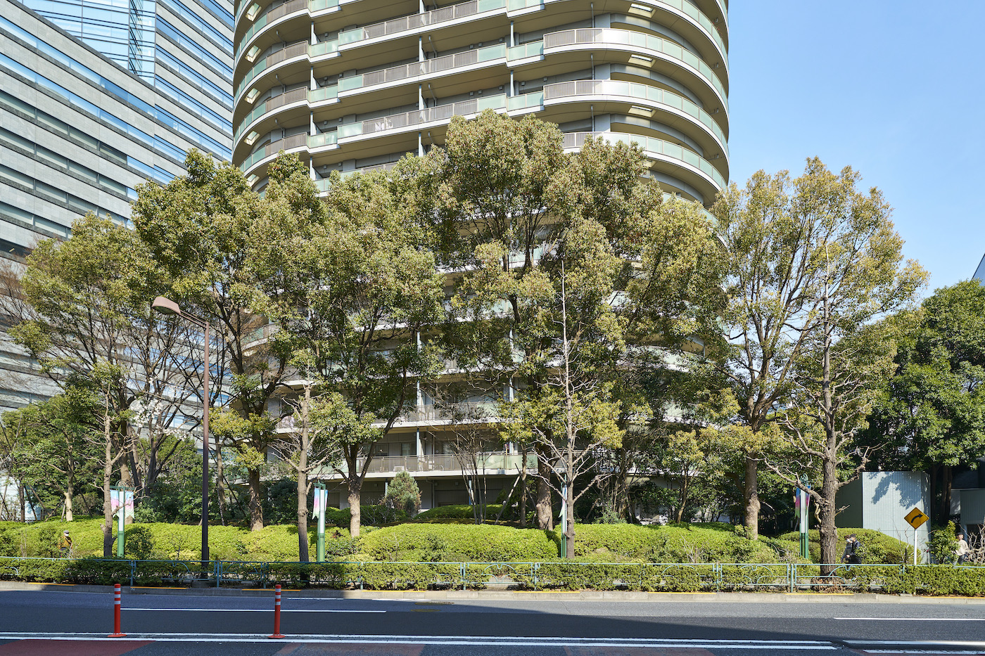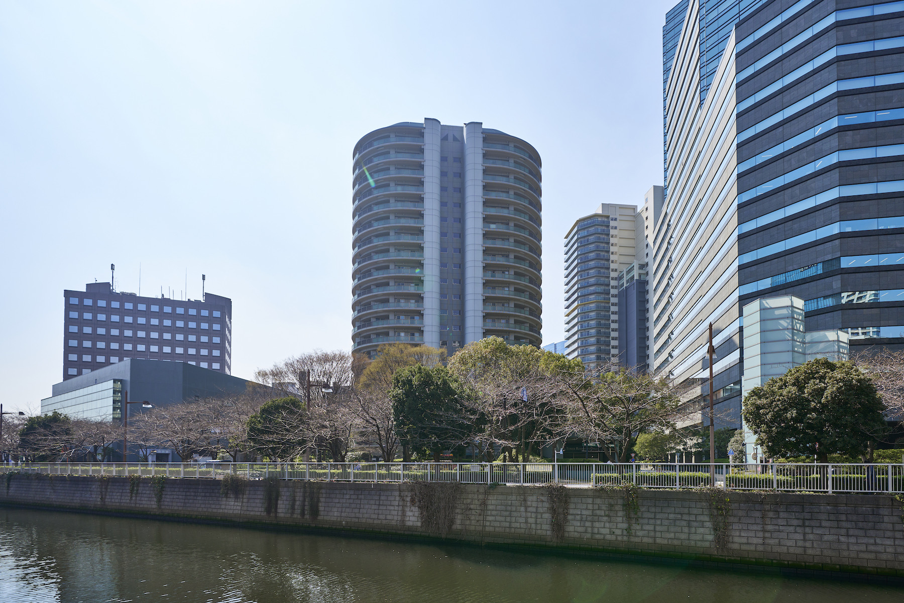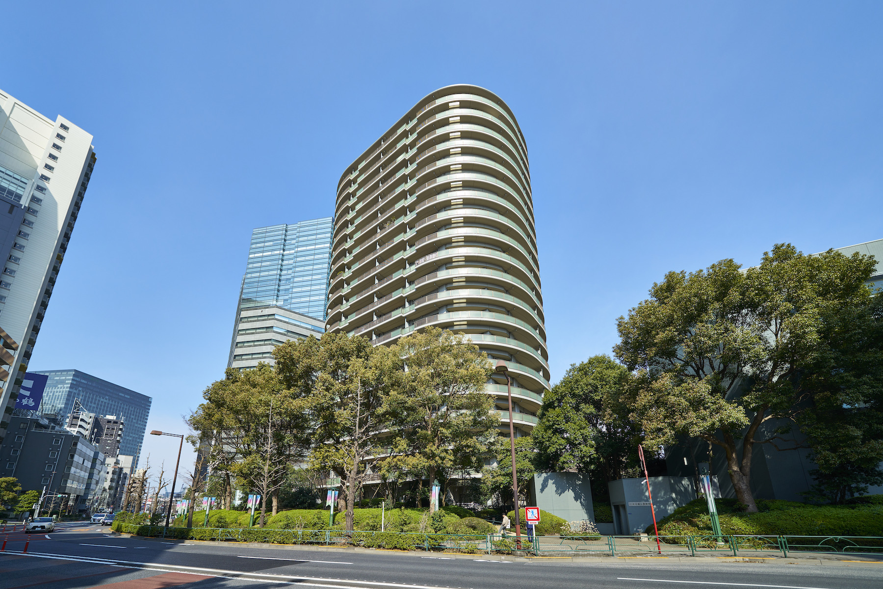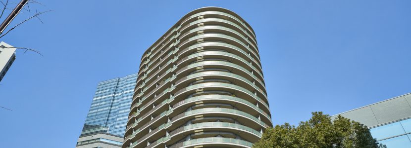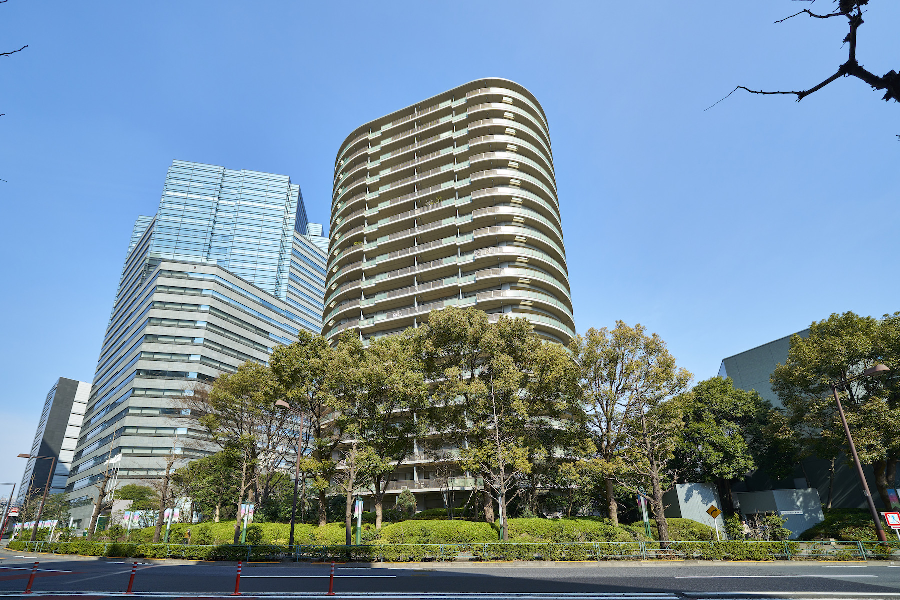 駅直結の巨大複合機能都市「ゲートシティ大崎」の住居棟として建てられた「ゲートシティ大崎サウスパークタワー」。柔らかな曲線を用いた独特のフォルムに、足元には豊かな緑を纏い、バルコニーには乳白のグリーンガラス手摺りが施されたシンメトリーな外観デザイン。多くのビルが立ち並ぶ中で一際存在感を放ちながら、目黒川沿いに悠々と佇んでいます。