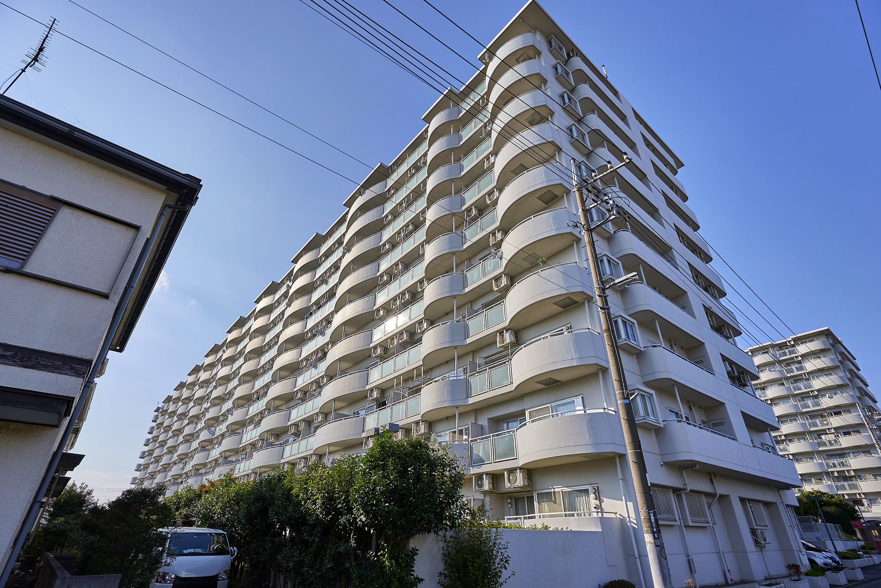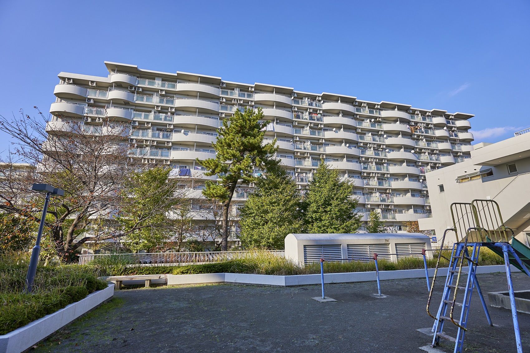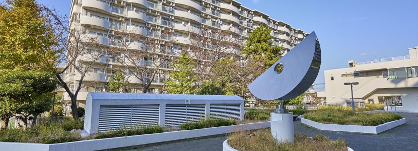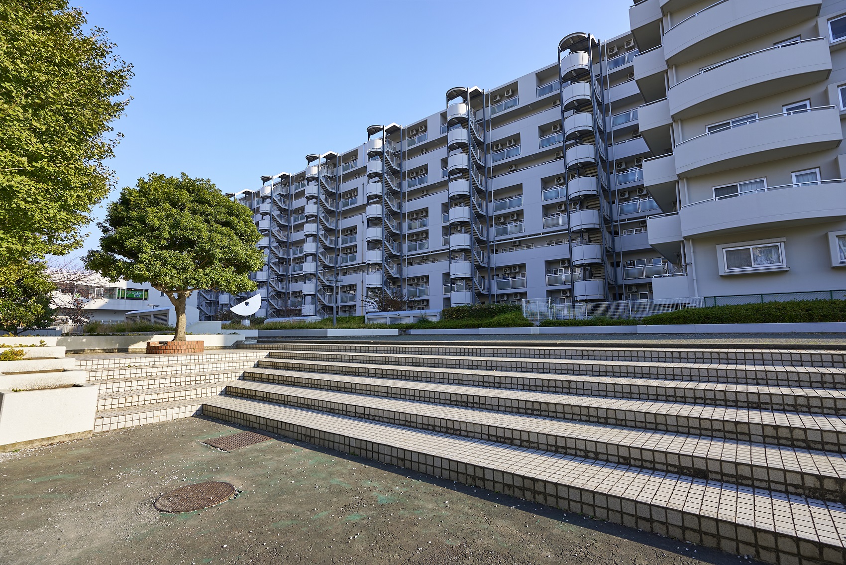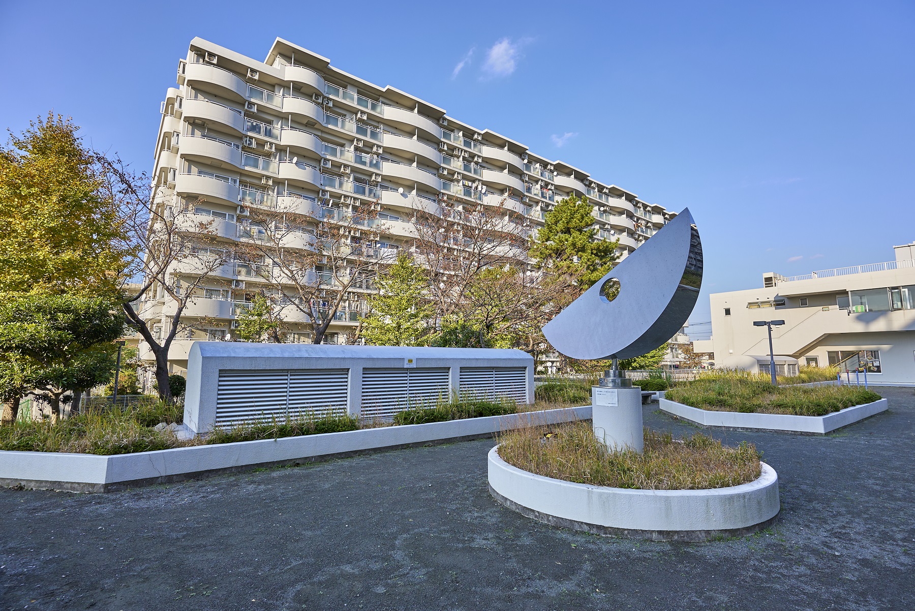 ラウンド型のバルコニーによって、波を打つようなフォルムが特徴的な外観デザイン。2棟構成の大規模マンションでありながら、その柔らかい印象が圧迫感を軽減し、街並みに優しく溶け込んでいます。敷地中央には広場が設けられ、緑も多く配されており、穏やかで開放感のあるランドプランです。