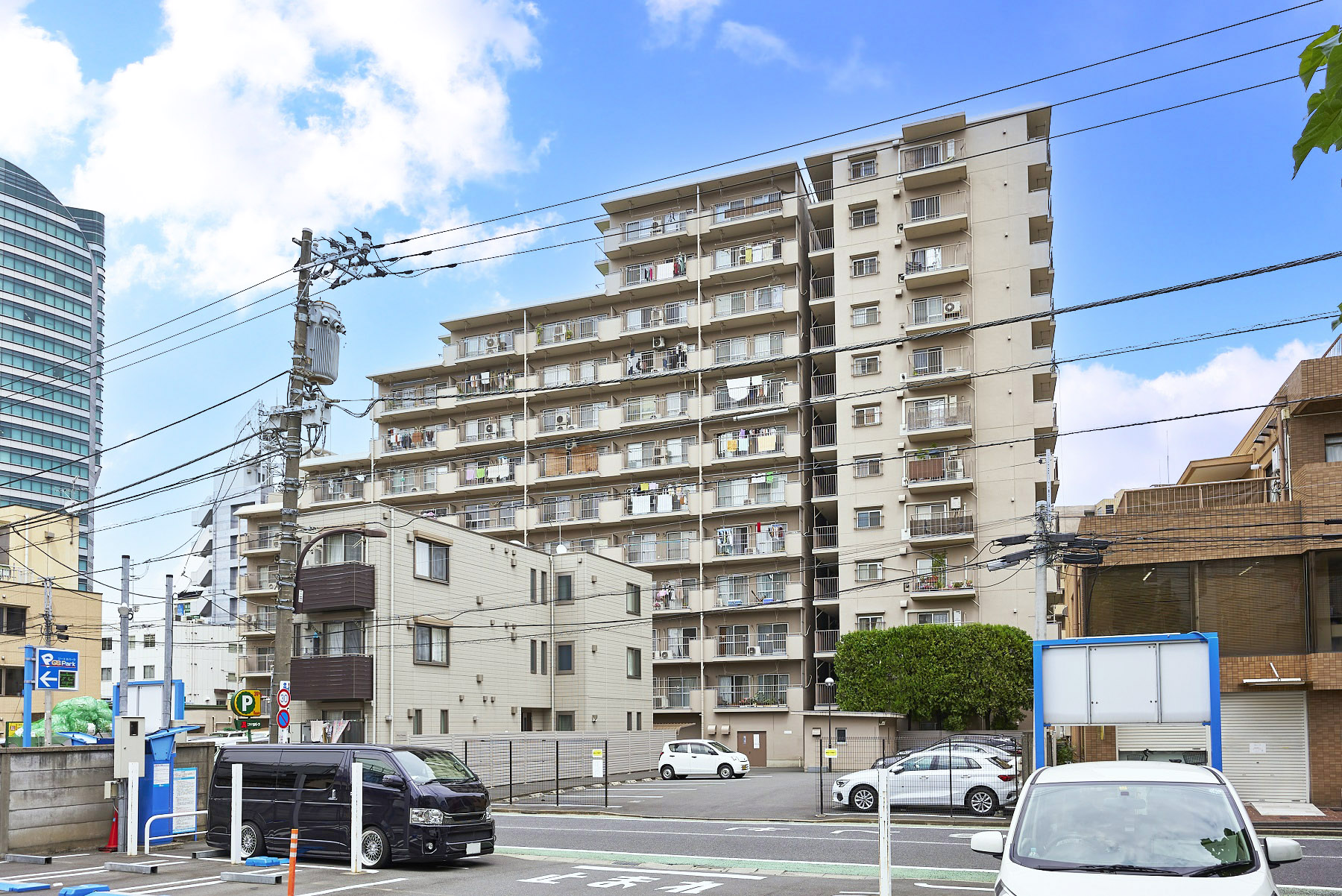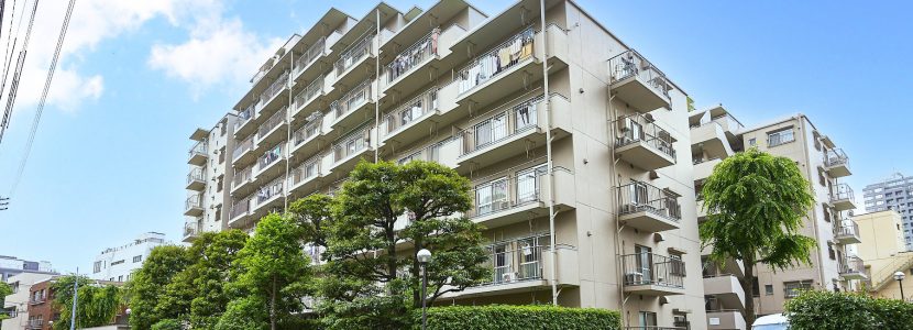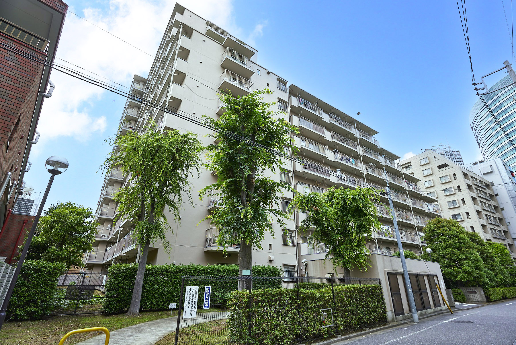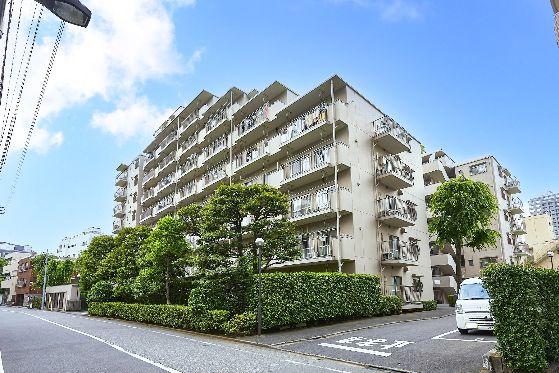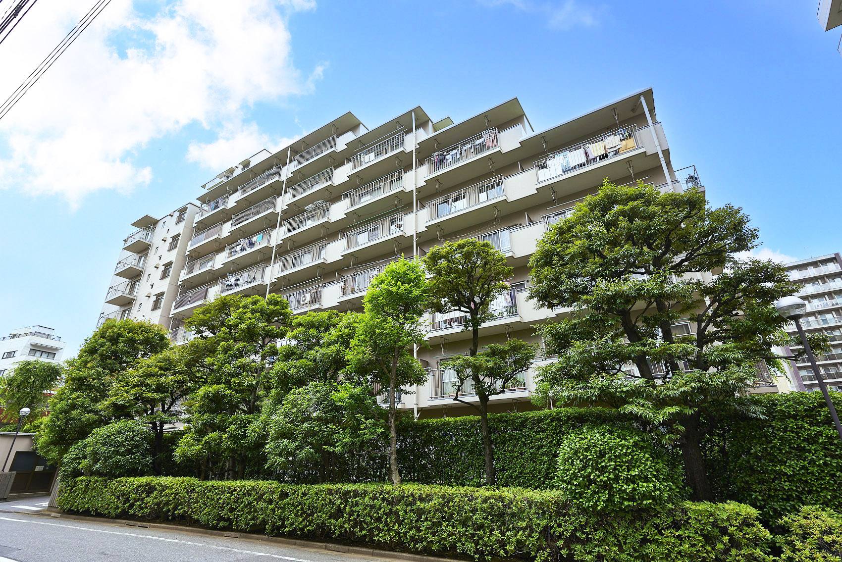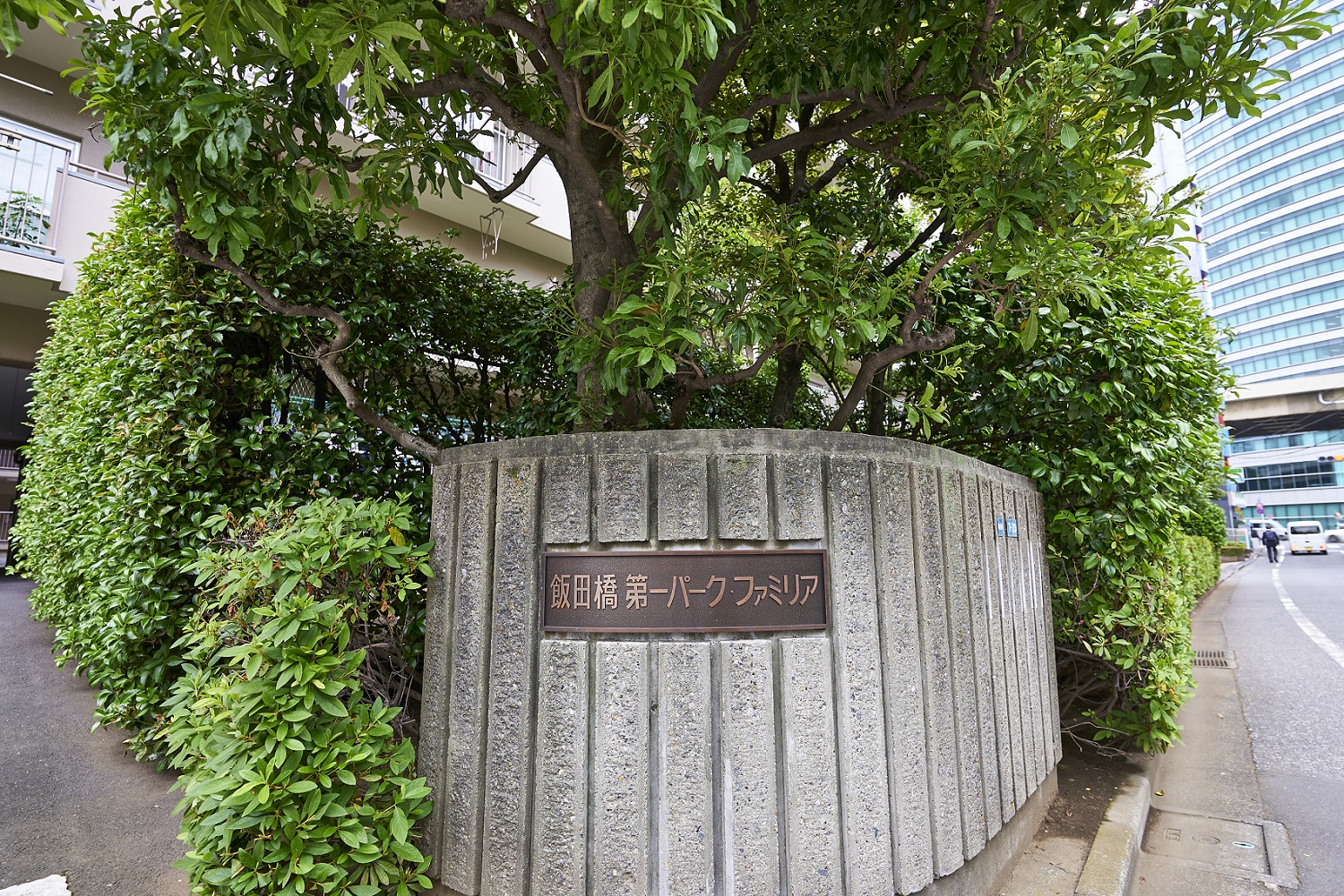 都心にありながら豊かな植栽を携えた「飯田橋第一パーク・ファミリア」。ベージュのシンプルな外壁に、緑が鮮やかに映えます。エントランスホールなどの共用部は、築年数が経ちながらも修繕や日々の清掃・管理できれいに保たれ、レトロで温もりを感じさせるデザインです。