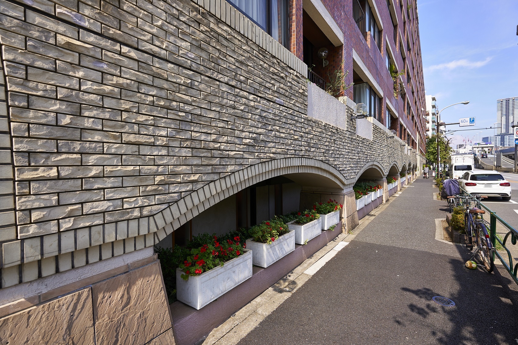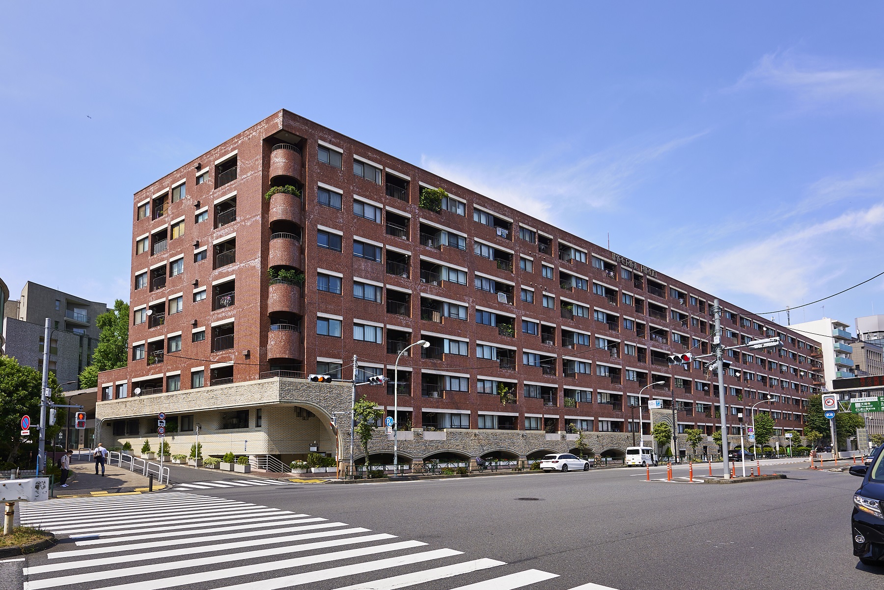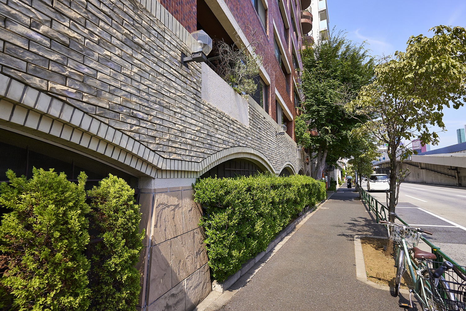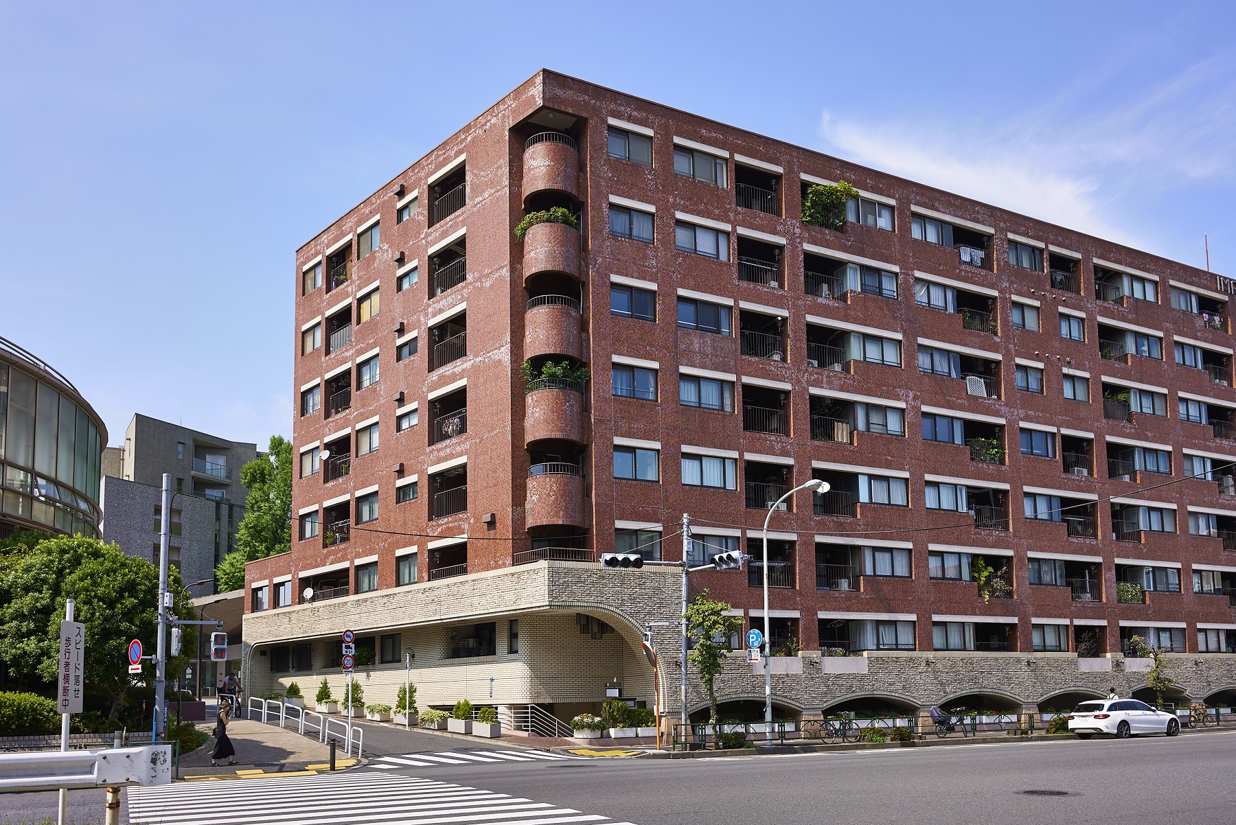 都心の街中に悠々と鎮座する貫禄あるフォルム。深いレンガ色のタイルを全身に纏ったシックな外観。基壇部は重厚感のある石造りで、アーチ状のエントランスやラウンド型のバルコニーなど、随所にクラシカルな意匠が施されています。時を経て味わいを増していく、まさにヴィンテージマンションです。