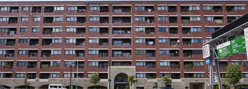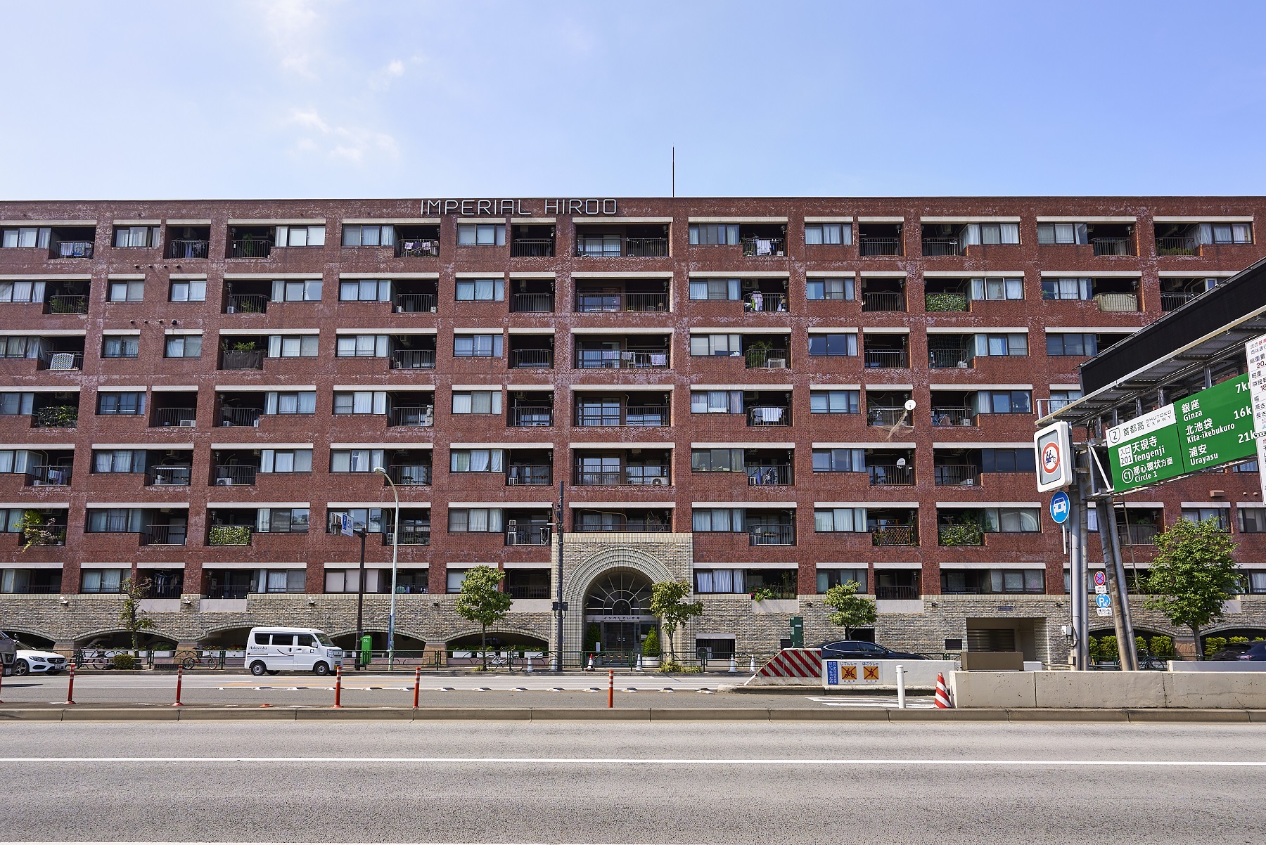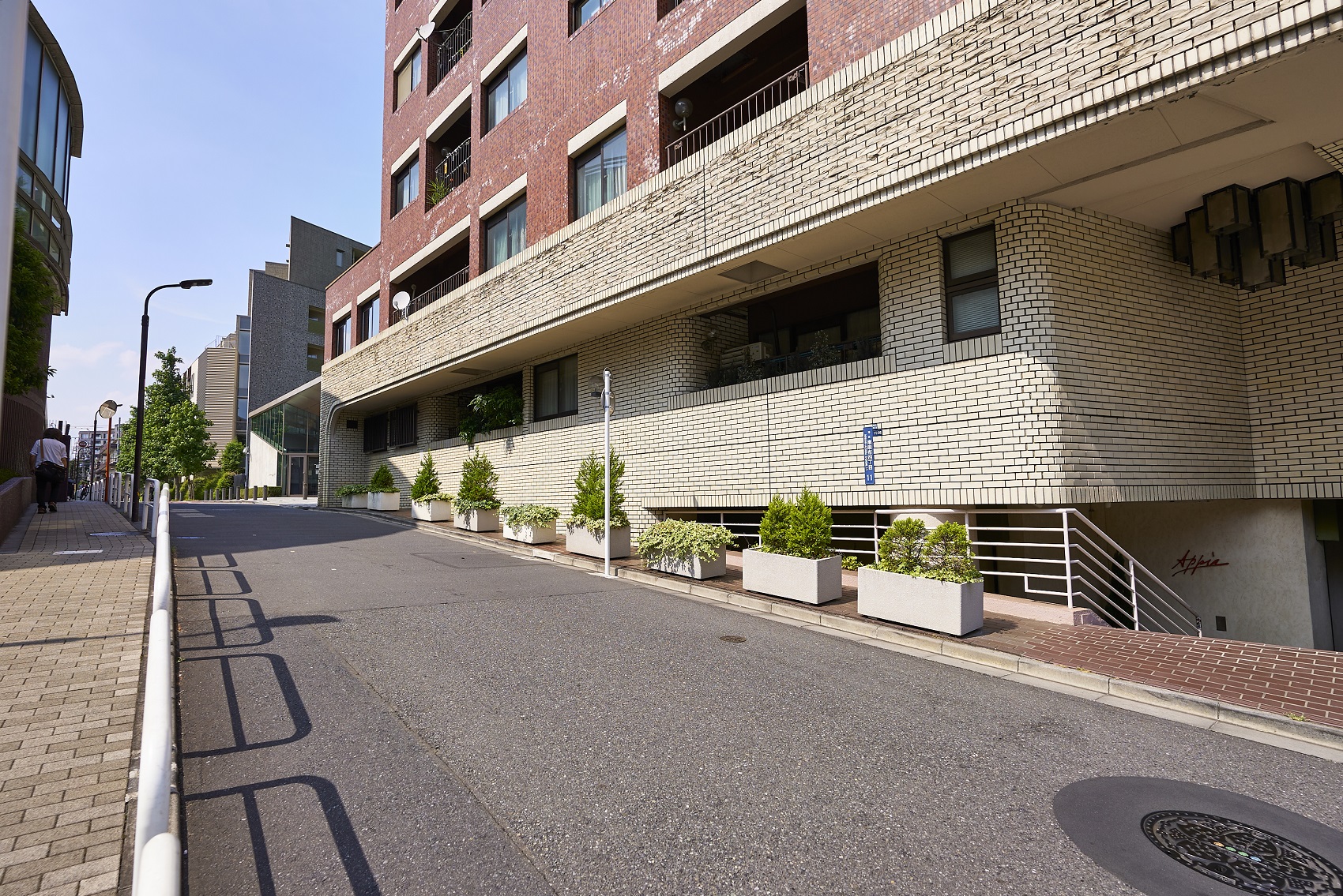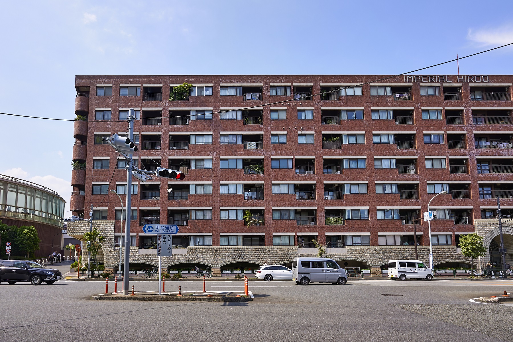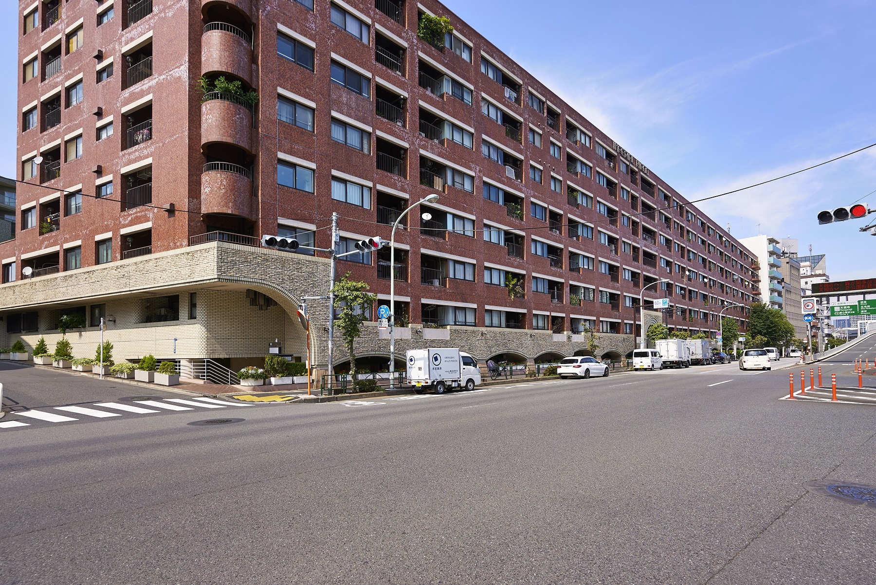 都心の街中に悠々と鎮座する貫禄あるフォルム。深いレンガ色のタイルを全身に纏ったシックな外観。基壇部は重厚感のある石造りで、アーチ状のエントランスやラウンド型のバルコニーなど、随所にクラシカルな意匠が施されています。時を経て味わいを増していく、まさにヴィンテージマンションです。
