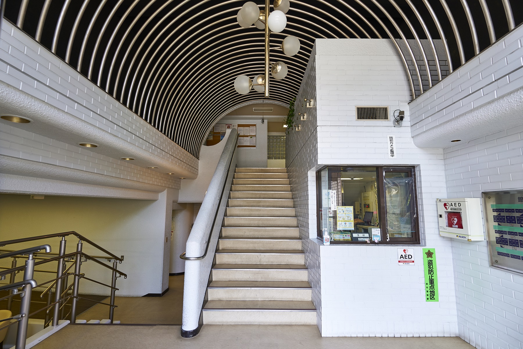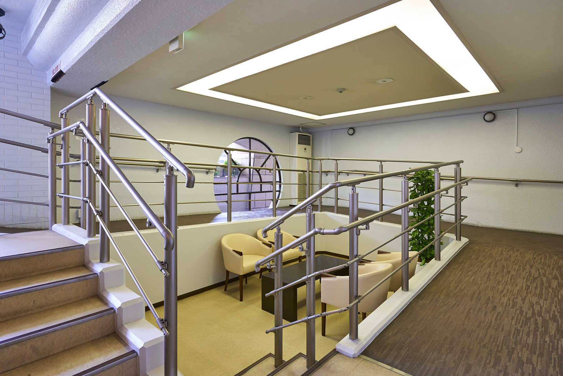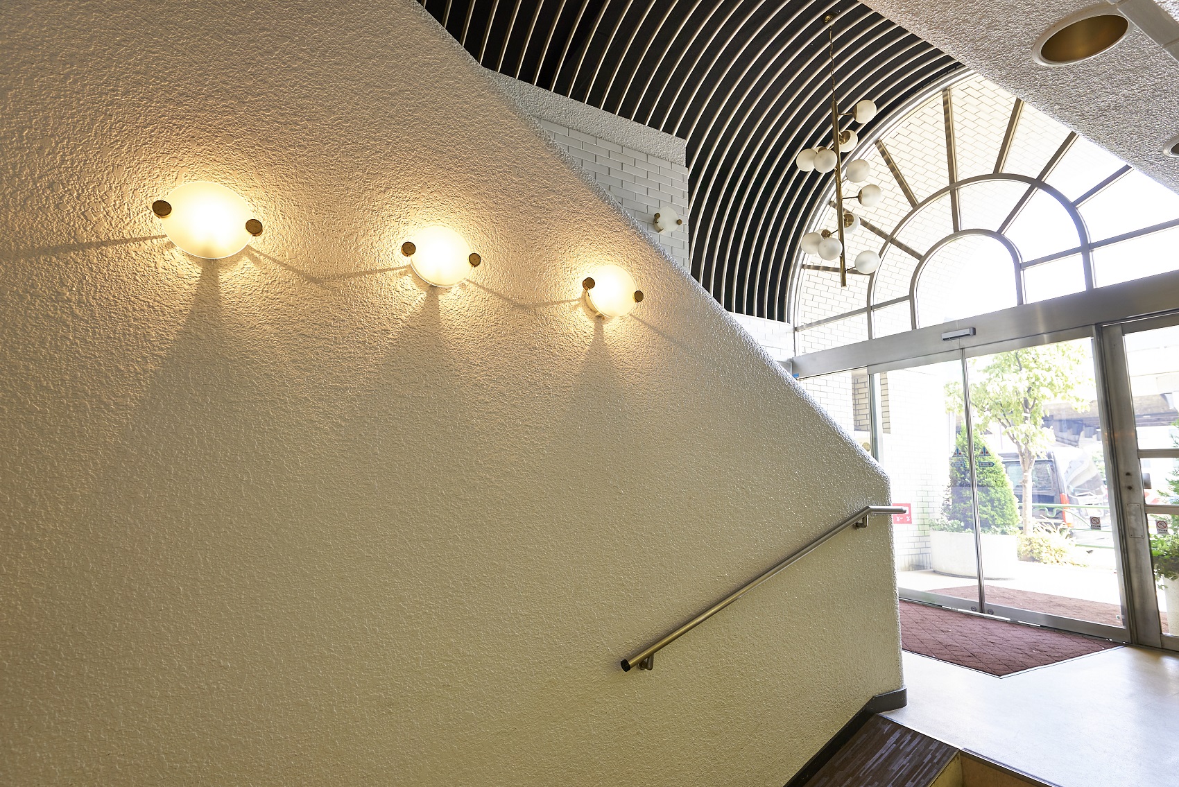 上部のガラス窓までアーチ状の意匠が施された貫禄あるエントランス。アーチは建物内へと続いており、吹き抜けのエントランスホールには瀟洒な照明と、2階へと伸びる階段が設けられています。その横には小さなラウンジを配備。自然光を採り入れる独特なデザインの丸窓やシックな家具が配され、限られたスペースながら落ち着きある空間となっています。