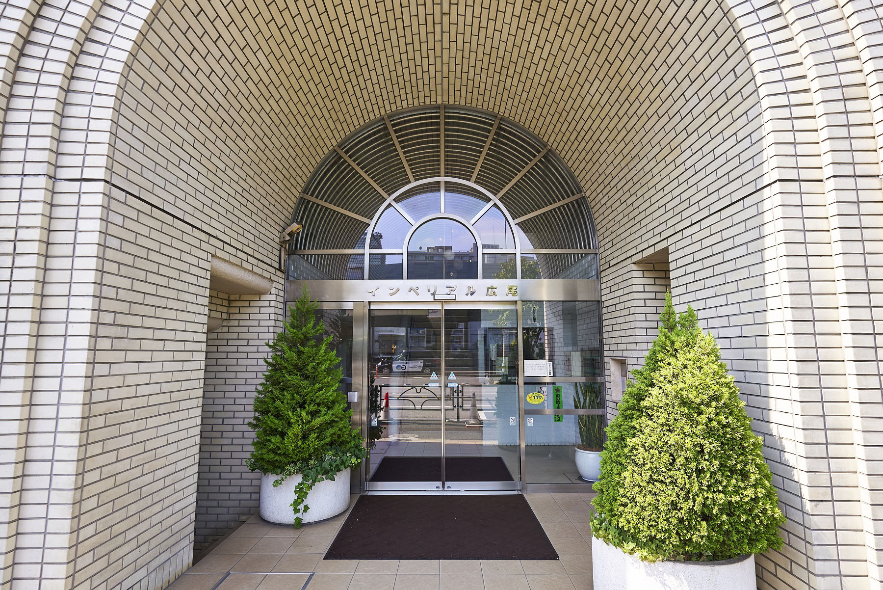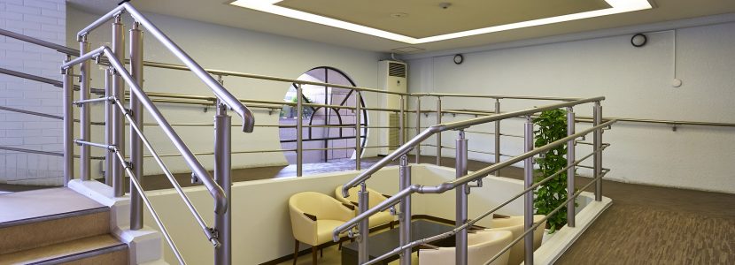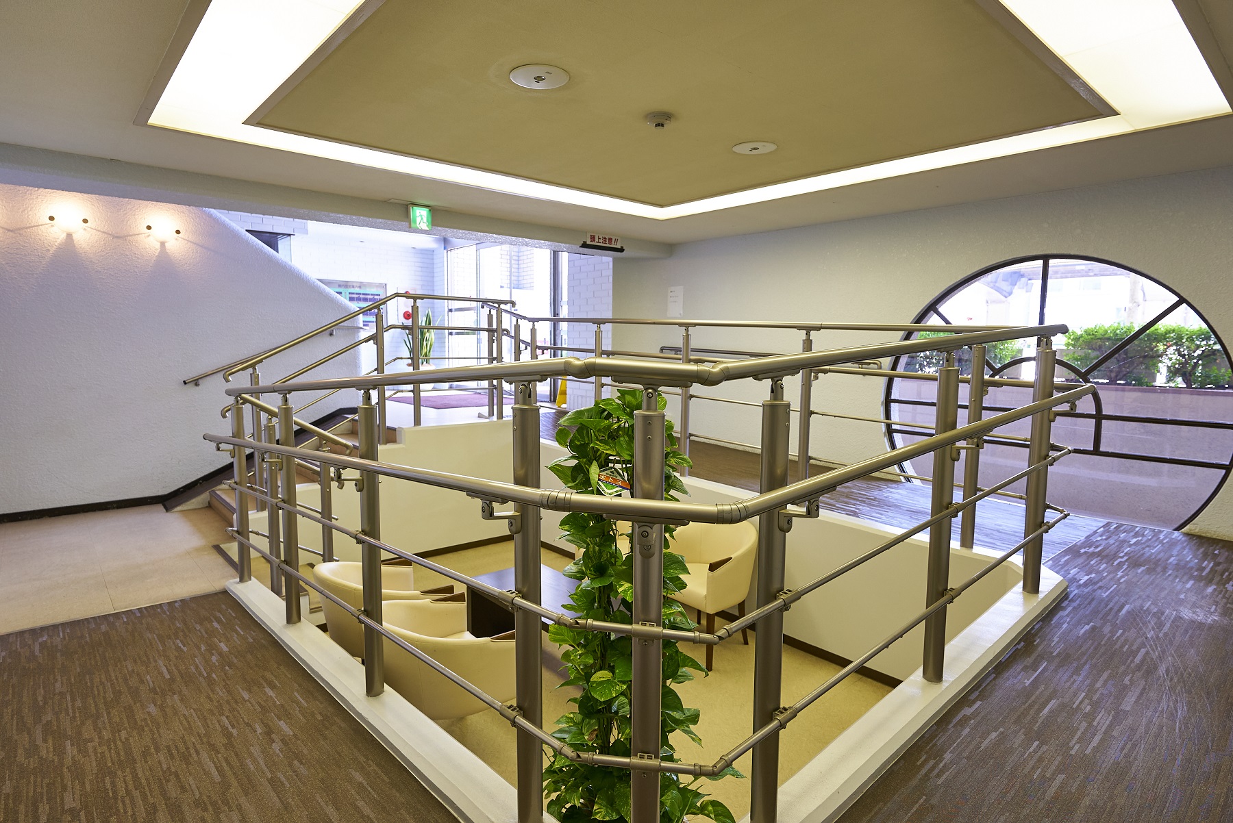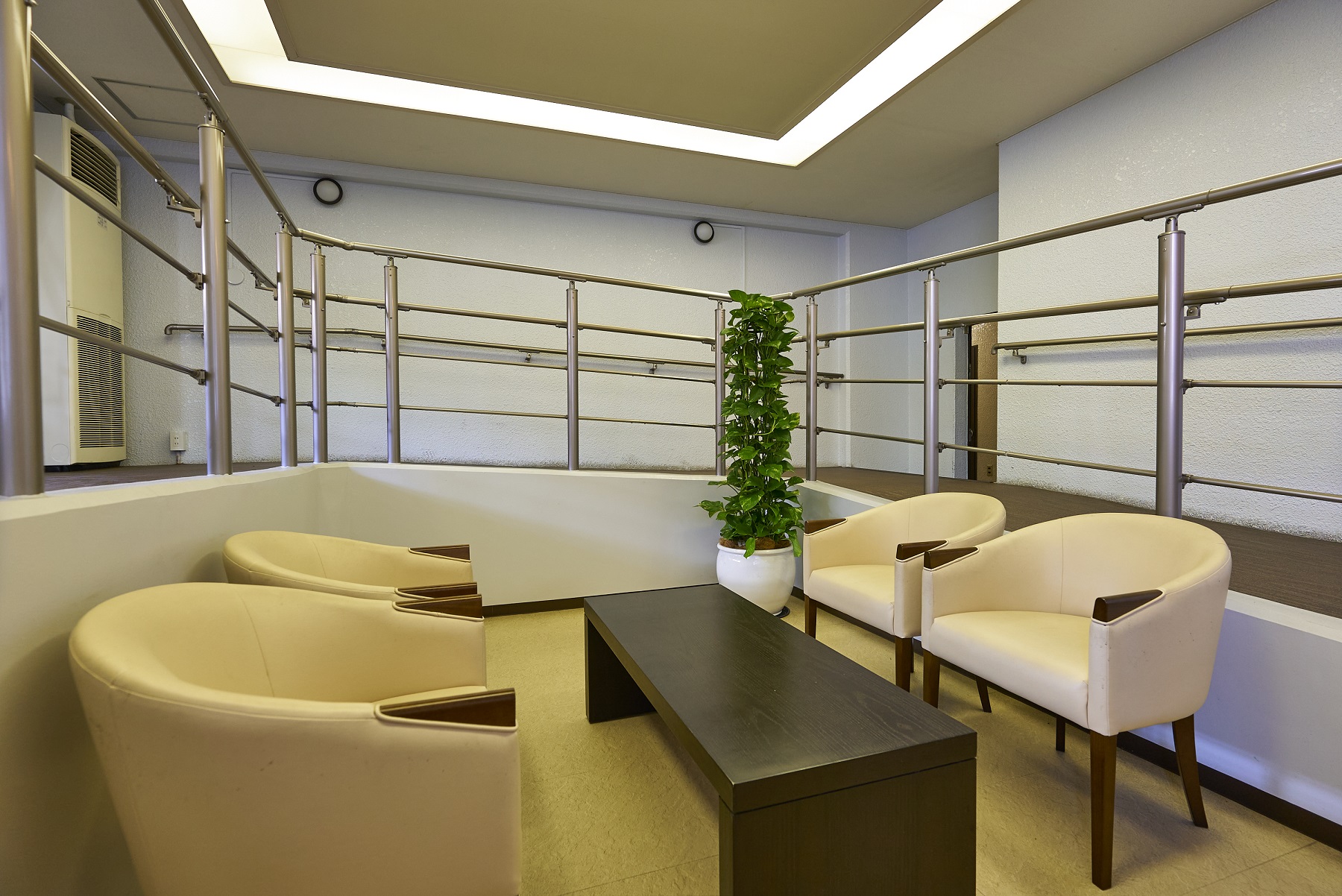 上部のガラス窓までアーチ状の意匠が施された貫禄あるエントランス。アーチは建物内へと続いており、吹き抜けのエントランスホールには瀟洒な照明と、2階へと伸びる階段が設けられています。その横には小さなラウンジを配備。自然光を採り入れる独特なデザインの丸窓やシックな家具が配され、限られたスペースながら落ち着きある空間となっています。