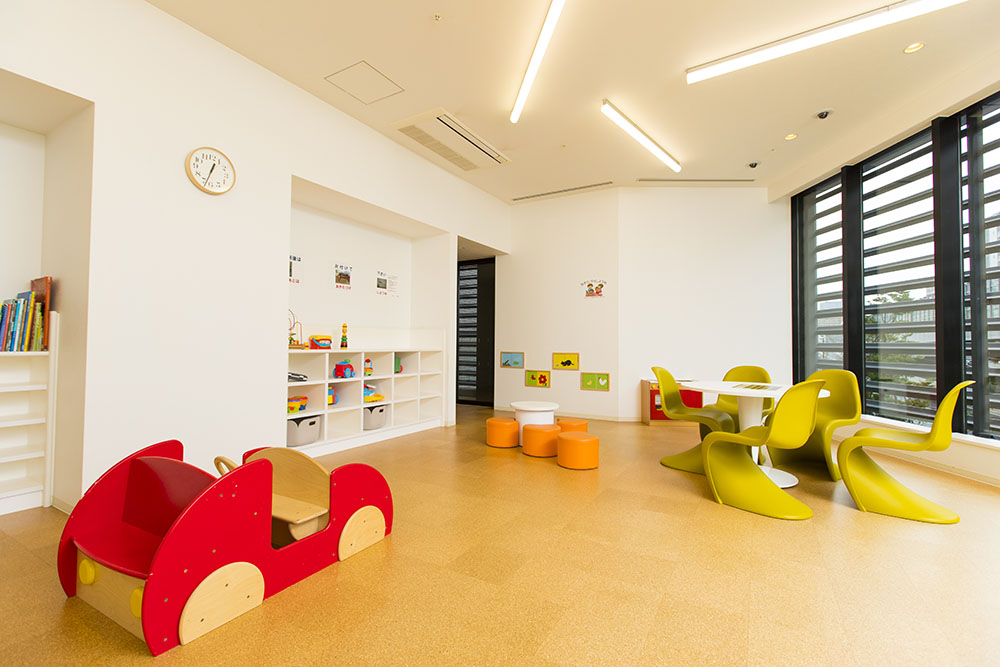 明るい雰囲気と色使いでお子様とリラックスしたひと時が過ごせる「キッズルーム&テラス」。床はコルクタイルを採用するなど、素材にも配慮した。