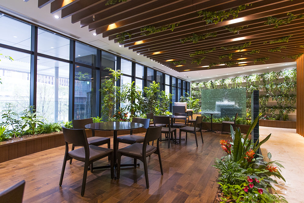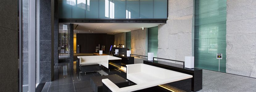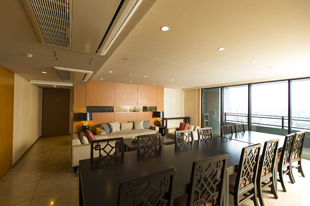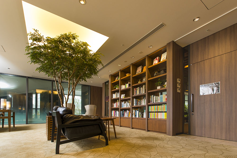 時を経ても色褪せることのない丹念に造り込まれた「グランドラウンジ」。ランドスケープとインテリアが繋がるデザインは、「都市、自然、伝統」が融合する「UNITED DESIGN」を表現。