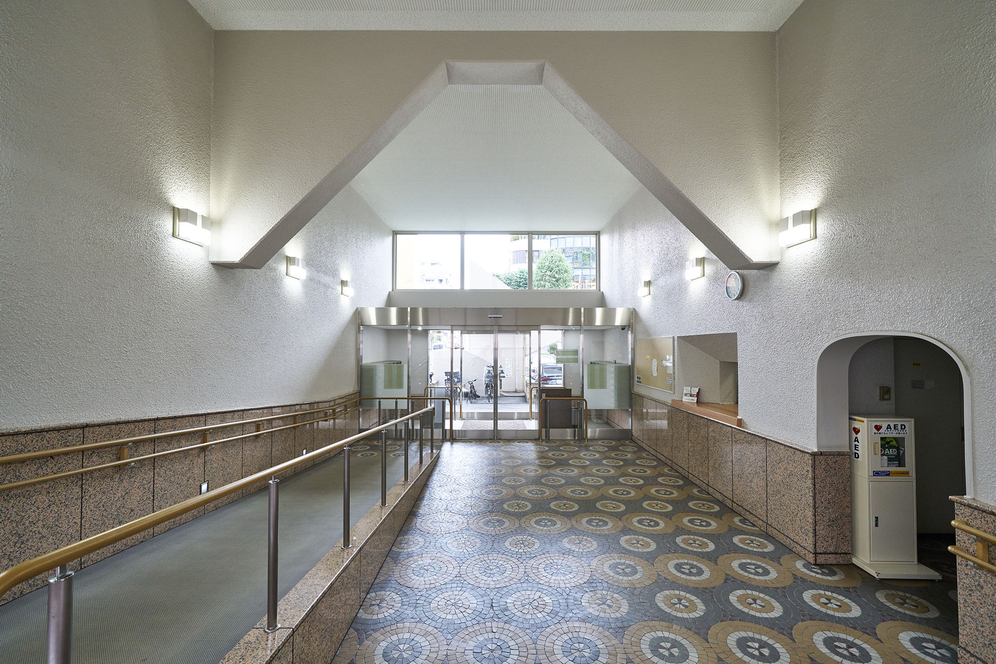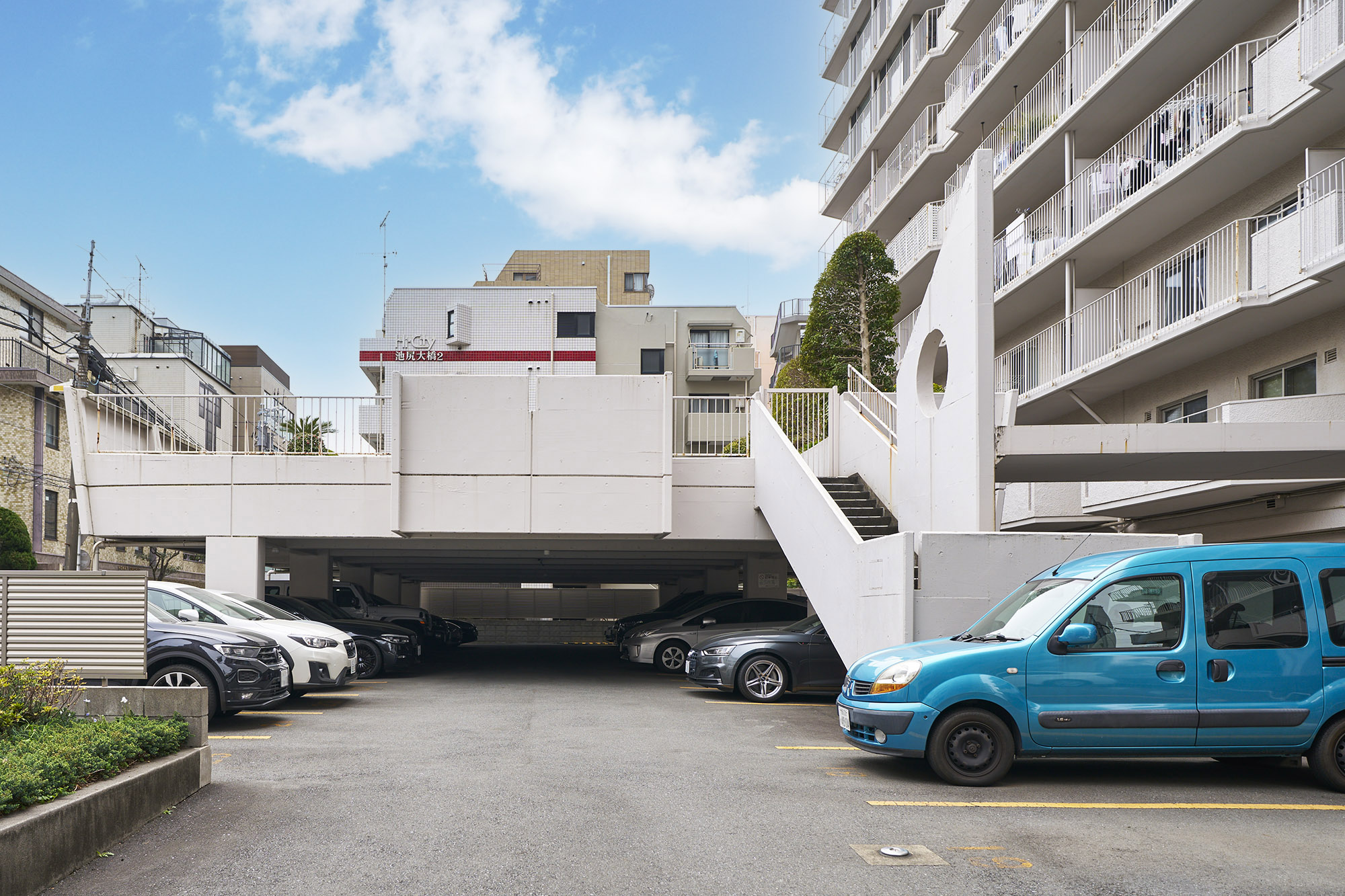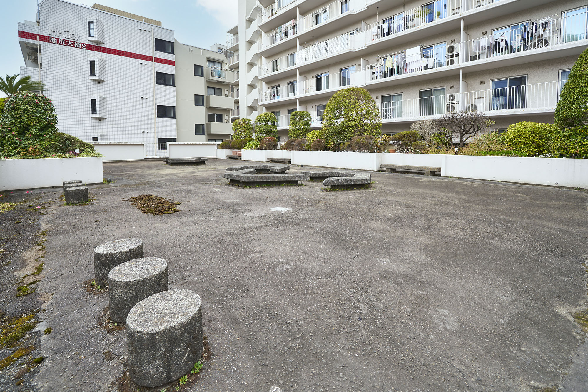 建物の顔となるエントランスロビーは、吹き抜けで開放感があり、レトロで落ち着いたモザイクタイルの床が、温かみのある空間を演出しています。管理事務室の奥には集会室があり、住民同士の交流の場として活用されています。駐車場は42台分を完備。その上は広々とした庭園広場となっており、子供たちを安心して遊ばせられる日当たりのよい空間となっています。