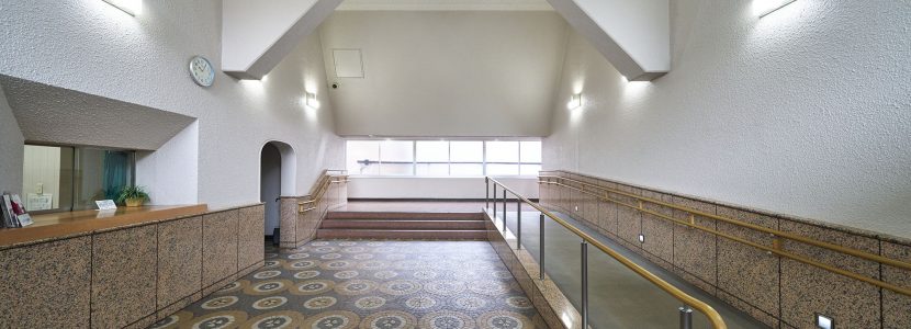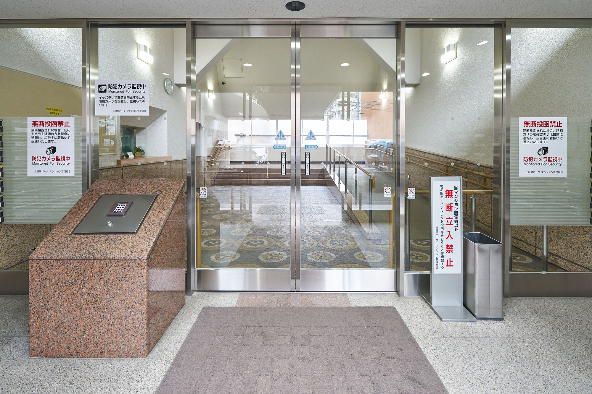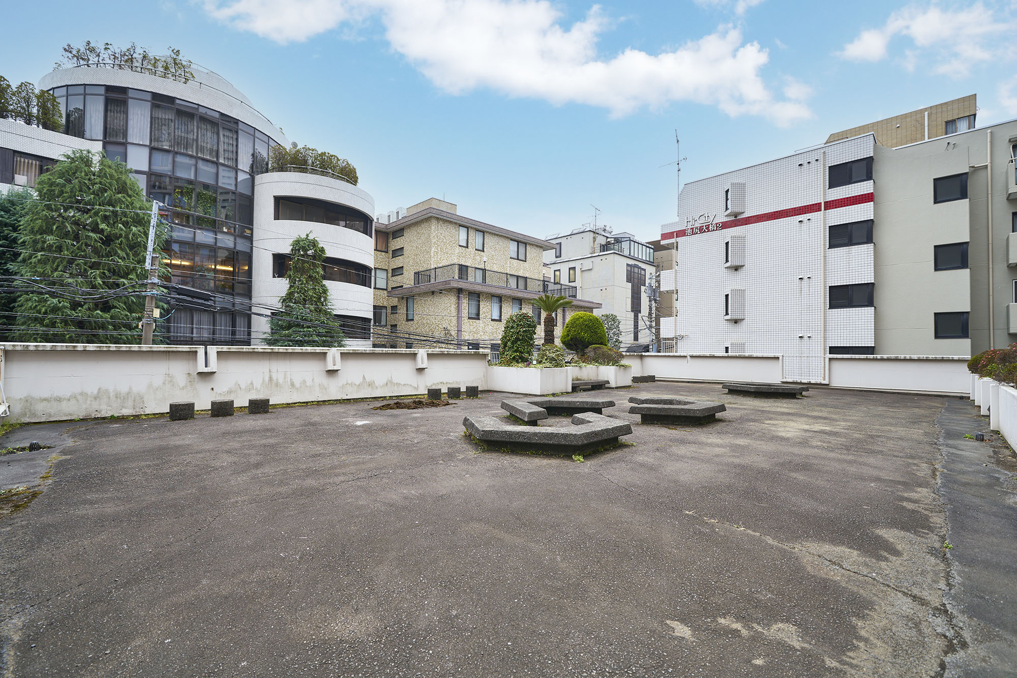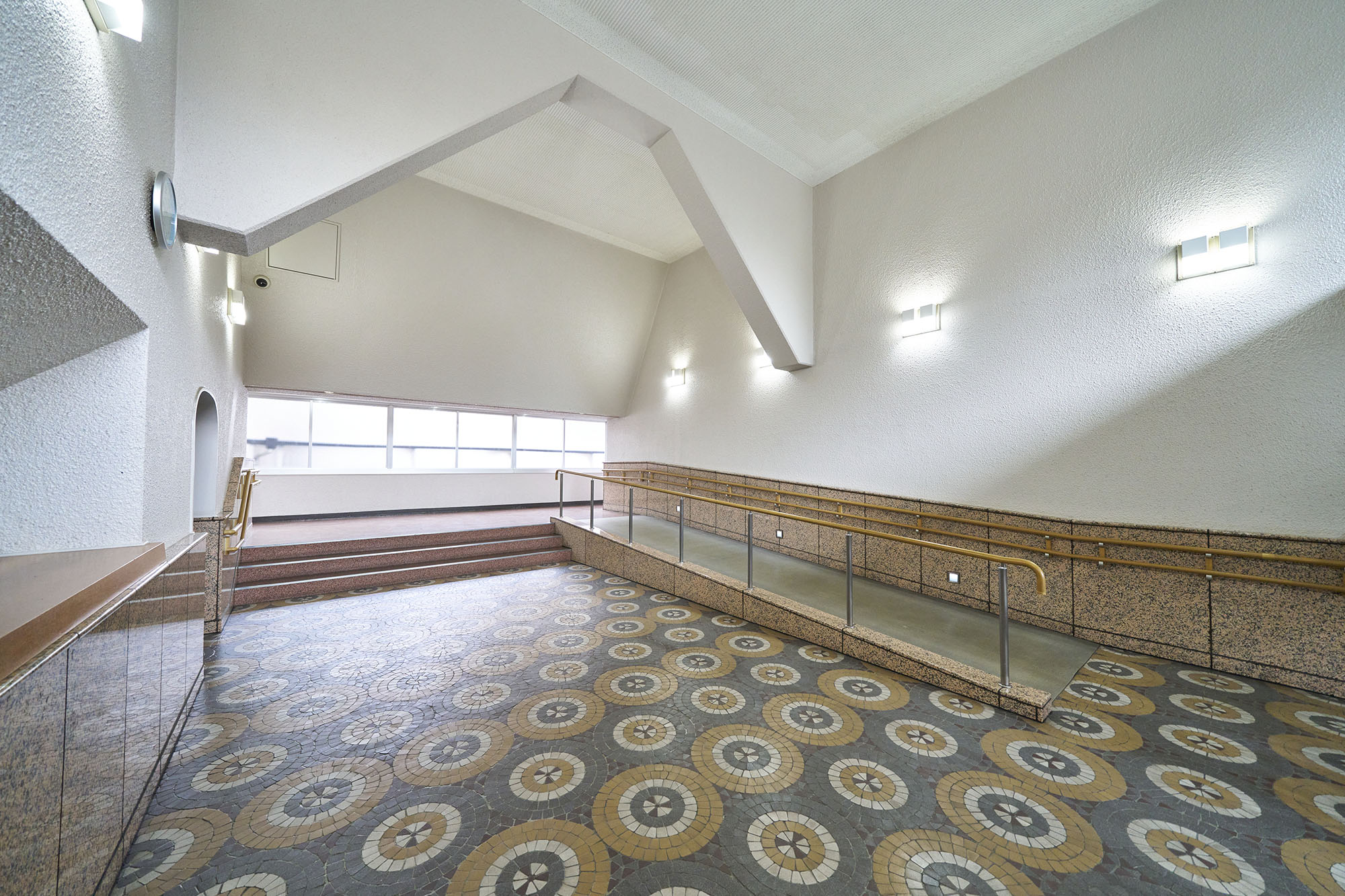 建物の顔となるエントランスロビーは、吹き抜けで開放感があり、レトロで落ち着いたモザイクタイルの床が、温かみのある空間を演出しています。管理事務室の奥には集会室があり、住民同士の交流の場として活用されています。駐車場は42台分を完備。その上は広々とした庭園広場となっており、子供たちを安心して遊ばせられる日当たりのよい空間となっています。