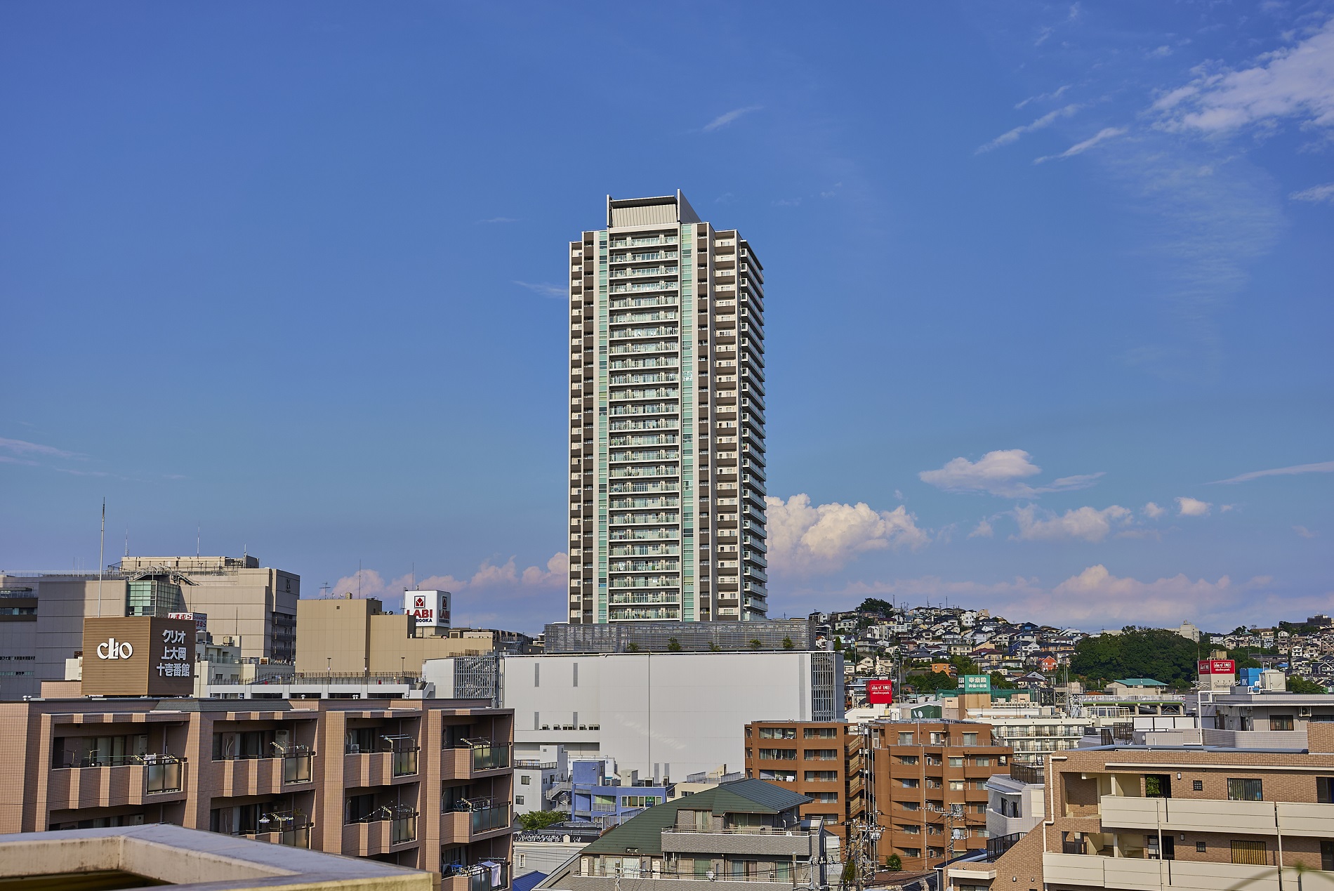 デザイン 白い美意識、街を映す。 駅前に、ひときわ目をひくランドマークのシルエット。白く艶めくタイル、ガラスのカーテンウォール。透き通るかのような洗練の装いが、上大岡の街並み、暮らしの風景とやわらかに溶け合っています。