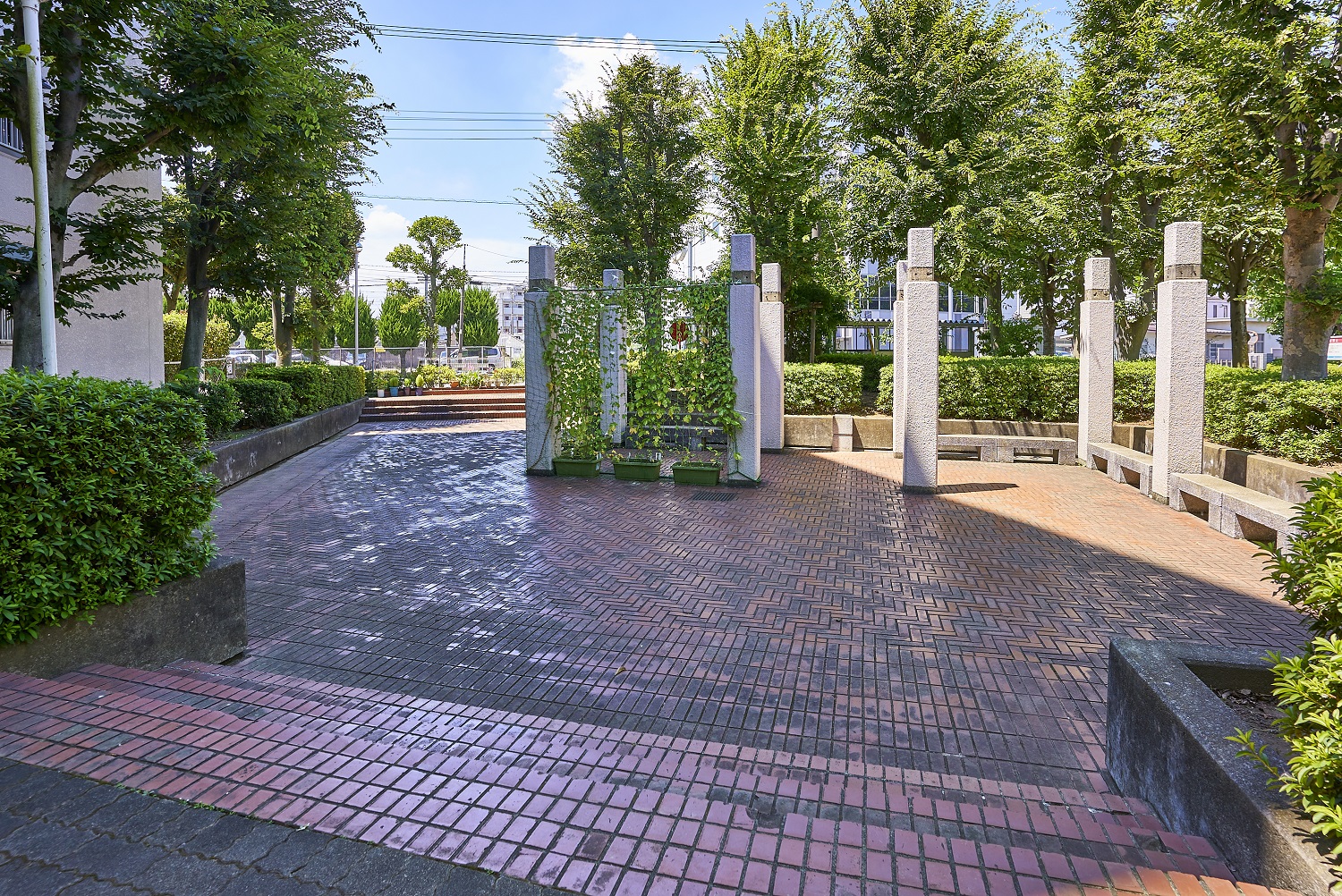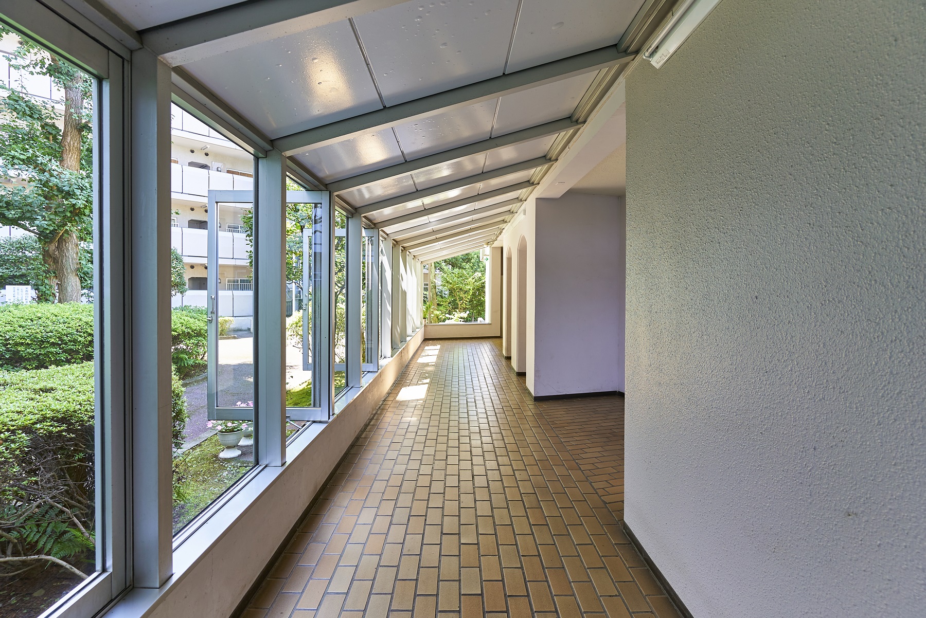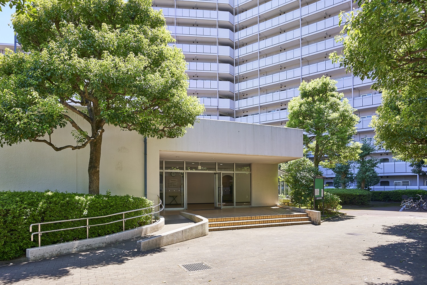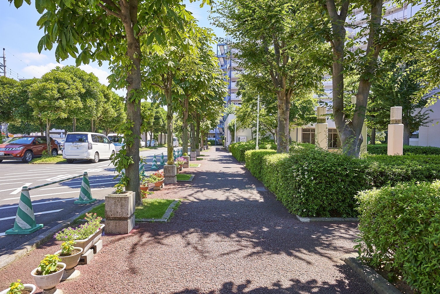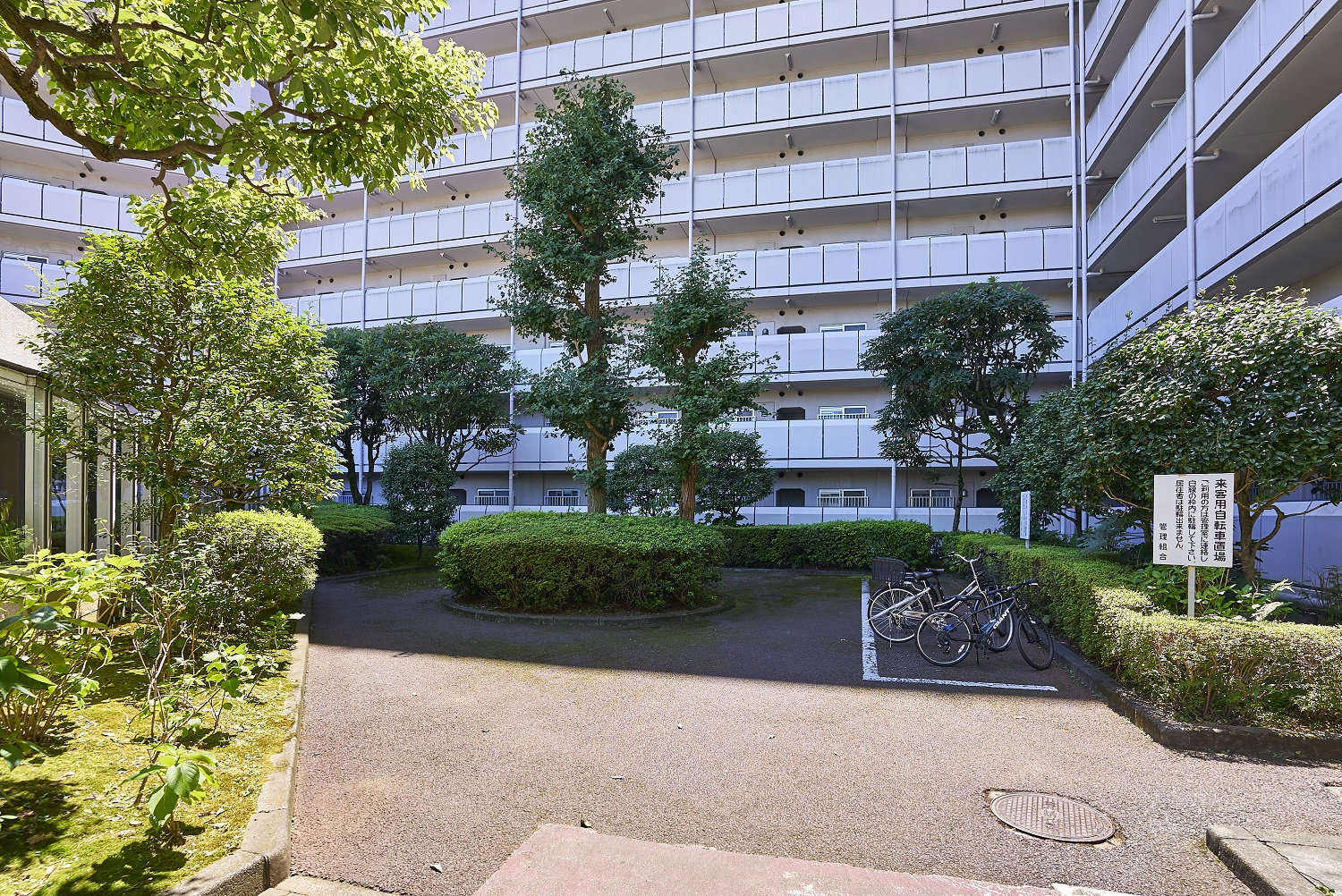 鉢植えの花々が温かく出迎えてくれるエントランスアプローチや、朝顔のカーテンや木々が爽やかな木陰を作るオープンスペース、子供たちを目の届くところで遊ばせられるプレイロットなど、広々とした敷地を活かして、豊かな植栽を配した共用スペースが設けられています。来客用の駐車場や駐輪場のスペースも広く、エントランスには宅配ボックスを完備。共用廊下や集会室なども丁寧に清掃・管理されています。