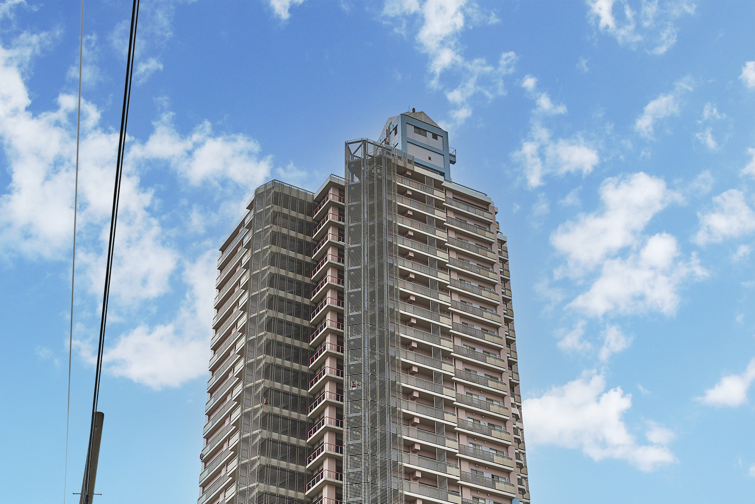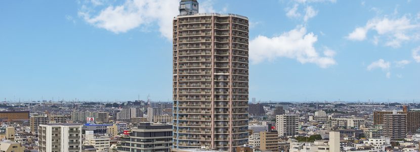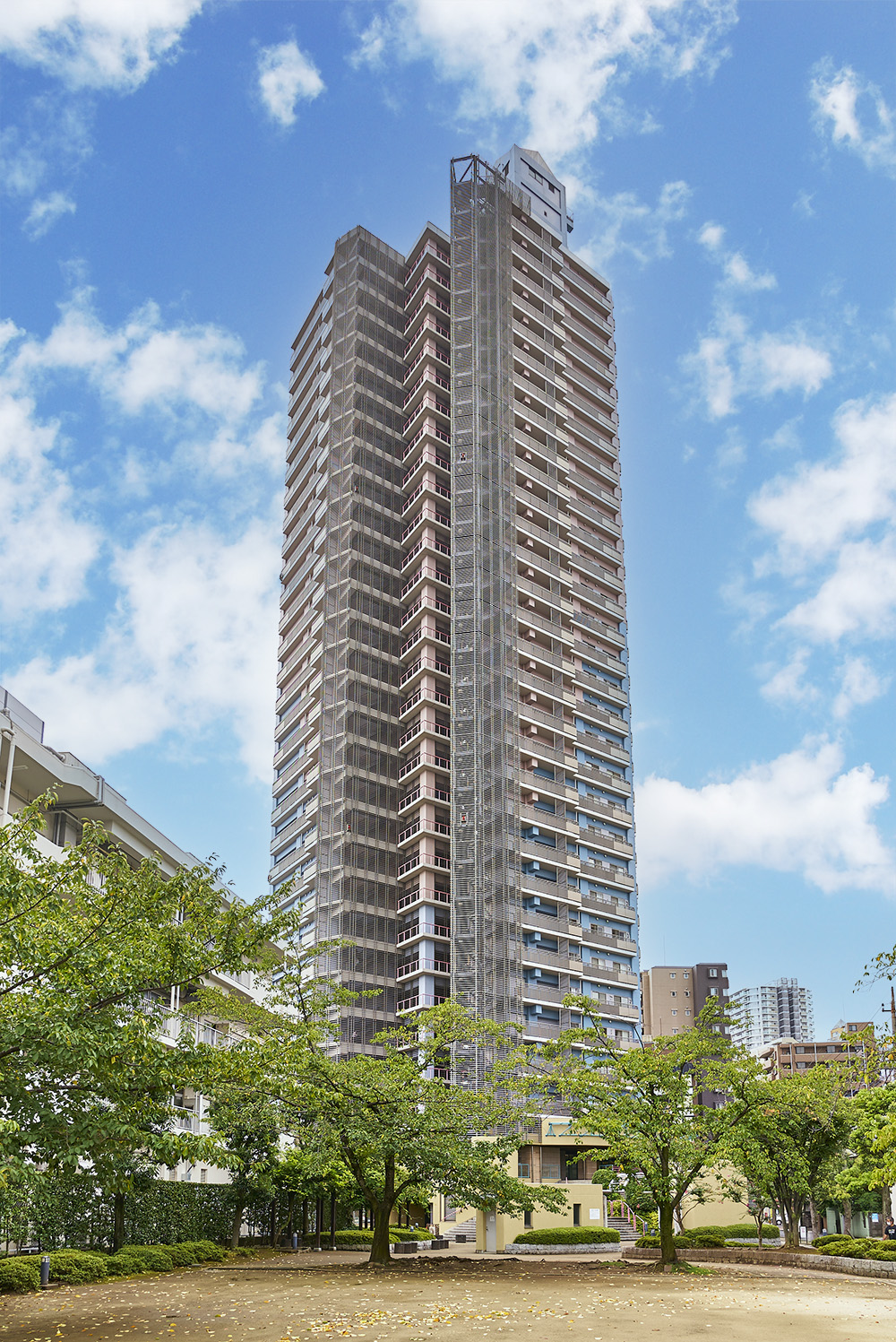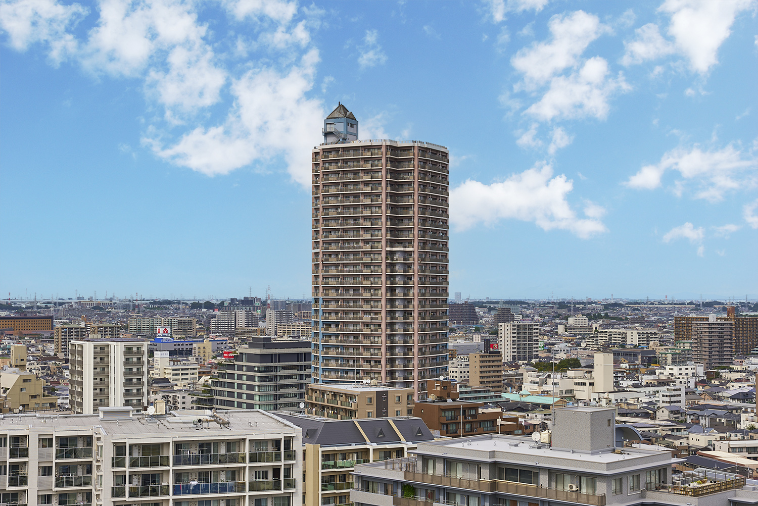パブリックスペースとなる1・2階は、ガラス素材をふんだんに使用したなめらかな曲線の円型で、先進性と優しさが表現されています。住居となる3階以上は正方形を基本に、コーナーを雁行設計として、シャープな中にも心地よい変化をプラス。最上階には、超高層タワーを印象付ける尖塔がデザインされています。建物全体はおだやかなウォームグレーで包まれ、 3階から31階までを貫くブルーとピンクのアクセントラインが、ひときわ印象的です。先進のフォルムでありながら、優しさ温かさの演出が多彩に組み込まれています。