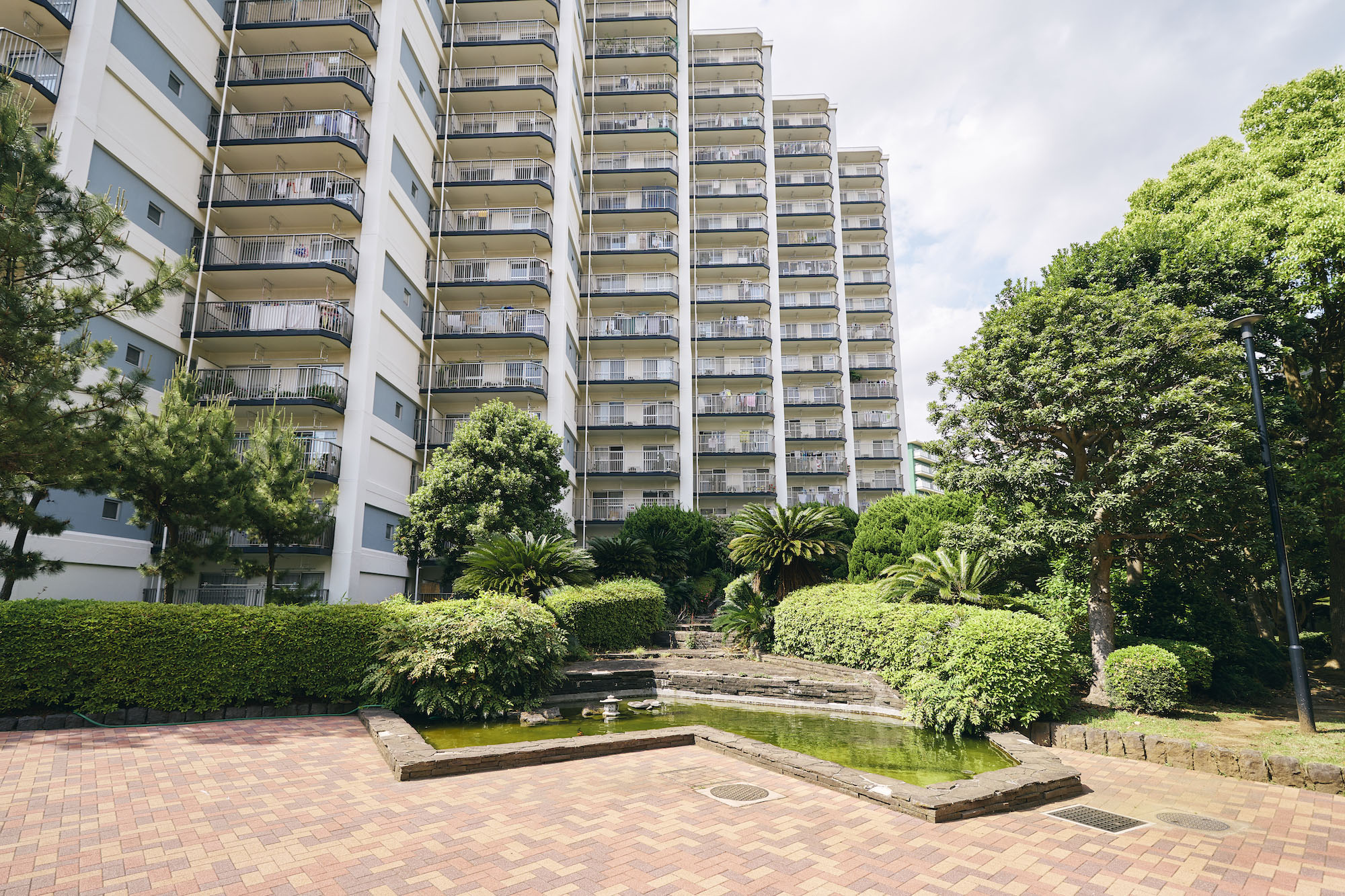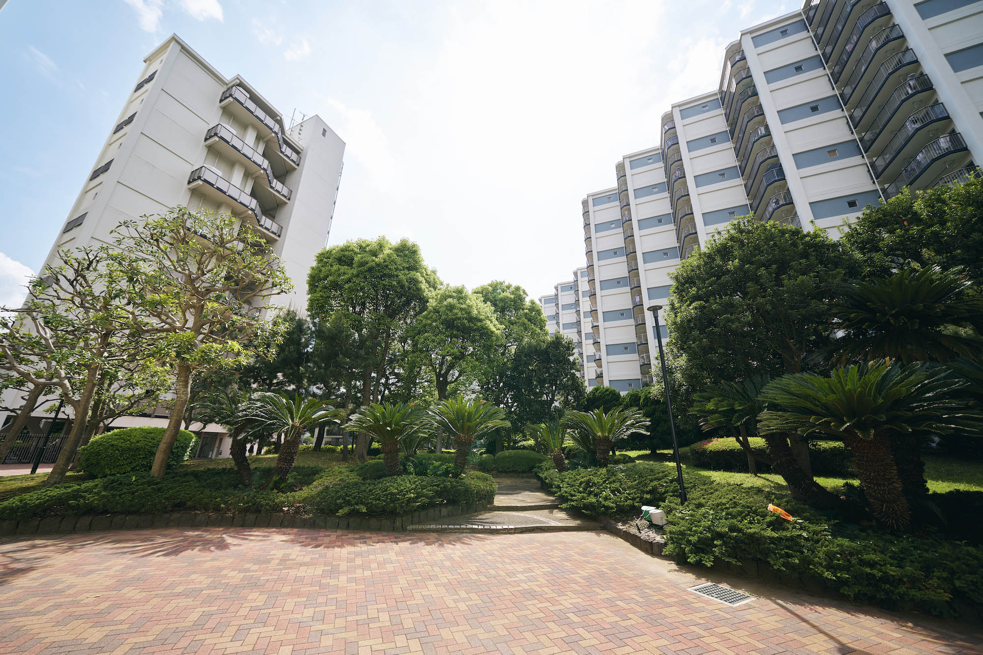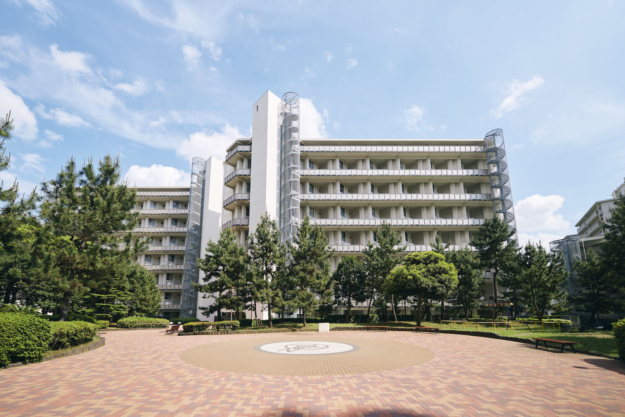 敷地内にある管理センター棟は、検見川パーク・マンションの管理をつかさどる中枢部。日々の清掃や管理体制はもちろんのこと、防犯・防災や地域の情報が常に集まり、集会室では住民同士が趣味の活動や会合など豊かなコミュニケーションが育まれています。敷地中央の庭園は、芝や木立の見え隠れする丘がいくつも起伏し、常緑樹を中心に季節を知らせる落葉樹や色とりどりの草花、鯉が優雅に泳ぐ池も配されています。メインの遊歩道が丘をぬって各住棟へと伸び、カラフルなブロックで舗装された道の先に広がるのは、開放的な円形の広場。子供が安心して遊べるスペースや自然溢れる安らぎ空間がたくさん備わっています。各棟のエントランスも、ガラス張りで緑のうるおいと開放感を感じられる共用空間です。