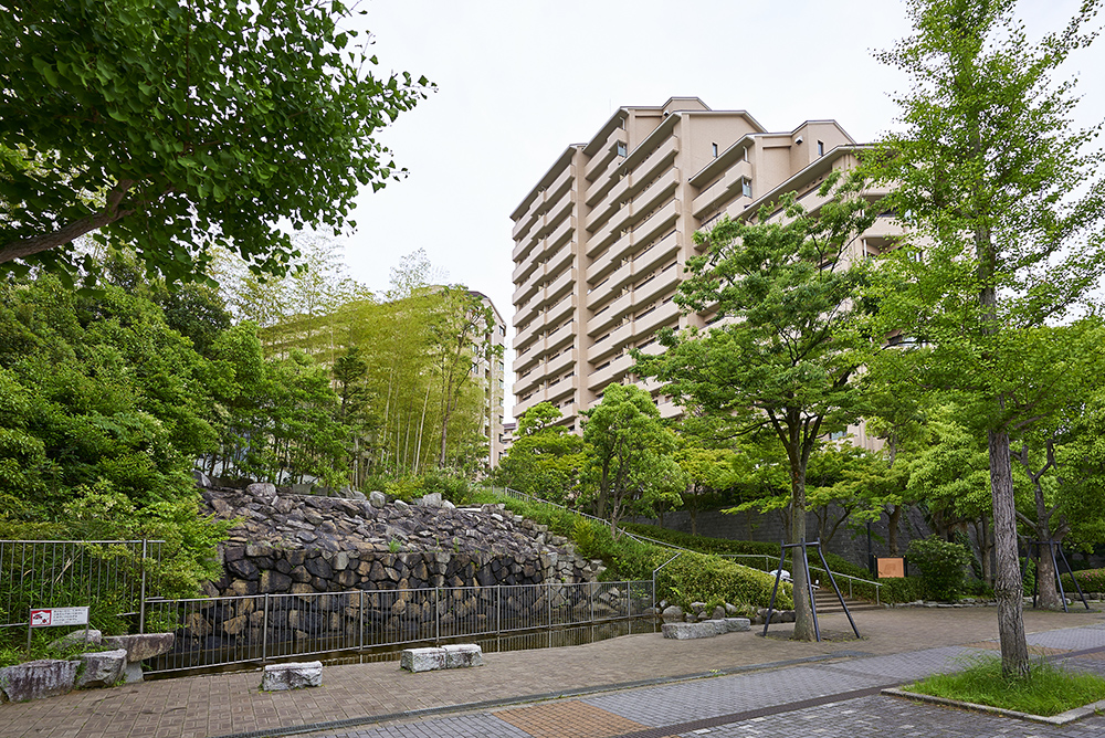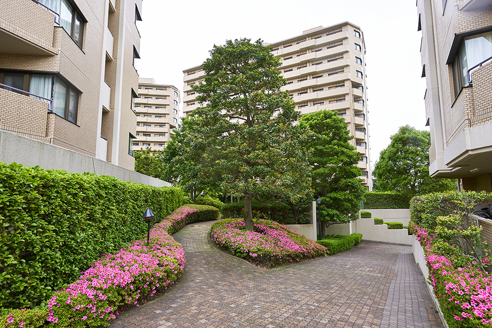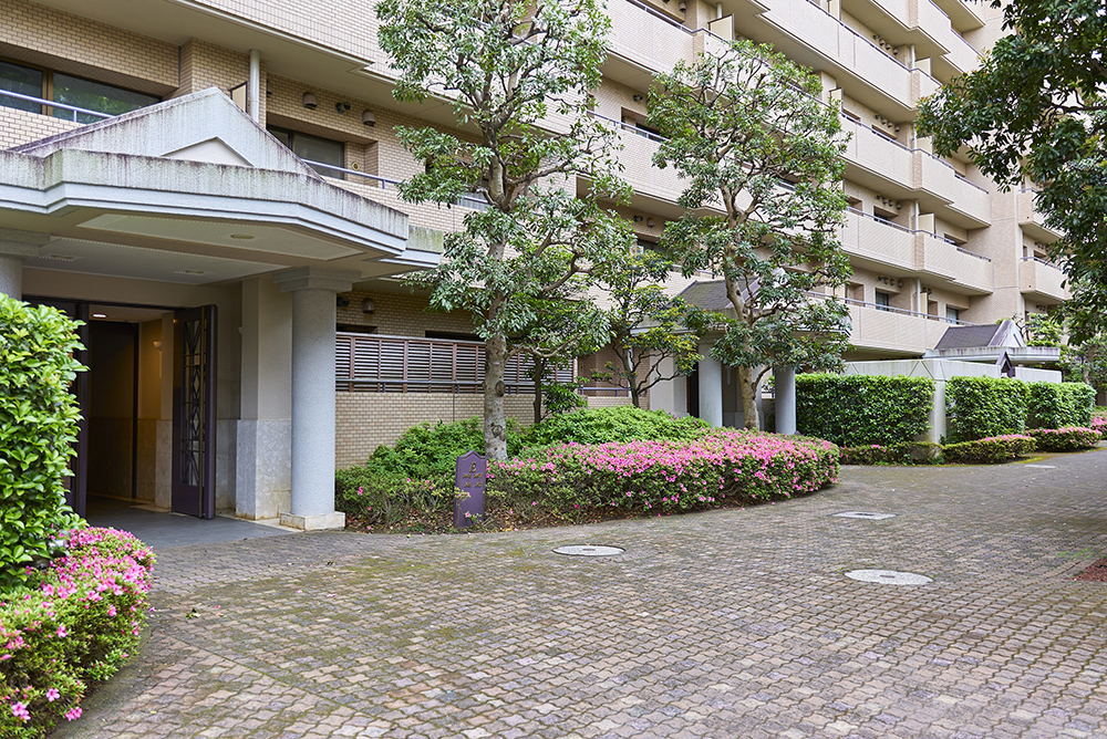 生い繁る緑と美しいハーモニーを奏でる住棟は、洗練されたシックな表情を見せる格調高いタイル貼りの外観。個性的なスカイラインを描く勾配屋根。そして、セットバック設計の変化の富んだ豊かなシルエットは、つややかな緑と相まって、暮らしに心地よいリズムを奏でます。住まいの格調を表現するエントランスは、ポーチ部分には三角屋根を、ドア両サイドには重厚な円柱を配し、やさしさと存在感をひときわ印象づけています。床と壁はダークグレーとホワイトのモノトーンカラーでシックな趣を、ホール内にはブラケットの灯りで落ち着きを演出し、洗練された雰囲気を醸し出しています。