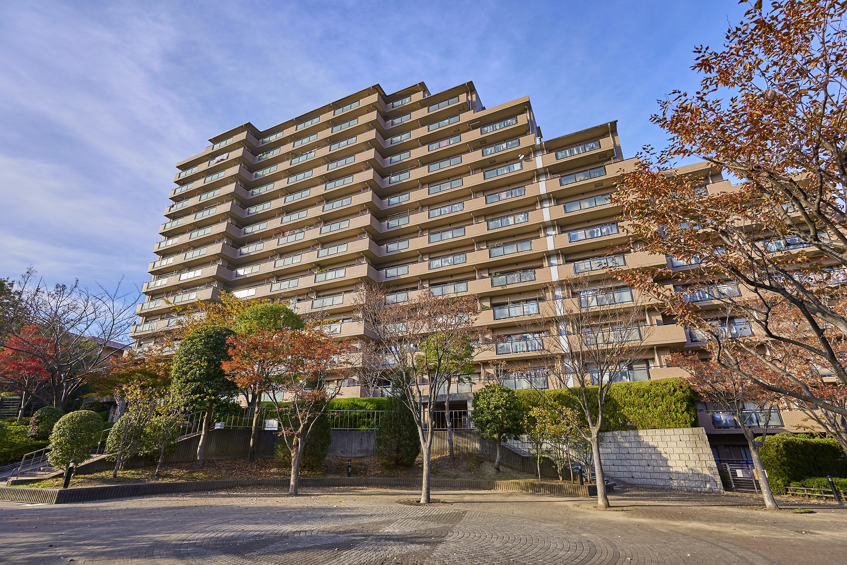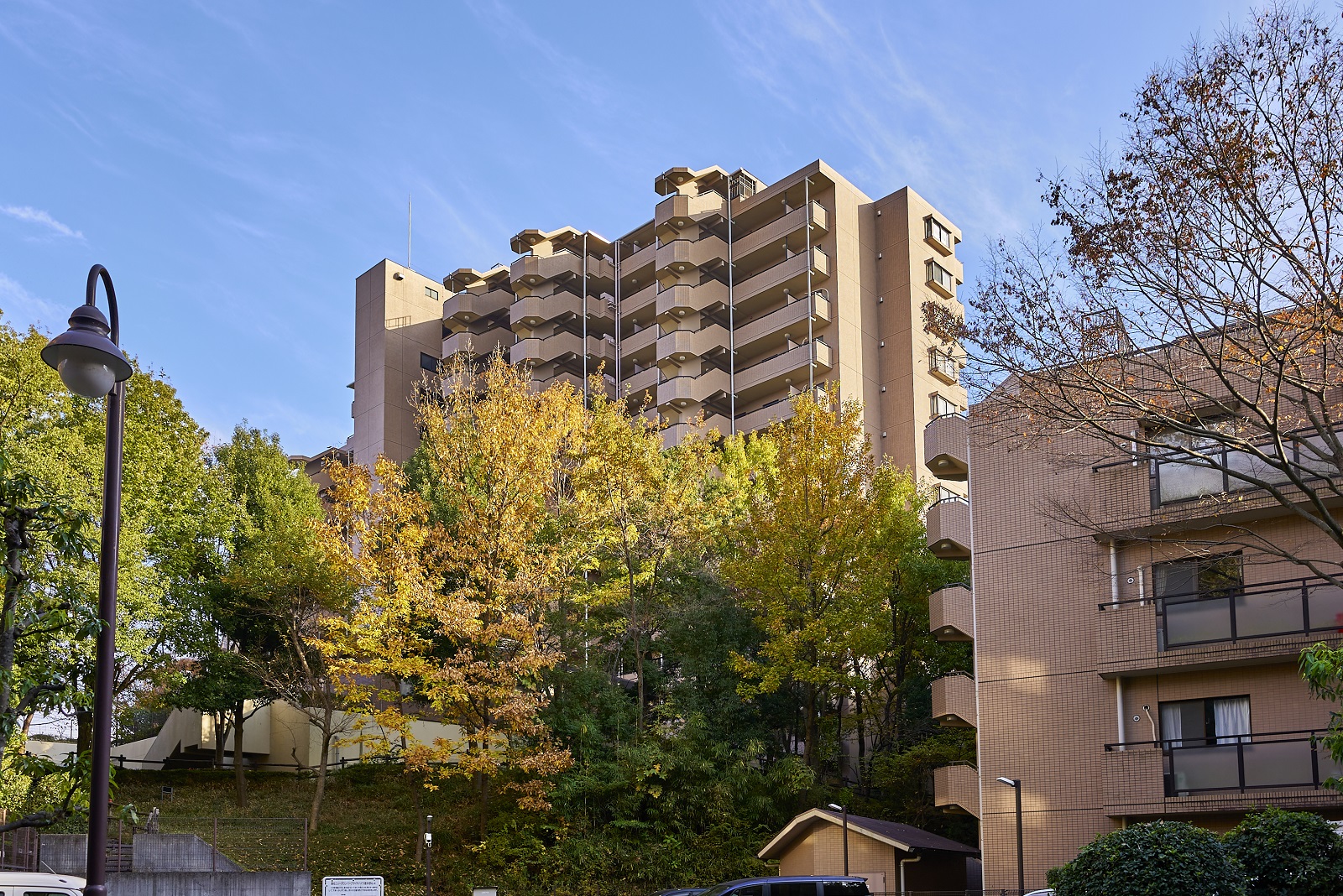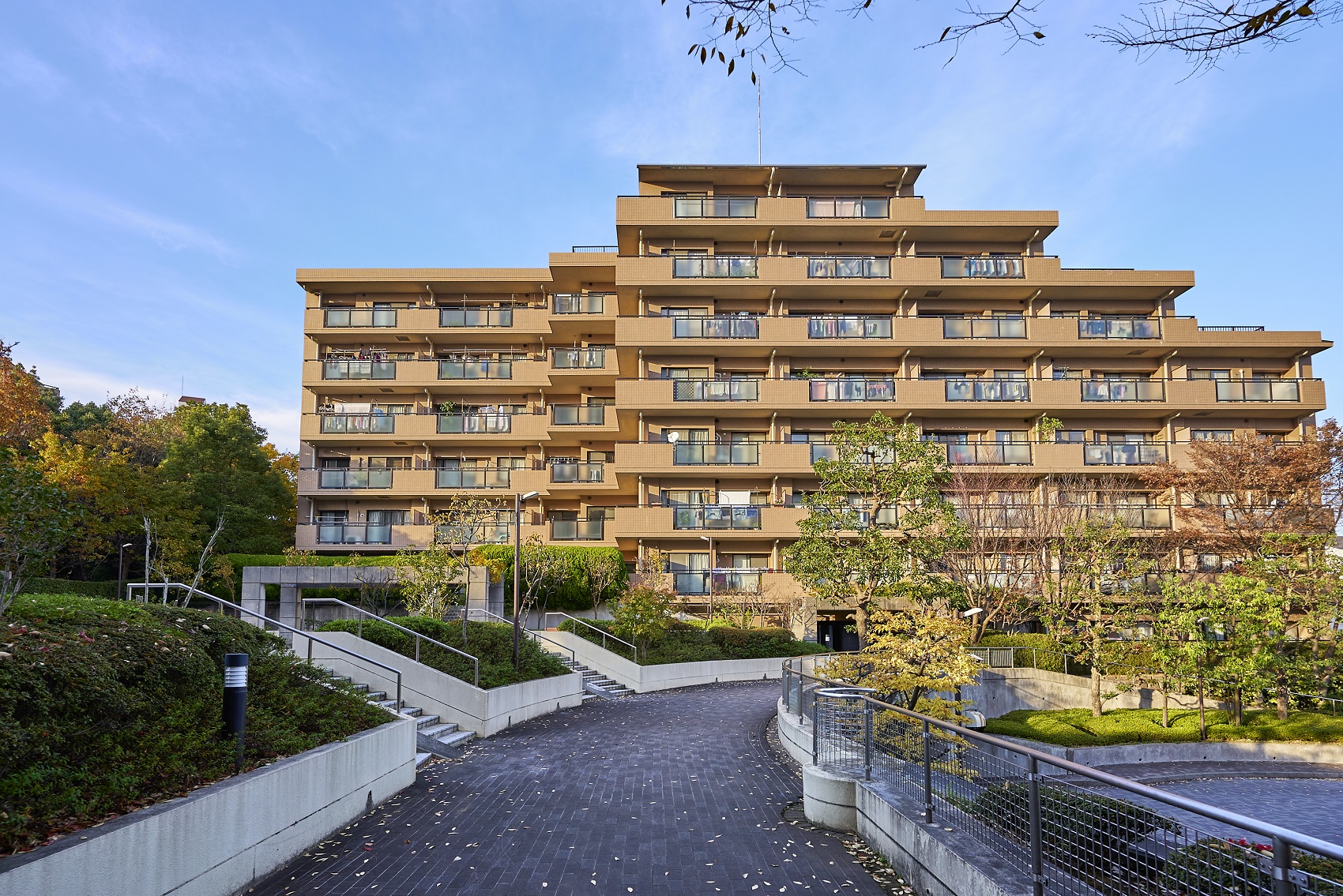 コンセプトは、「Park in Parkの思想」。敷地の南北に延びる保存緑地を生かして4つの住棟がゆったりと配置され、隣接する公園や周辺の緑に建物を美しく調和させた、まさに「公園」のような街づくりを実現しています。外観は、自然の中に溶け込むアースカラーの総タイル貼りに、勾配屋根と、リズミカルにセットバックしたフォルムが印象的なデザイン。まばゆい緑と抜けるような青空の下、街に豊かな表情を描き出しています。