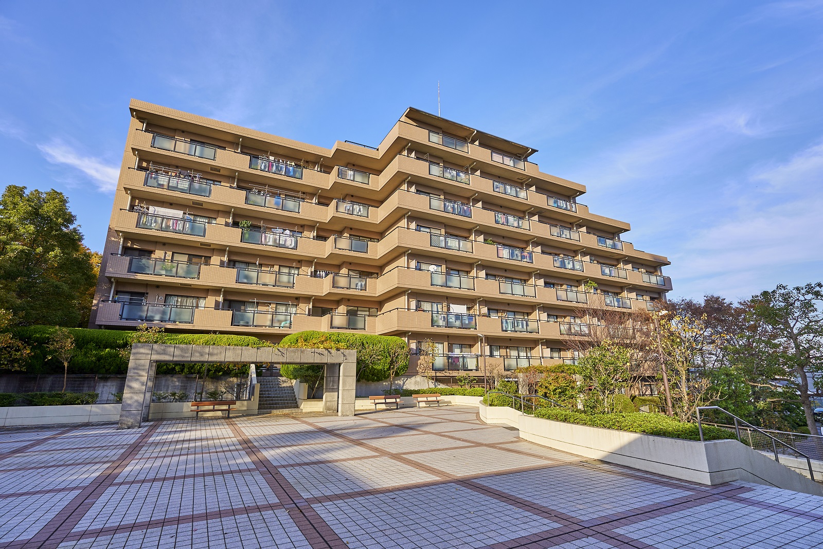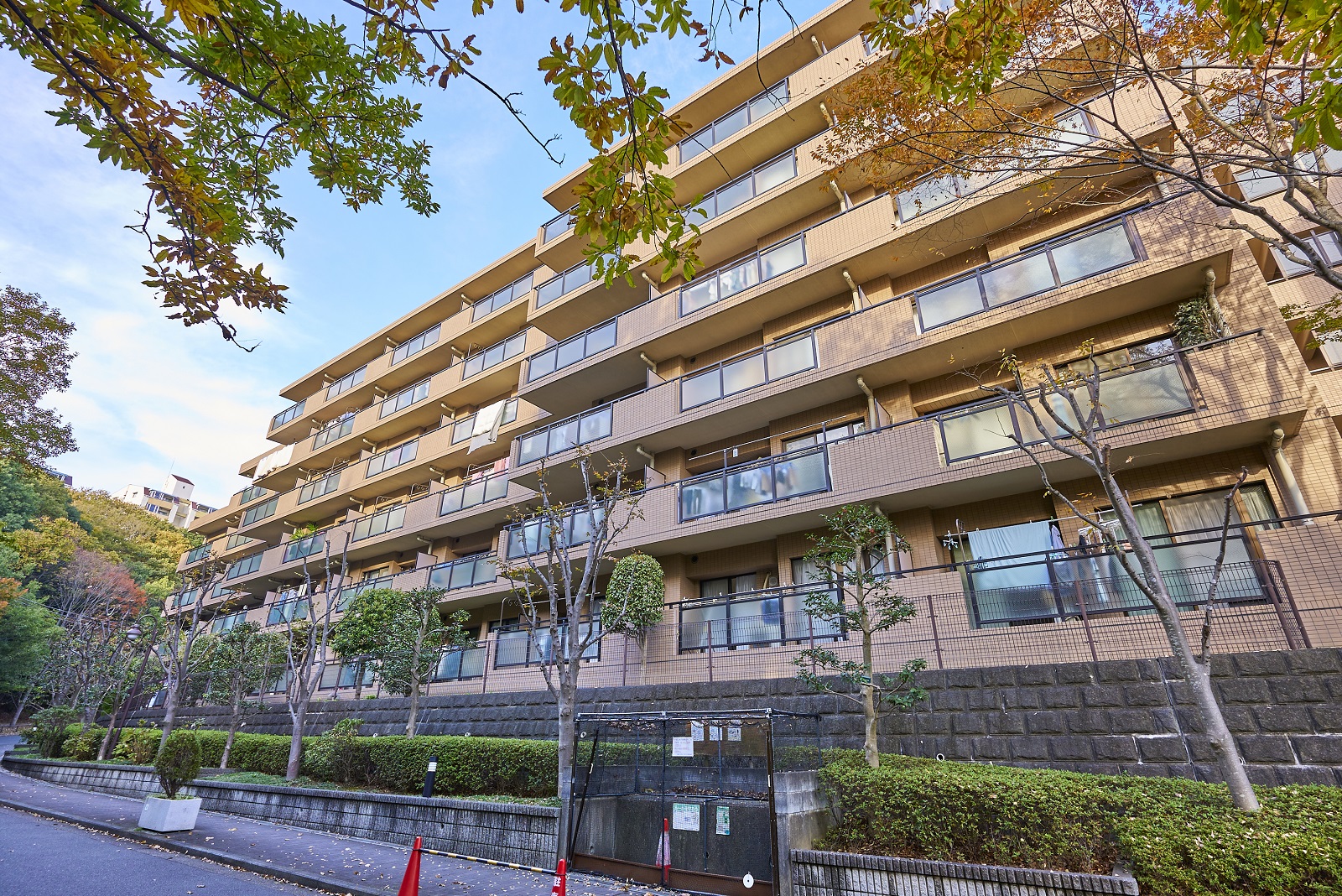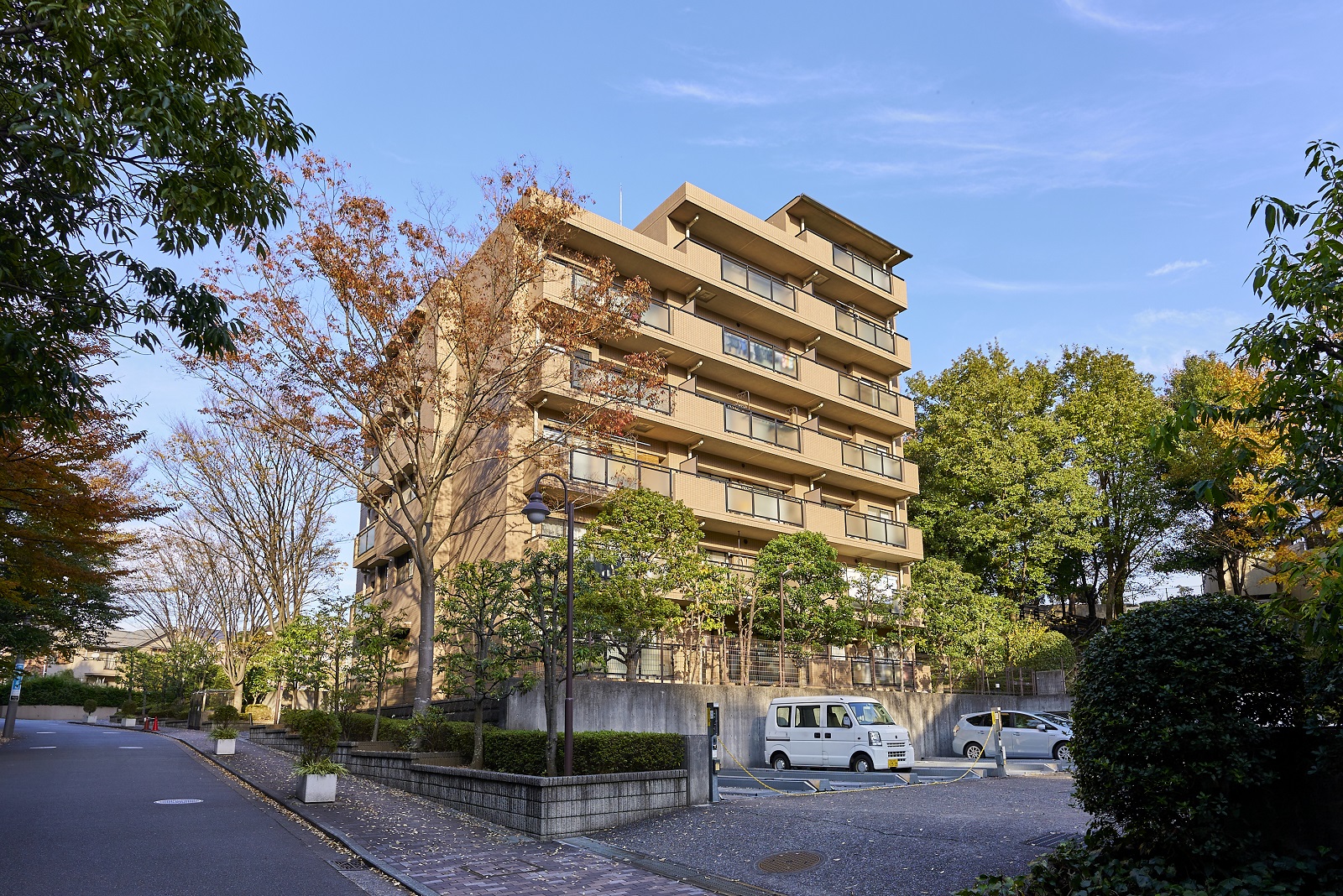 コンセプトは、「Park in Parkの思想」。敷地の南北に延びる保存緑地を生かして4つの住棟がゆったりと配置され、隣接する公園や周辺の緑に建物を美しく調和させた、まさに「公園」のような街づくりを実現しています。外観は、自然の中に溶け込むアースカラーの総タイル貼りに、勾配屋根と、リズミカルにセットバックしたフォルムが印象的なデザイン。まばゆい緑と抜けるような青空の下、街に豊かな表情を描き出しています。