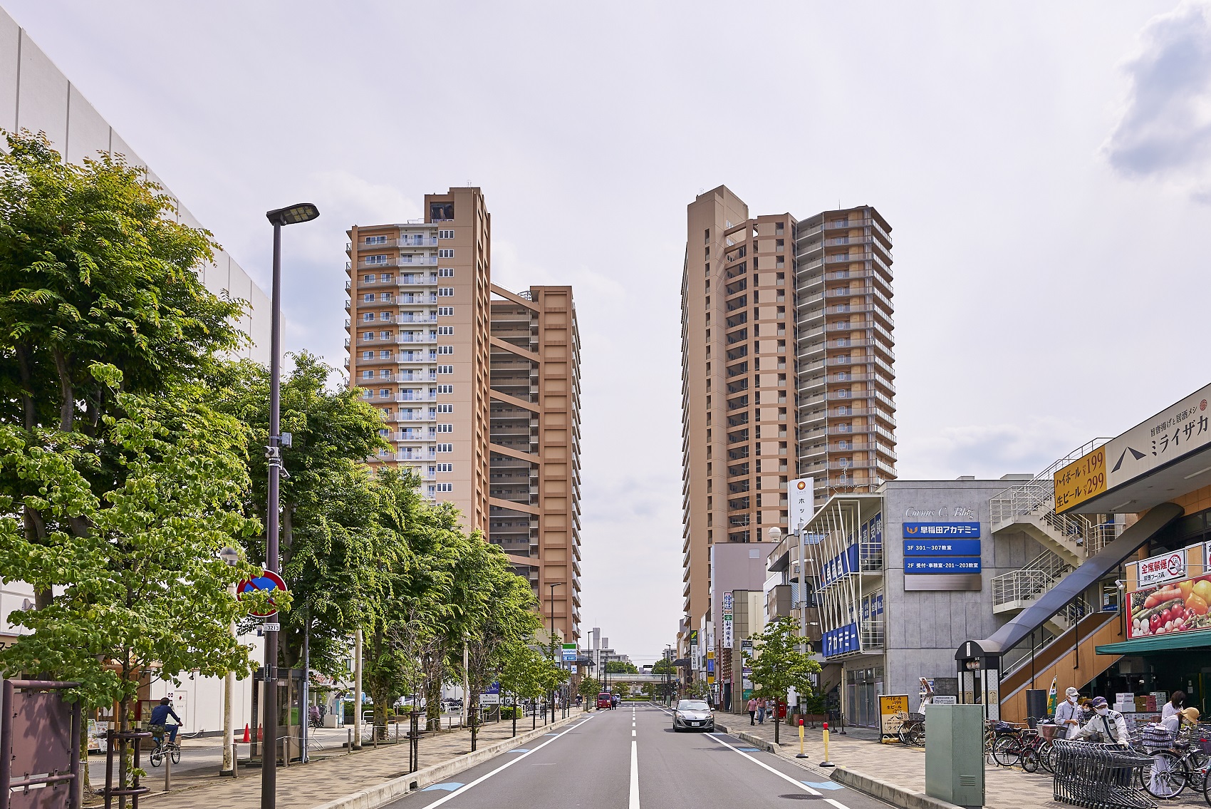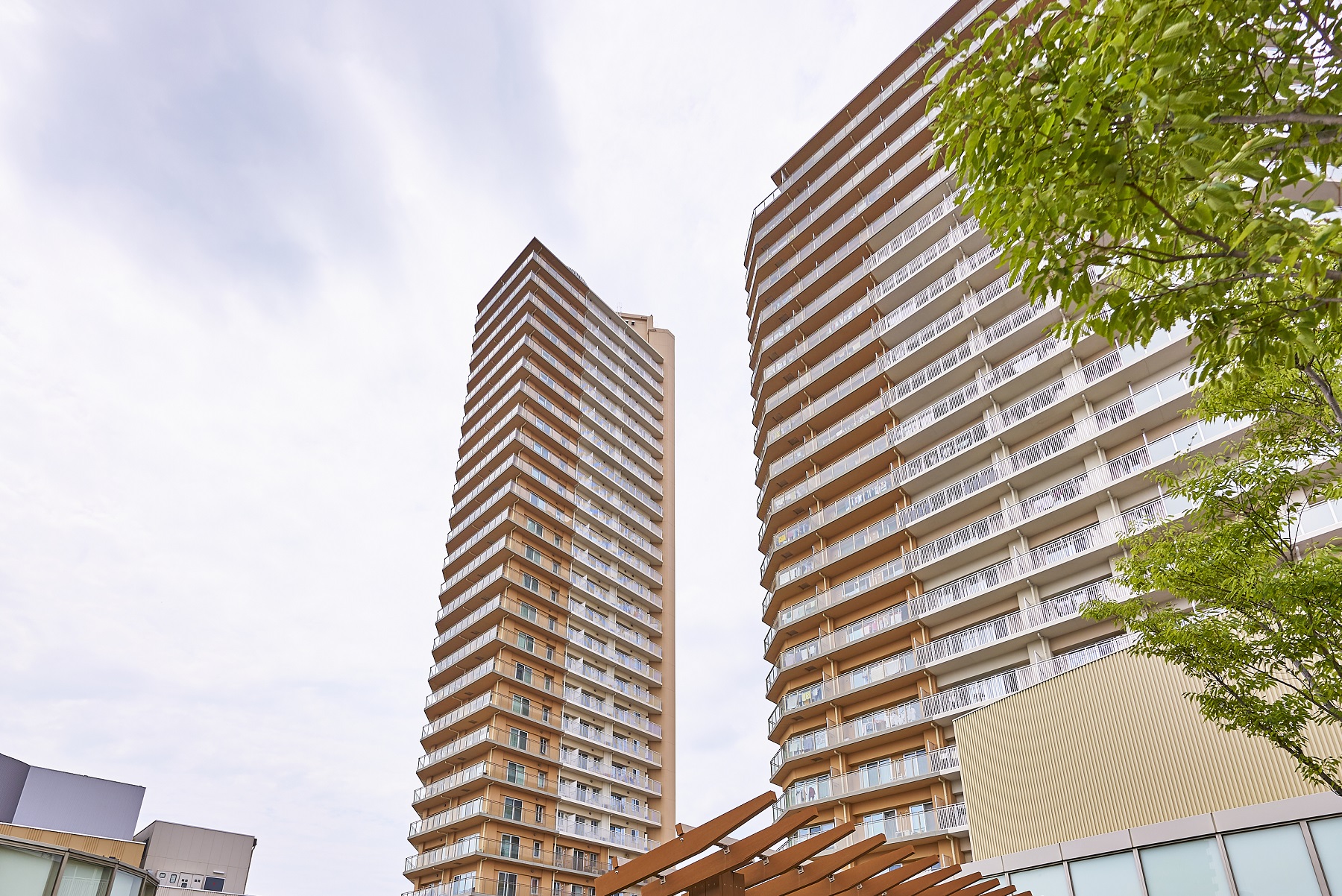 地上27階建ての「ディアスカイタワー」と地上23階建ての「エバースカイタワー」。ハナミズキ通りを挟んで屹立するツインタワーが、2つの象徴的なゲートをデザインしています。ショップ正面に設えられたガラスのファサードが一対となって、街の導入部をなすアイレベルのゲート「シティゲート・デザイン」に。そして両棟の外観を彩る暖色系カラーの垂直ラインが対峙して、大空に抱かれた壮大なゲート「スカイゲート・デザイン」を描いています。また、低層階は緑に溶け込むアースカラーのタイル貼り、バルコニーの手摺りにはガラスパネルや格子をあしらい、空や光と同化する美しいファサードとなっています。