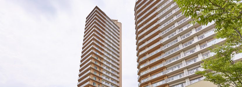 地上27階建ての「ディアスカイタワー」と地上23階建ての「エバースカイタワー」。ハナミズキ通りを挟んで屹立するツインタワーが、2つの象徴的なゲートをデザインしています。ショップ正面に設えられたガラスのファサードが一対となって、街の導入部をなすアイレベルのゲート「シティゲート・デザイン」に。そして両棟の外観を彩る暖色系カラーの垂直ラインが対峙して、大空に抱かれた壮大なゲート「スカイゲート・デザイン」を描いています。また、低層階は緑に溶け込むアースカラーのタイル貼り、バルコニーの手摺りにはガラスパネルや格子をあしらい、空や光と同化する美しいファサードとなっています。