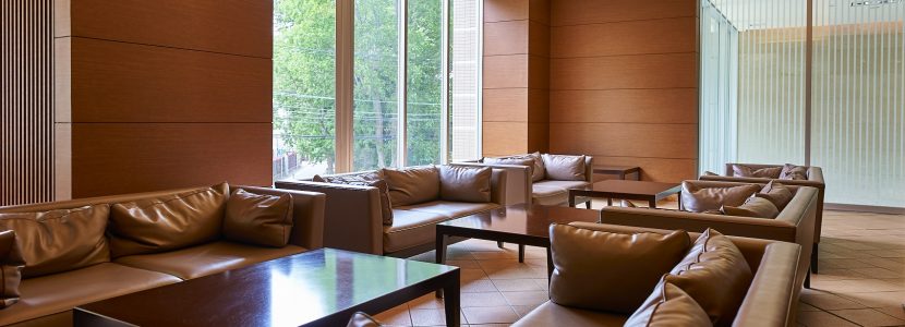 公園の緑を眺めながらひとときの充足を味わうラウンジ。緑の庭園に佇むコテージのような心の充足を奏でるラウンジ空間です。格子のパーテーションで仕切られた各ソファースペースは適度な独立性をもち、プライベート感溢れる上質な寛ぎを演出します。またカフェや焼きたてパンのサービスも用意され、窓辺に四季の風景を眺めながらリラックスできます。