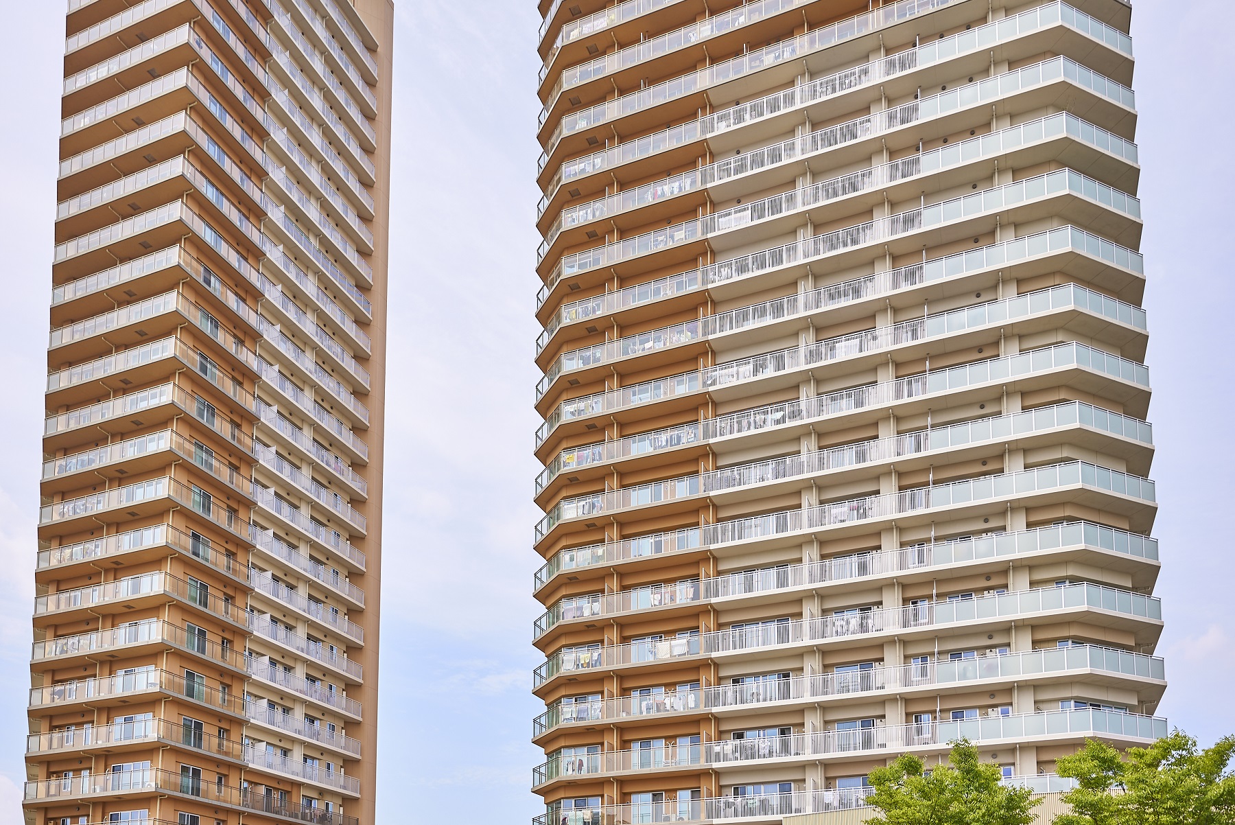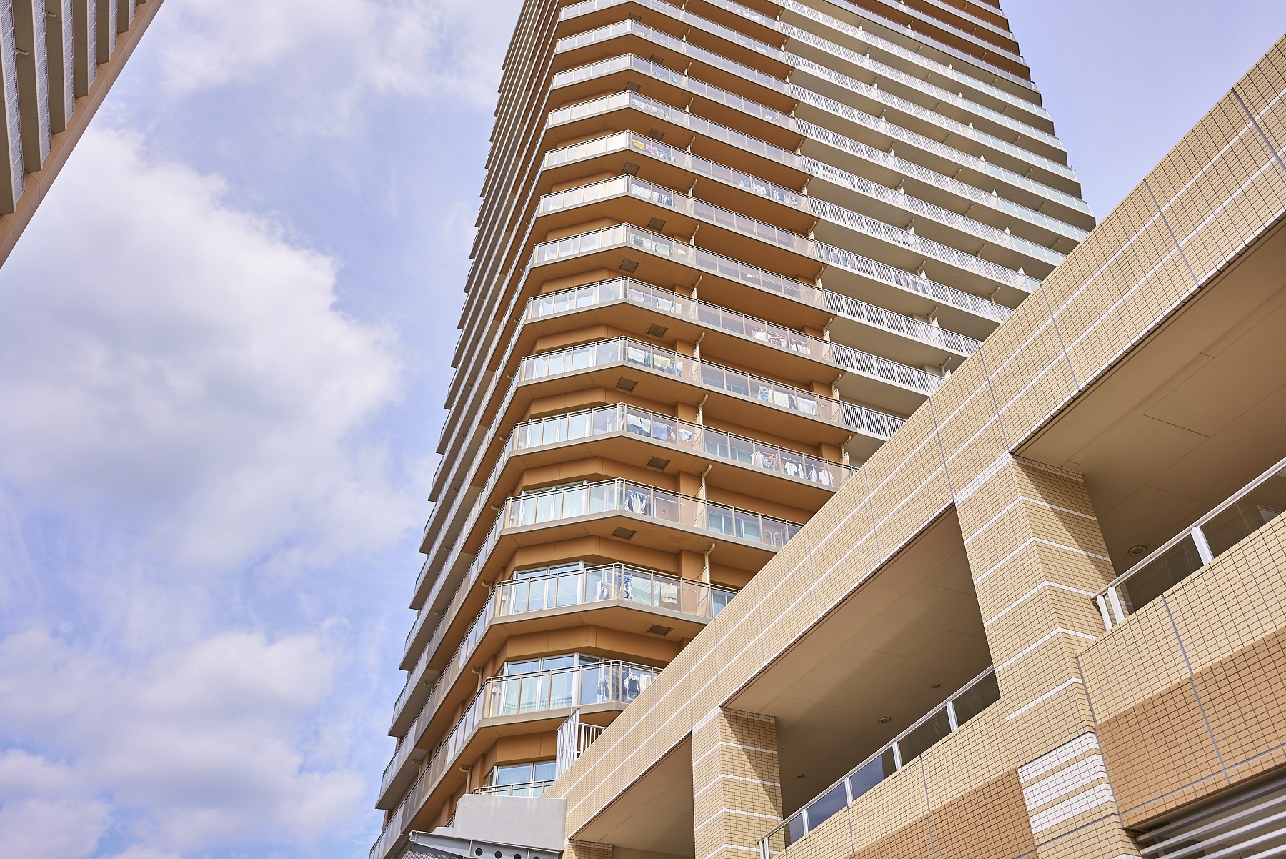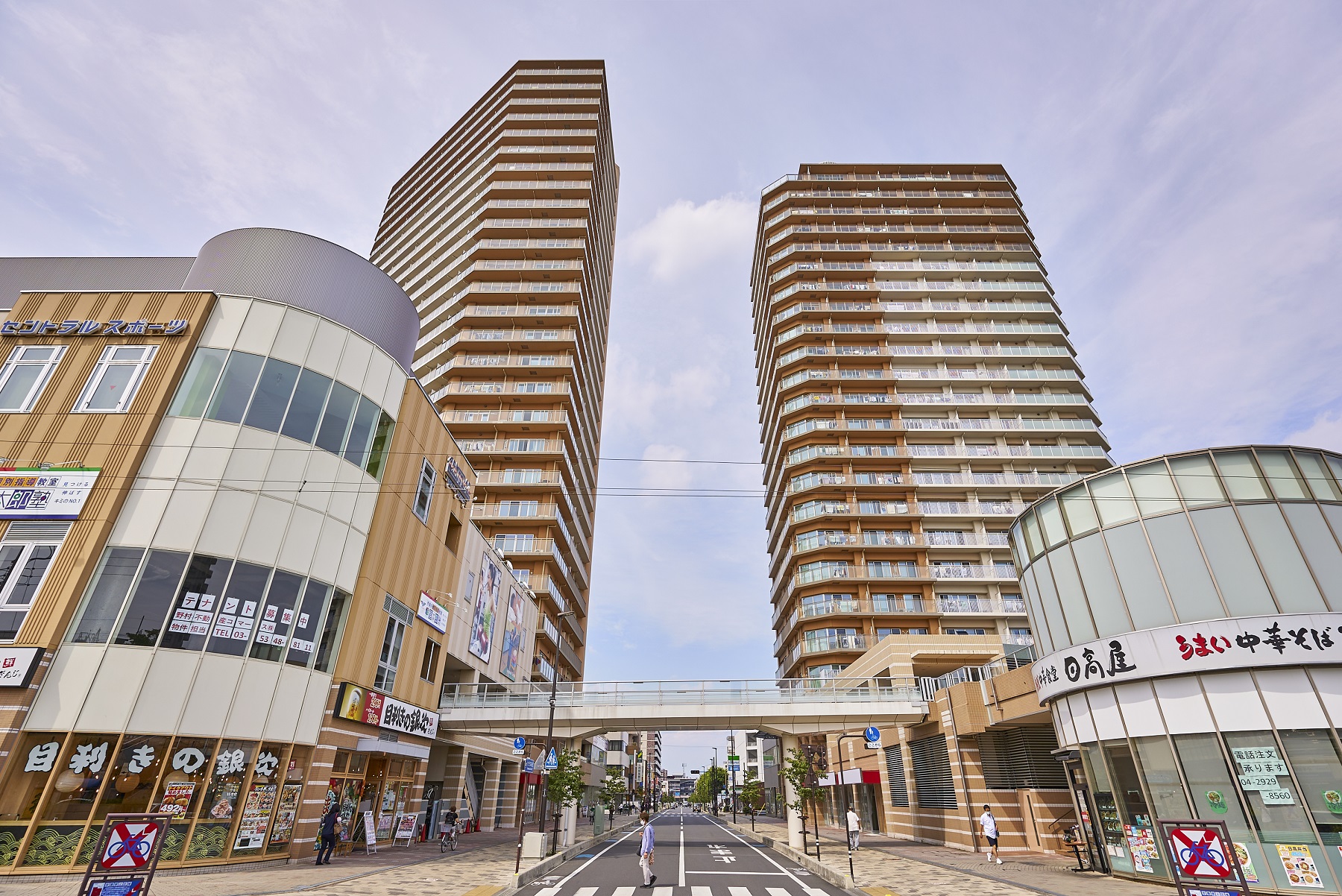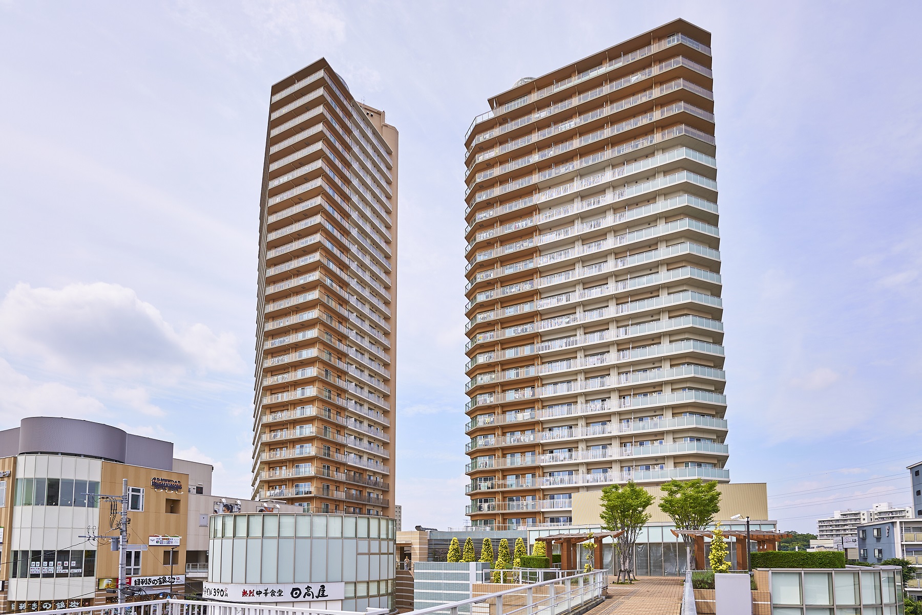 地上27階建ての「ディアスカイタワー」と地上23階建ての「エバースカイタワー」。ハナミズキ通りを挟んで屹立するツインタワーが、2つの象徴的なゲートをデザインしています。ショップ正面に設えられたガラスのファサードが一対となって、街の導入部をなすアイレベルのゲート「シティゲート・デザイン」に。そして両棟の外観を彩る暖色系カラーの垂直ラインが対峙して、大空に抱かれた壮大なゲート「スカイゲート・デザイン」を描いています。また、低層階は緑に溶け込むアースカラーのタイル貼り、バルコニーの手摺りにはガラスパネルや格子をあしらい、空や光と同化する美しいファサードとなっています。