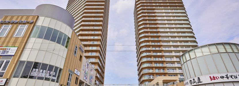 地上27階建ての「ディアスカイタワー」と地上23階建ての「エバースカイタワー」。ハナミズキ通りを挟んで屹立するツインタワーが、2つの象徴的なゲートをデザインしています。ショップ正面に設えられたガラスのファサードが一対となって、街の導入部をなすアイレベルのゲート「シティゲート・デザイン」に。そして両棟の外観を彩る暖色系カラーの垂直ラインが対峙して、大空に抱かれた壮大なゲート「スカイゲート・デザイン」を描いています。また、低層階は緑に溶け込むアースカラーのタイル貼り、バルコニーの手摺りにはガラスパネルや格子をあしらい、空や光と同化する美しいファサードとなっています。