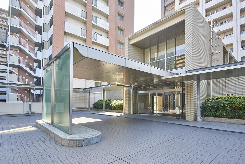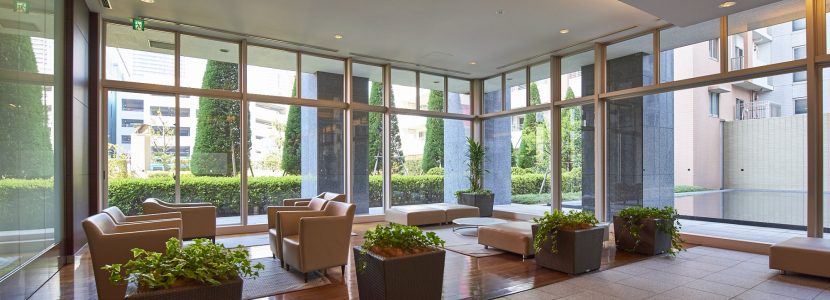 メインエントランスに続くアプローチには、心落ち着かせる、光あふれる水と緑の庭が続き、ONからOFFへ、OFFからONへと気分を切り換えてくれる。そして、セントラルタワーとレフトウィング・ライトウィングをつなぐエントランスホールは、列柱が並び、両サイドに水と緑が配されたゆとりある空間。