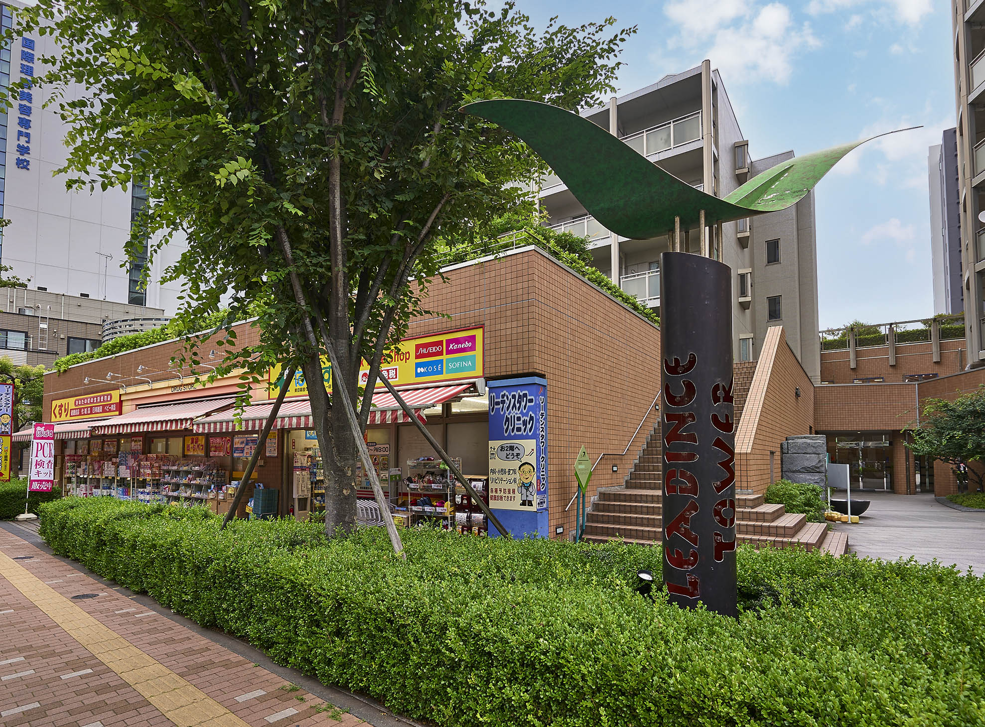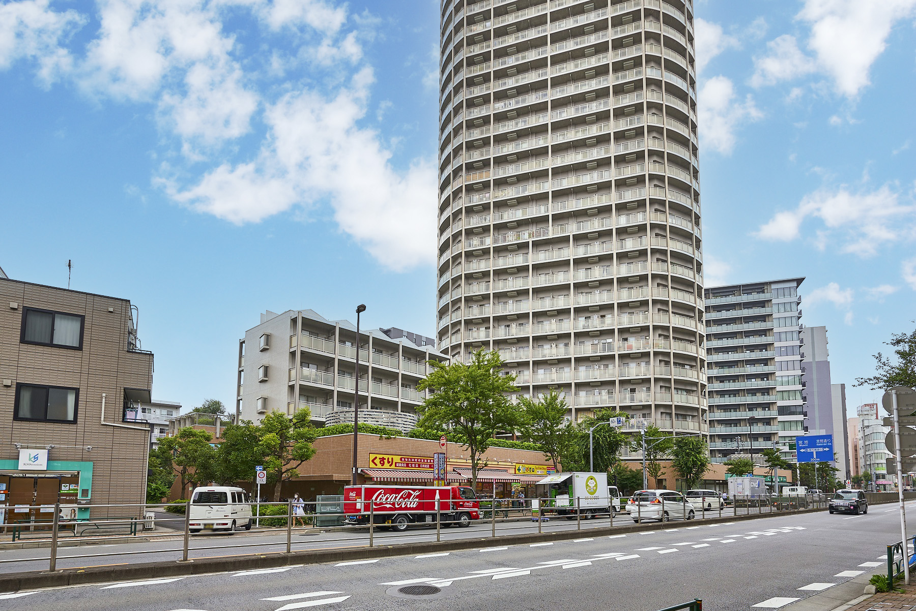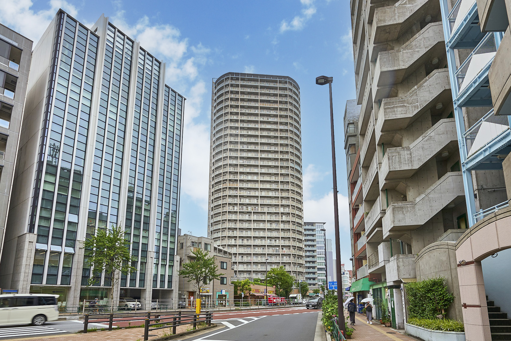 高層部は格子状を基本としながらも、単調さを排したデザインに。低層部は街並みに融け込む壁面デザインとし、低層棟の切妻屋根のスカイラインがヒューマンスケールを創出しています。低層部は巨木の根に近い幹として周囲の豊かな緑の中にどっしりと根を下ろし、中層部は上部を支える力強い巨木の幹となり、そして、高層部は軽やかに風にそよぐ緑をイメージした外観デザインです。