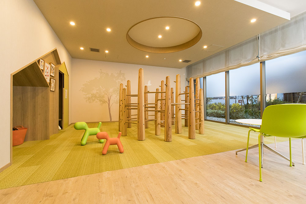 まるで内部空間に創られた公園。遊び心のあるスツールや道具を備え、子どもたちの好奇心を刺激します。同世代の友だちと出会い、さまざまな遊びを楽しむ子どもたち。それを見守る大人たちがくつろげるスペースもご用意しました。